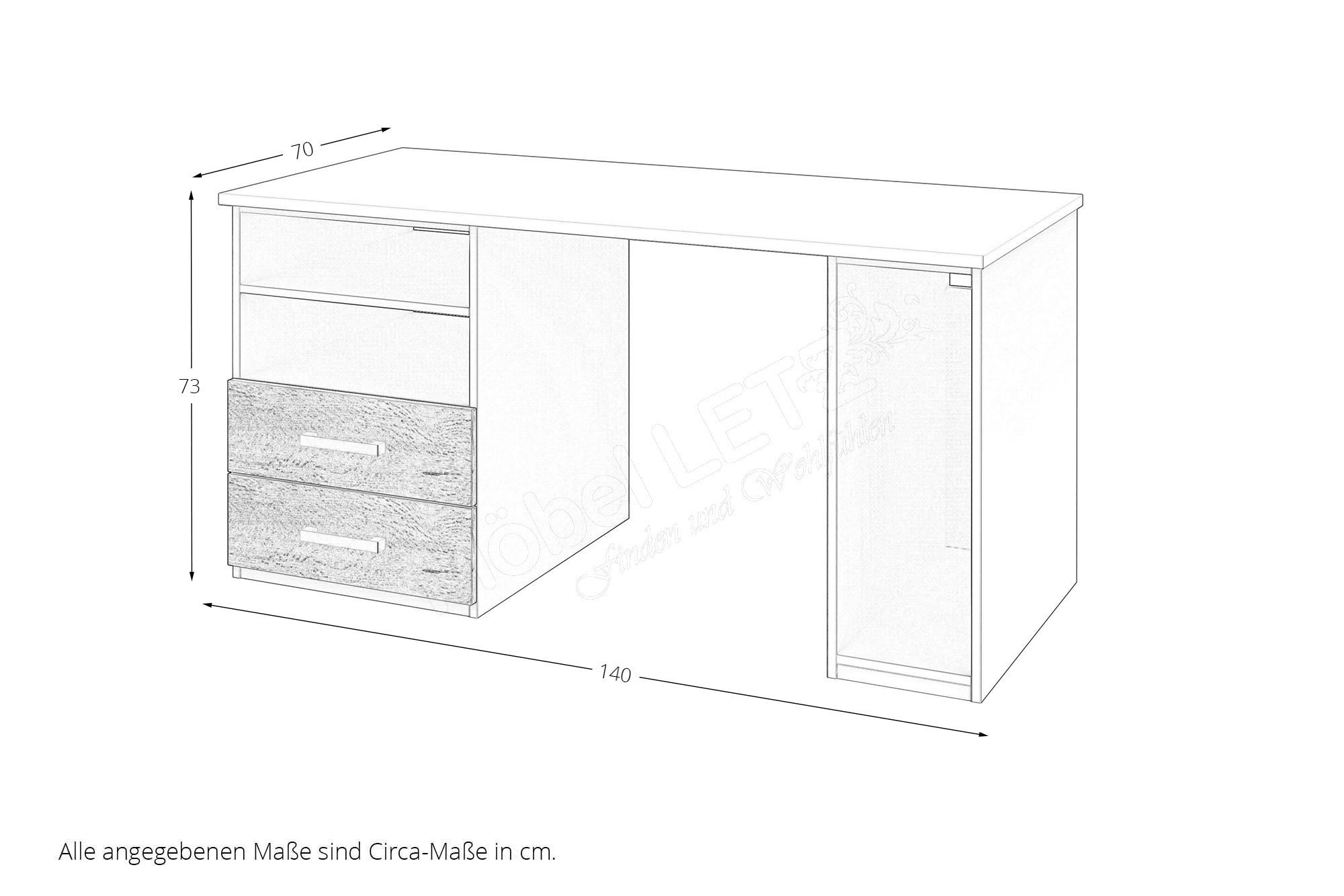 - PC-Schreibtisch: 1 Container links mit 2 offenen Fächern und 2 Schubkästen, 1 Container rechts für PC-Tower