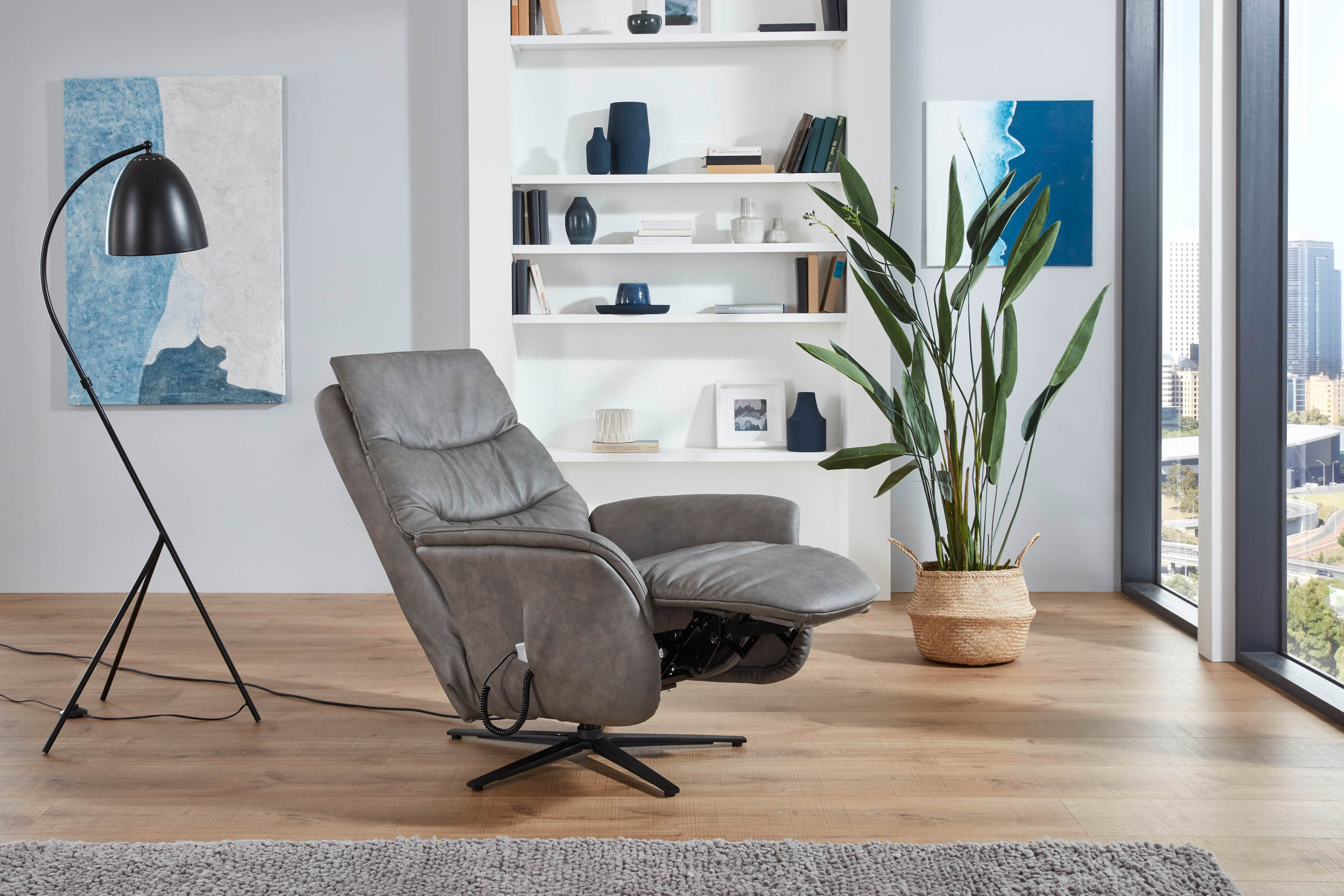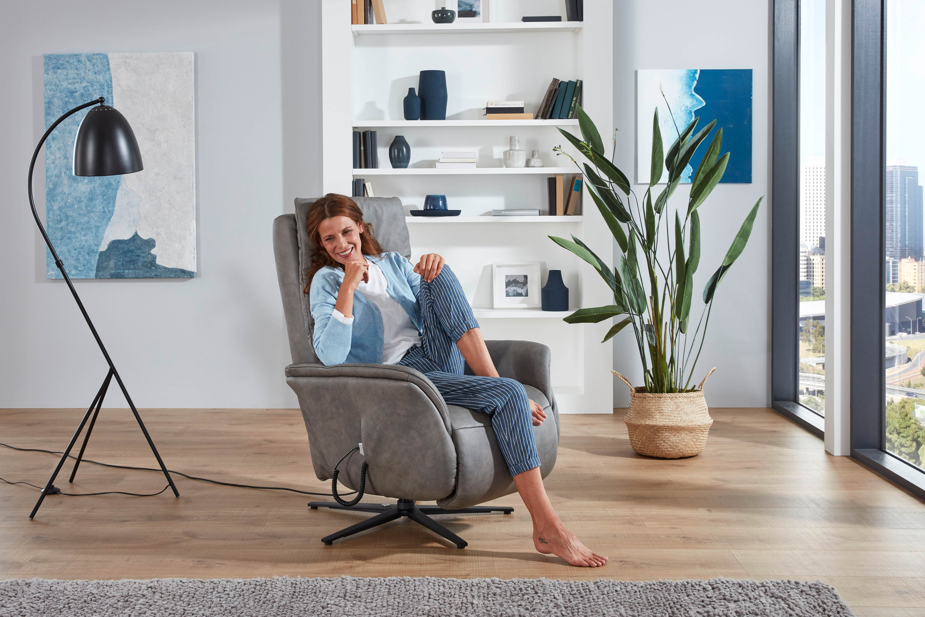 Optimale Entspannung garantiert Ihnen der formschöne Relaxsessel 7091 aus dem Hause Himolla Polstermöbel. Auf dem Modell aus der EASYSWING-Kollektion relaxen Sie in aufrechter Sitzhaltung oder in einer bequemen Liegeposition. Abschalten nach einem anstrengenden Arbeitstag, die Lieblingssendung schauen, ein spannendes Buch lesen oder ein erholsames Mittagsschläfchen halten - hier ist alles möglich. In einem hochwertigen, grauen Echtleder bezogen sowie auf einem anthrazitfarbenen Metallsternfuß stehend, lässt er sich mühelos in Ihr bestehendes Wohnambiente einfügen und macht als Solitärmöbel ebenso eine gute Figur wie als Ergänzung zu einer Himolla Polstergarnitur. Wählen Sie aus drei Superlastic-Formschaum-Polsterungen die für Sie angenehmste und genießen Sie einen Sitzkomfort, der den höchsten Ansprüchen gerecht wird. Zudem verfügt der TV-Sessel über eine 2-motorige Relaxfunktion, bei der sich Rücken und Fußteil getrennt voneinander per Handschalter in die gewünschte Relaxhaltung bringen lassen, was gemütliche Augenblicke garantiert, sowie über eine High-Tech-Massagefunktion. Diese bietet Ihnen fünf manuelle Massageprogramme, von Streichen, über Klopfen und Kneten bis hin zur Dehnung der Lendenwirbelsäule, sieben automatische Programme sowie fünf wählbare Intensitätsstufen. Mit diesem formschönen Funktionssessel bringen Sie den Wohlfühlkomfort auf ein neues Level. Lassen Sie es sich gut gehen mit 7091 von Himolla.