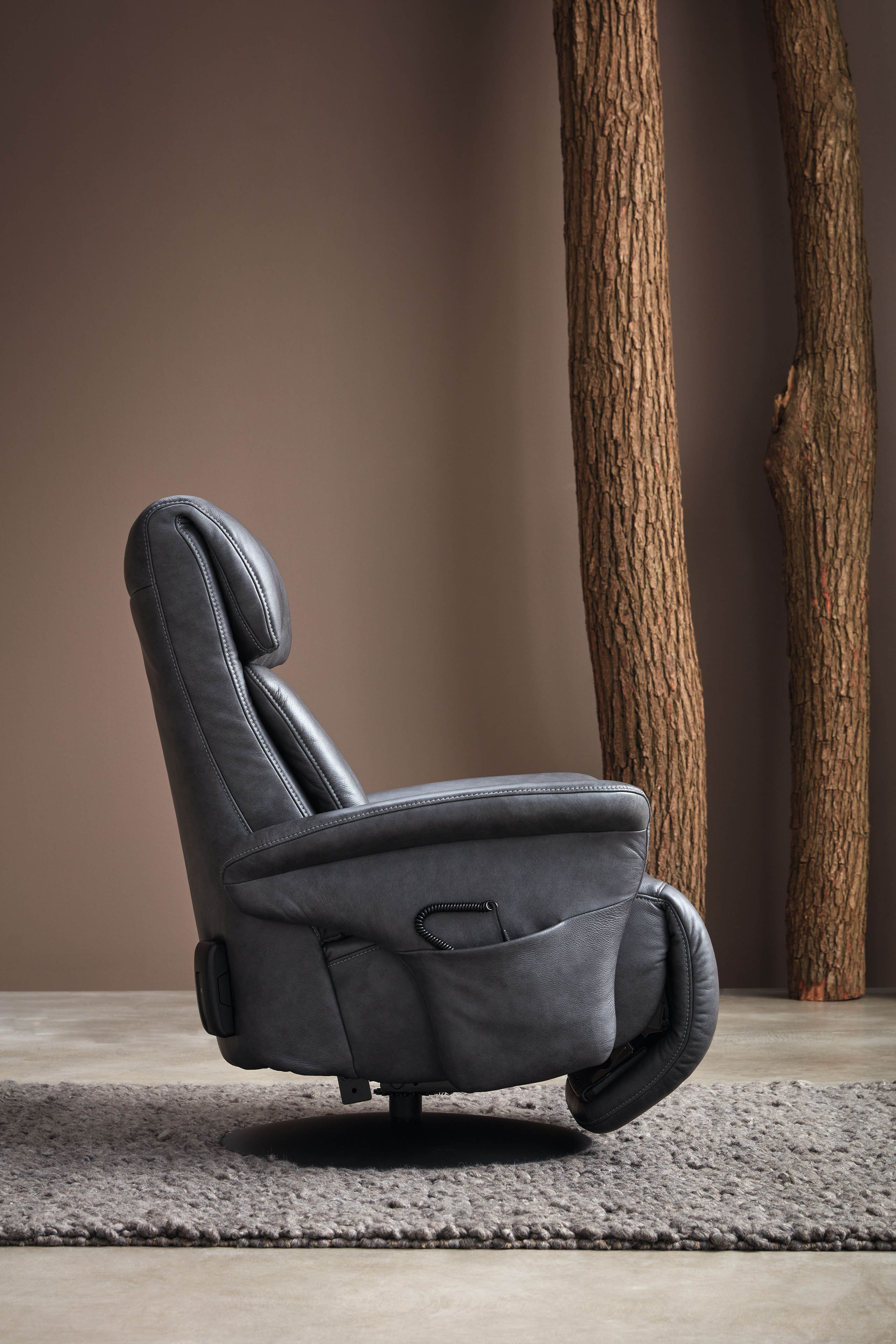 Endlich ein Relaxsessel, der perfekt auf Sie zugeschnitten ist. Das Modell 7727 von Himolla Polstermöbel passt sich Ihnen mit verschiedenen Ergonomiegrößen und drei wählbaren Sitzhärten optimal an. Unterschiedliche Fußvarianten sowie hochwertige Bezugsmaterialien, von Microfaser, über Flachgewebe bis hin zu Echtleder in den schönsten Farben runden das Angebot ab und geben Ihnen die Möglichkeit, das Design Ihres neuen Wohlfühlmöbels frei zu gestalten. Das angenehm weiche Echtleder im dunklen Grauton unterstreicht die moderne Note des Sessels und vermittelt pure Eleganz. Ausgestattet ist der Himolla TV-Sessel in der Grundversion mit einer manuellen Relaxfunktion, die den Rücken sowie das Fußteil durch leichten Körperdruck und mittels Gasdruckfeder in die gewünschte Liegeposition befördert. Wahlweise gibt es die Relaxfunktion auch motorisch - hier wird die Verstellung von Rücken und Fußteil mit einem einfachen Knopfdruck per Handschalter bewirkt. Das Kopfteil gibt Ihnen nicht nur zusätzlichen Halt, es stellt sich durch die integrierte Verstellung beim Ausspannen, Lesen und Fernsehen auf Ihre Wünsche ein. Relaxen Sie auf erholsame Art - 7727 von Himolla.