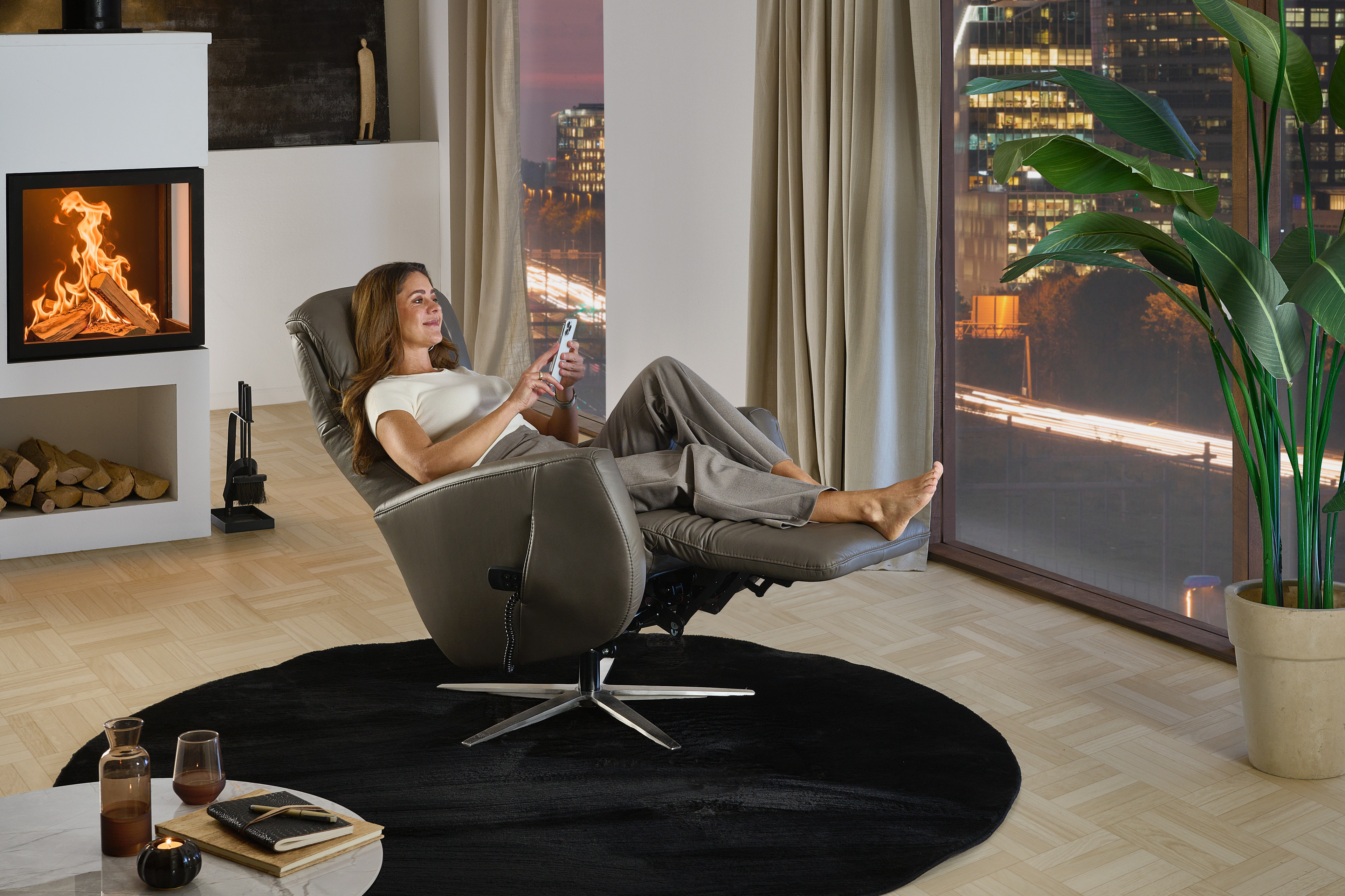 Individuelle Verstellung der Beinauflage und Rückenlehne durch zwei Elektro-Motoren, inklusive Aufstehhilfe.