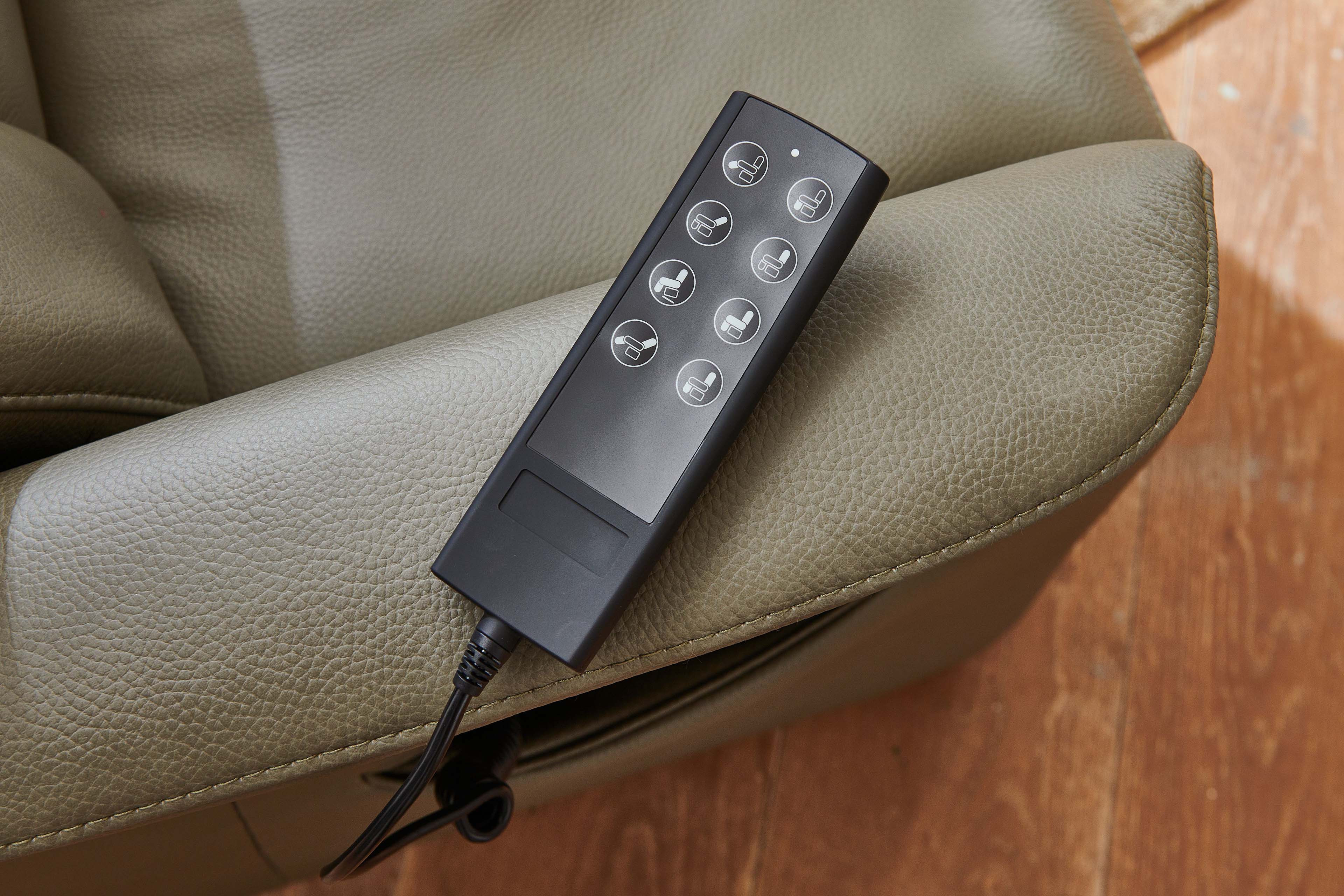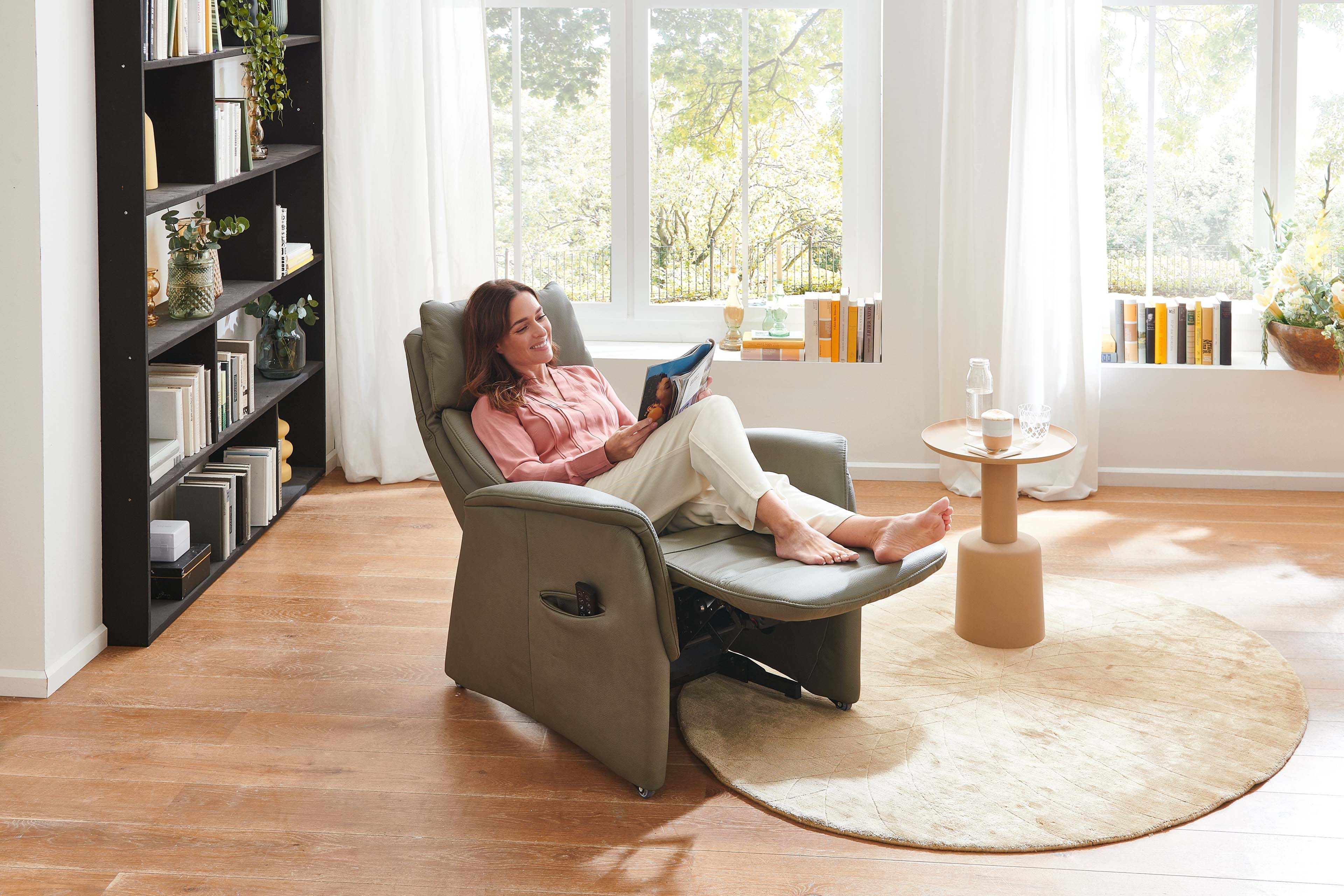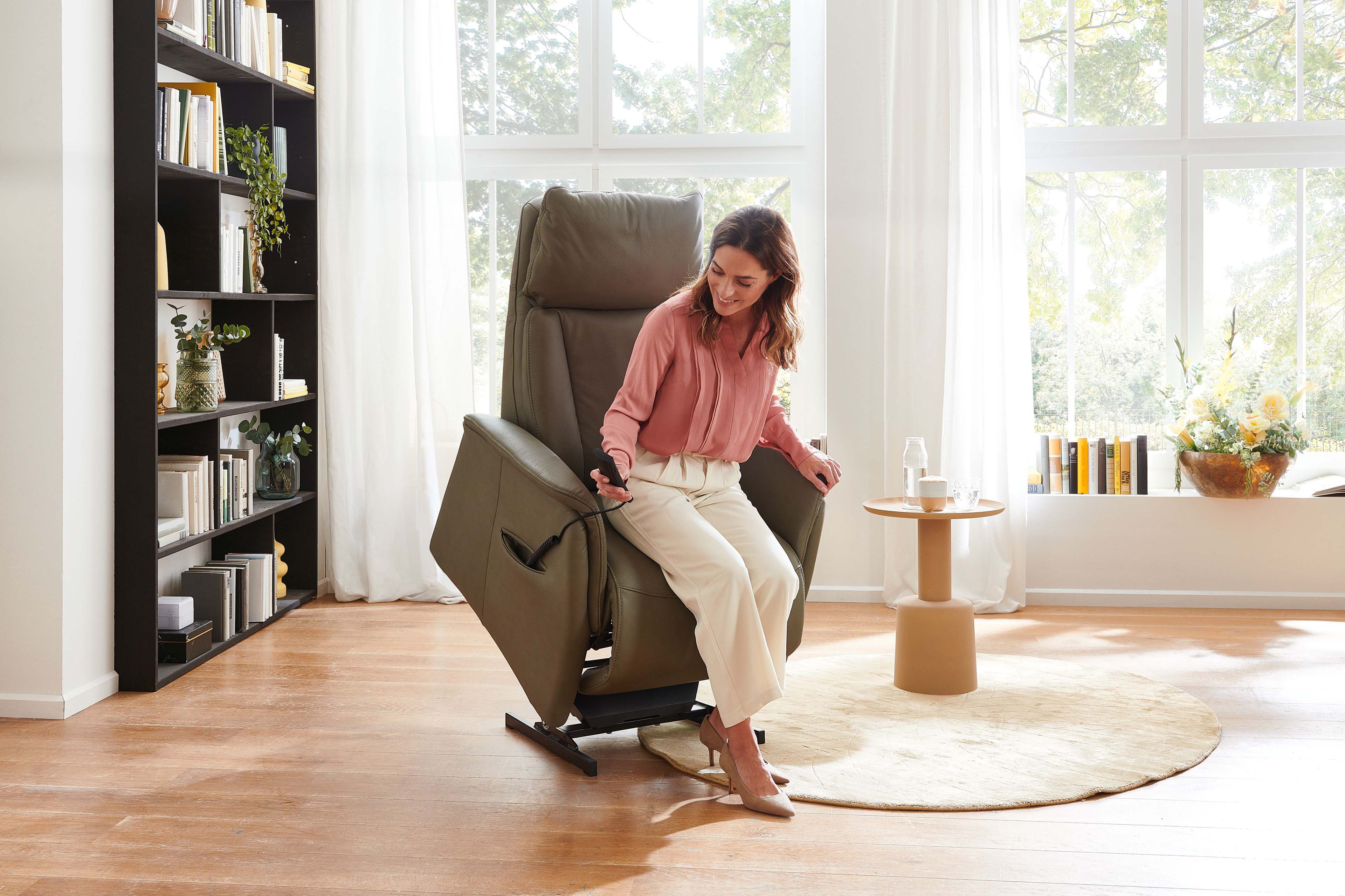 Synchrone Verstellung der Beinauflage und Rückenlehne durch ein Elektro-Motor ohne Relaxposition, inklusive Aufstehhilfe.
