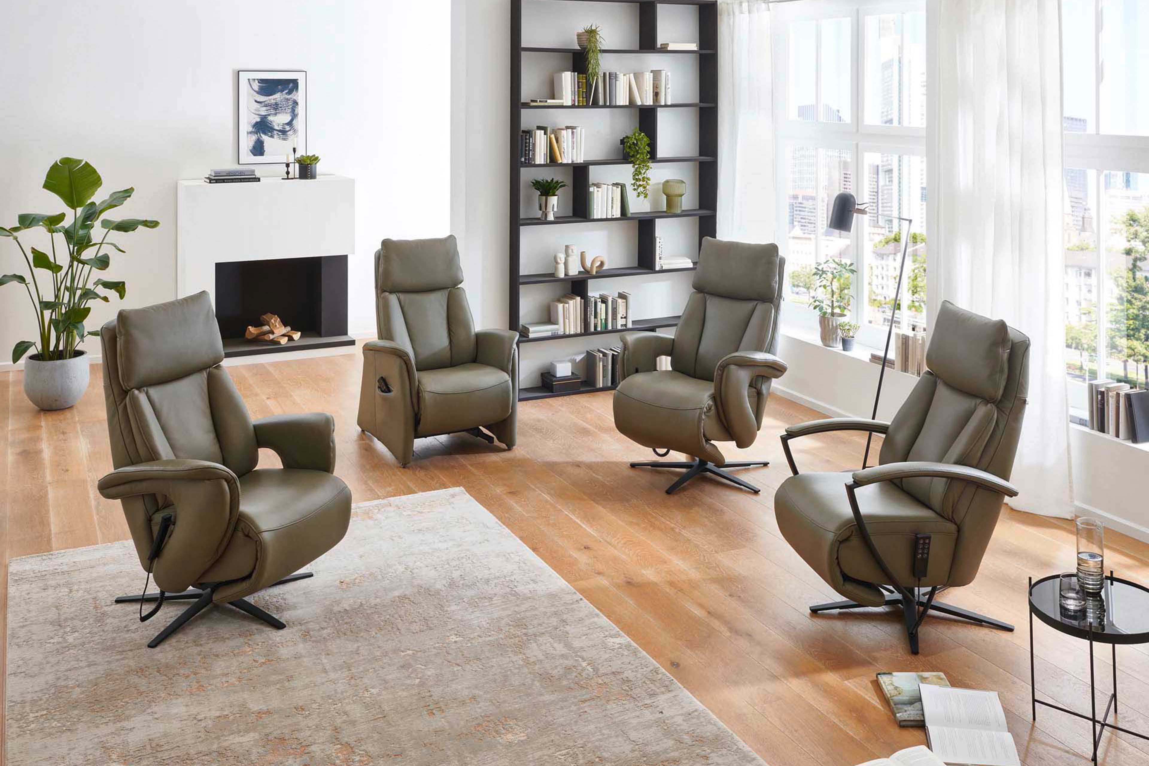 Holen Sie sich mit diesem Hukla Ruhesessel ein Möbelstück in Ihr Zuhause, welches schon beim ersten Anblick Geborgenheit vermittelt, zum Wohlfühlen einlädt und mit einem attraktiven Design jeden Raum zum Leuchten bringt - Modell HU-EC22138. In diesem Angebot präsentiert sich der Relaxsessel in einem Lederoutfit in der Farbe "olive" sowie stehend auf praktischen Rollfüßen, wodurch ein besonders elegantes Erscheinungsbild entsteht, welches alle Blicke auf sich zieht. Schon beim ersten Platznehmen spüren Sie ein außergewöhnliches Sitzgefühl, ausgelöst von einer hochwertigen Polsterung aus einem Formkaltschaum auf stützenden Stahlwellenfedern. Dank dieses bezaubernden Komforts wird der Solist garantiert zu Ihrem neuen Lieblingsplatz, an dem Sie sich entspannt zurücklehnen, dem ganzen Alltagsstress entfliehen und in einem spannenden Roman eintauchen können. In der Grundversion ist das Polstermöbel mit einer manuellen Verstellung der Fußstütze, Rückenlehne sowie des Kopfteils ausgestattet, sodass Sie die Möglichkeit bekommen, jeden Moment im Liegen zu genießen. Auf Wunsch lässt sich HU-EC22138 mit einer 1-, 2- oder 3-motorigen Funktion ausrüsten, wodurch Sie Ihre Lieblingsposition mittels eines Handschalters finden. Diese können Sie über unsere Zusatzoptionen hinzubuchen, wo Sie ebenfalls zwischen weiteren Fußausführungen, Armlehnen, Sitzhärten und Ergonomiegrößen entscheiden können. Zudem erhalten Sie mit einem Klick auf den Button "Farbe ändern" eine umfangreiche Stoff- sowie Lederkollektion mit tollen, verschiedenen Farbnuancen. So können Sie das Bezugskleid ganz nach Ihren Vorstellungen und Ihrem Einrichtungsstil anpassen. Verleihen Sie Ihrem Wohnraum mit dem Sessel HU-EC22138 von Hukla ein stilvolles Upgrade und erleben Sie zukünftig ruhige sowie erholsame Augenblicke.