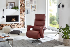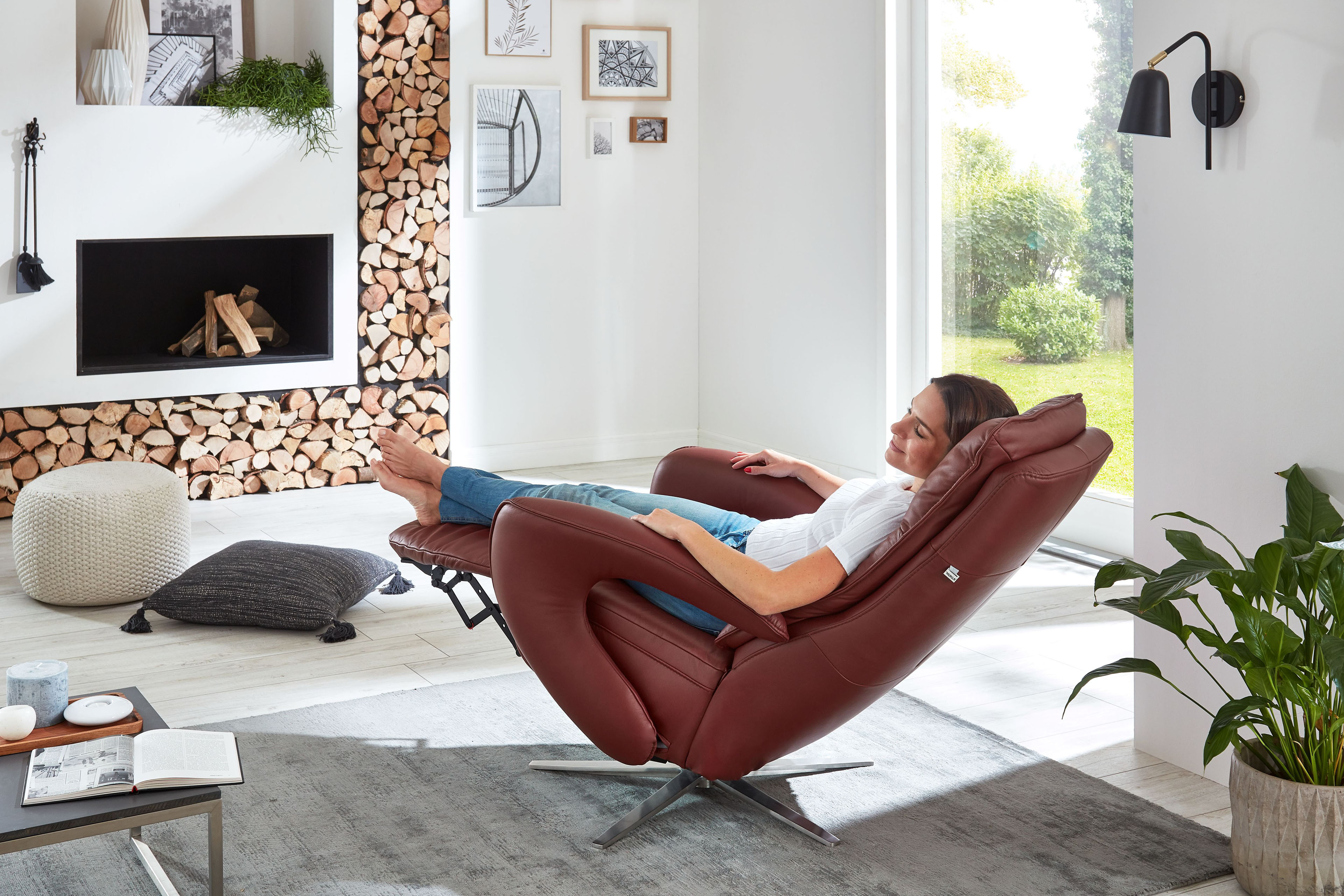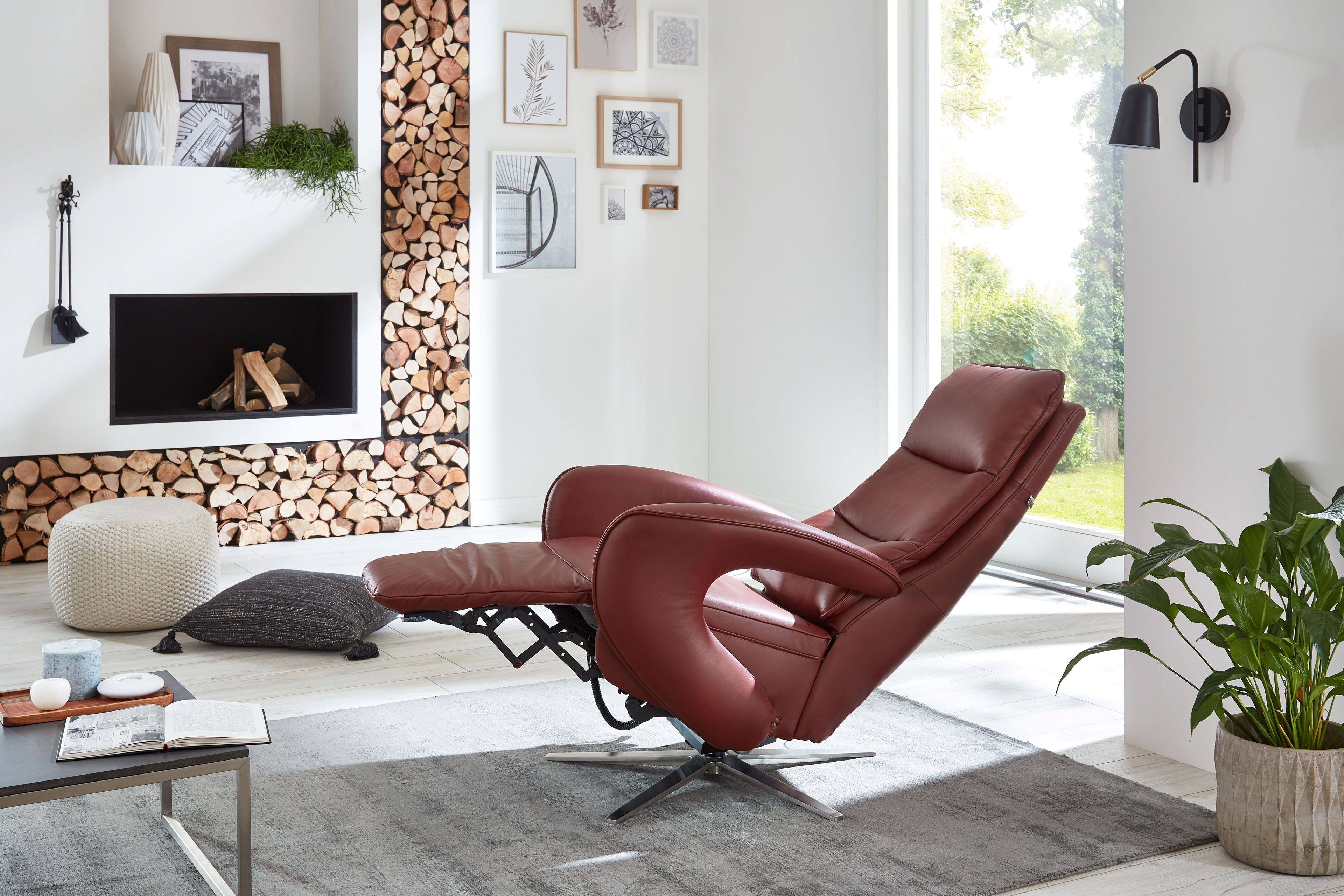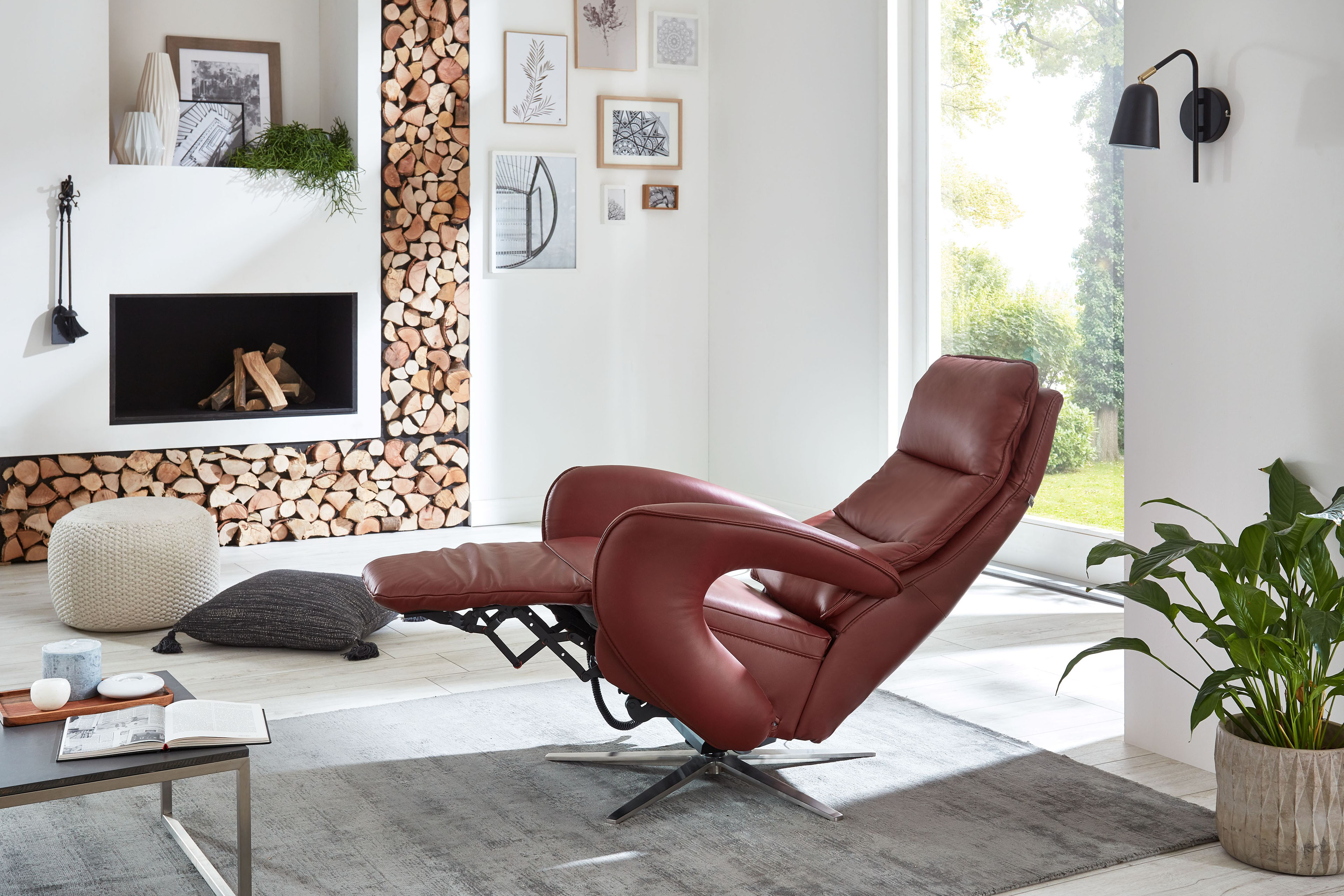 Der Relaxsessel HU-ER19145 aus dem Hause Hukla strahlt Eleganz und Wohlgefühl aus. Durch sein rotes Ledergewand sowie den sternförmigen, schwarzen Metallfuß wirkt er edel, verleiht jedem Raum “das gewisse Etwas“ und lädt schon nach dem ersten Blick zu einer Sitzprobe ein. Doch nicht nur das Erscheinungsbild des TV-Sessels überzeugt, weiterhin punktet er mit seiner bequemen, hochwertigen Formkaltschaum-Polsterung, der integrierten, manuellen Relaxfunktion sowie der Kopfteilverstellung. Dank dieser Kombination lässt sich die ideale Entspannungsposition finden. Wird, nach Betätigen des Feststellhebels, leichter Körperdruck gegen die Rückenlehne ausgeübt, hebt sich das Fußteil, wodurch sich parallel dazu die Rückenlehne senkt. So entspannt liegend wird es Ihnen nicht schwerfallen, den Moment in vollen Zügen zu genießen. Ob Sie sich nun eine spannende Lektüre zu Gemüte führen oder Ihre Lieblingsserie schauen, der Solist wird Ihnen stets ein treuer Begleiter sein. Und sollte Ihnen mal nicht nach der Liegeposition, mit einer Gesamtlänge von etwa 175 cm, sein, behalten Sie, dank des Drehfußes, einen praktischen Rundumblick. Soll es ein anderes Bezugskleid sein? Kein Problem! Klicken Sie auf “Farbe ändern“ und eine Palette der schönsten Farben sowie Bezüge wird Ihnen offeriert. Wählen Sie das für Sie passende Outfit für Ihren neuen Lieblingsplatz. Mit HU-ER19145 von Hukla ziehen Gemütlichkeit und Luxus in Ihr Zuhause ein.
