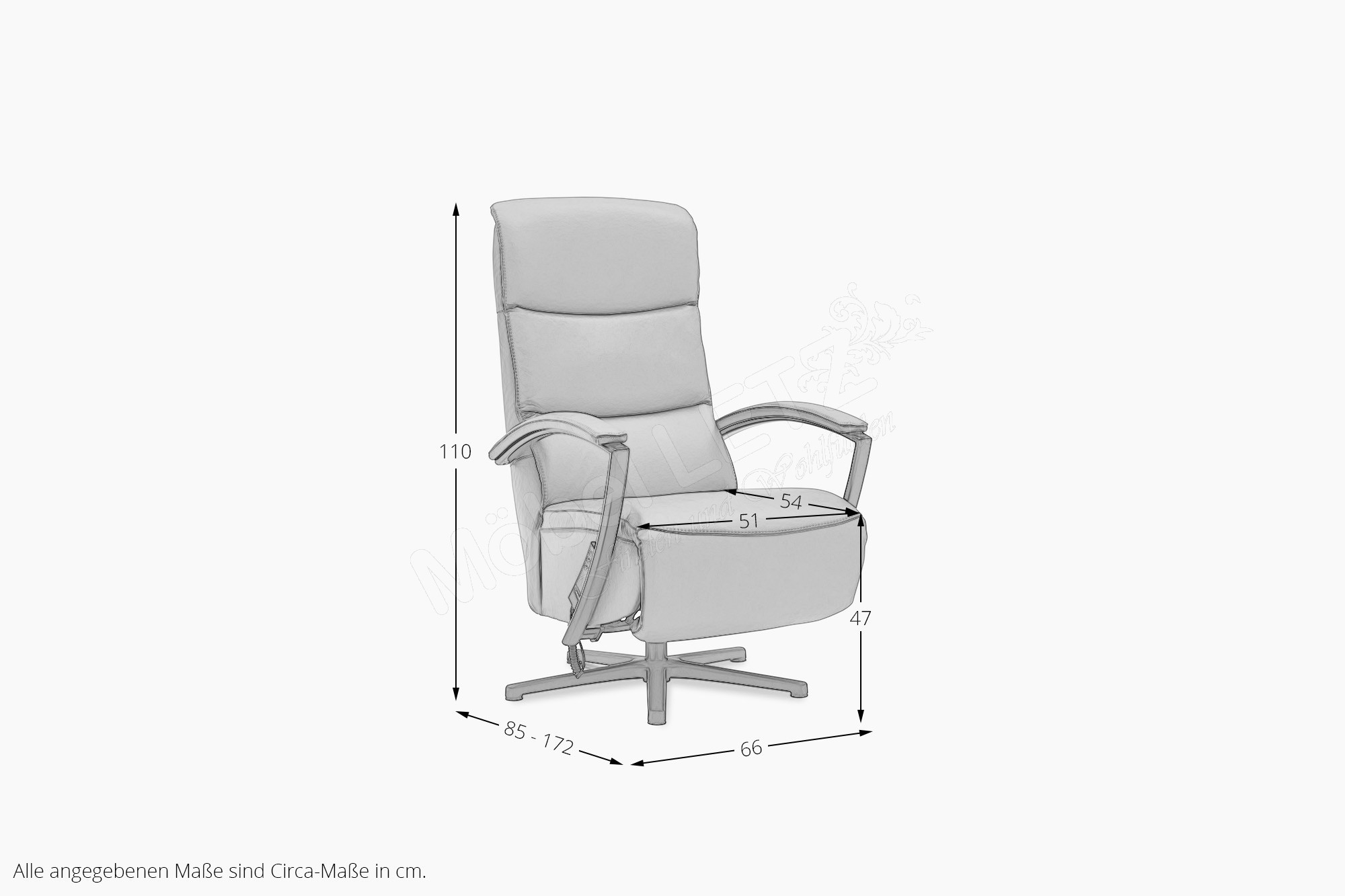 Sitzhöhe ca. 47 cm, Sitztiefe ca. 54 cm, Rückenhöhe ca. 110 cm, Liegelänge ca. 172 cm
