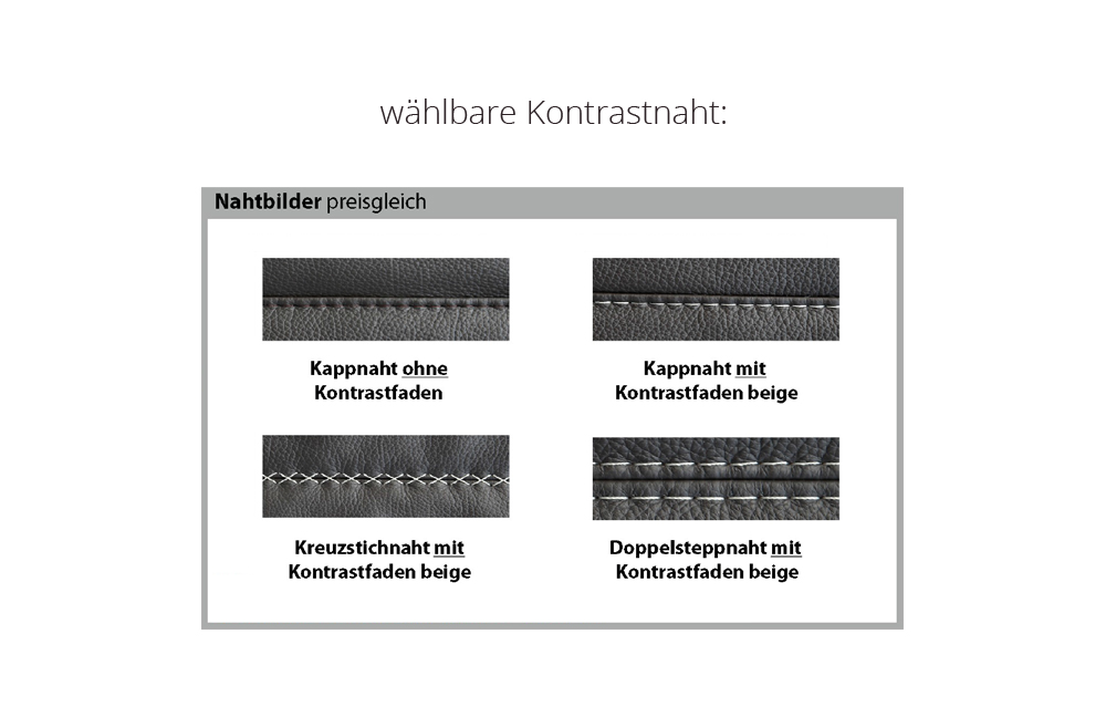 Die Nahtverarbeitung oder Notwendigkeit zusätzlicher Nähte kann im Vergleich zwischen der Stoff-/Lederausführung unterschiedlich ausfallen.