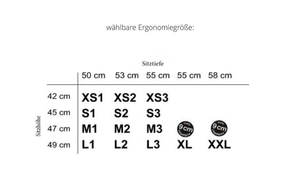 Die Gesamthöhe ist abhängig von der gewählten Ergonomiegröße. Höhe ca. 106 - 114 cm