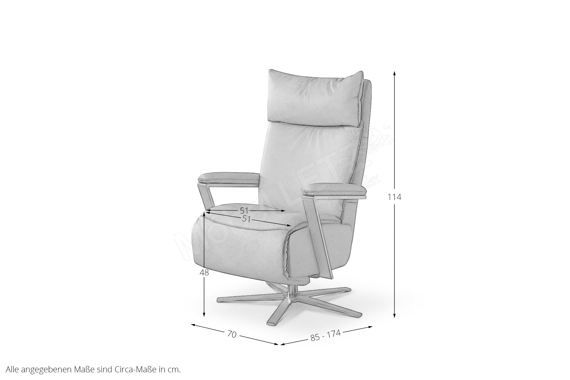 Herausgeputzt für den großen Auftritt in Ihrem Zuhause präsentiert sich der Relaxsessel Connection 3 Lazyline aus dem Hause Polsteria als stilvolles Komfortmöbelstück. Der elegante Lederbezug in Kombination mit dem glänzenden Chrom Sternfuß fügt sich das Möbelstück harmonisch in jedes Interieur ein und verleiht Ihrem Wohnraum eine moderne Note. Nehmen Sie Platz auf der angenehm weichen Polsterung aus PUR-Schaum oder wahlweise aus Federkern und genießen Sie pure Entspannung. Dank der integrierten Verstellfunktion für Rückenlehne sowie Fußstütze passen Sie den Sessel ganz einfach Ihren Bedürfnissen an. Über einen innenliegenden Bedienhebel und leichten Körperdruck lässt sich die Rückenlehne stufenlos von der Sitz- bis zur bequemen Liegeposition mit einer Länge von ca. 174 cm verstellen. Auch das Kopfteil kann mithilfe eines Rasterbeschlags individuell justiert werden. Für zusätzlichen Komfort stehen Ihnen verschiedene Ergonomiegrößen, Fuß- und Armlehnenvarianten sowie praktische Funktionen zur Auswahl. Besonders hervorzuheben ist die optionale 3-motorische Herz-Waage-Position. In dieser Stellung liegen Ihre Füße höher als das Herz, wodurch Kreislauf sowie Durchblutung unterstützt werden und der Körper optimal entlastet wird. Ergänzend dazu können Sie den Polsteria TV-Sessel mit einer komfortablen Aufstehhilfe oder mit einem luxuriösen Massagesystem ausstatten. Ob zum Abschalten, Träumen oder entspannten Ausklingen des Arbeitstages - erleben Sie die besondere Wohlfühlatmosphäre dieses Sessels. Setzen Sie ein zeitloses Statement in Ihrem Zuhause oder kombinieren Sie ihn zu einer modernen Wohnlandschaft. Machen Sie es sich bequem - mit dem Connection 3 Lazyline von Polsteria.