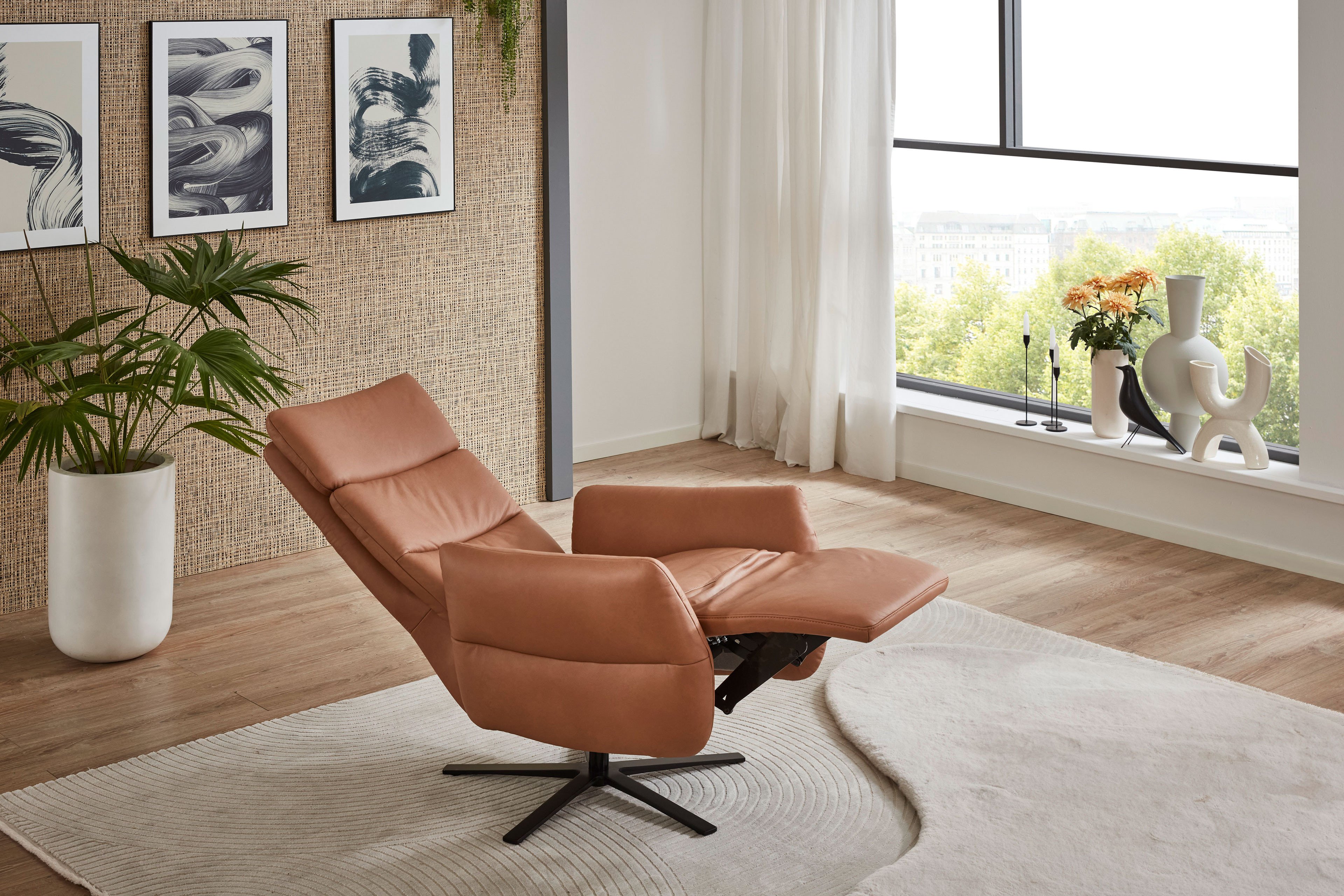 Lehnen Sie sich zurück, atmen Sie aus und vergessen Sie für einen Moment alles um sich herum - mit dem TV-Sessel Manu-Lazyline aus dem renommierten Hause Polsteria. Dieser Relaxsessel ist kein gewöhnliches Möbelstück - es ist Ihr persönlicher Rückzugsort. Ein Ort, an dem aus Alltag echte Erholung wird. Mit seinem cognacfarbenen Echtlederbezug zieht er sofort alle Blicke auf sich und verleiht Ihrem Heim eine moderne, stilvolle Note mit Charakter. Doch der richtige Zauber beginnt erst, sobald Sie Platz nehmen: Neben einer grandiosen Auswahl an Ergonomiegrößen ist die Sitzfläche im Grundangebot mit einer PUR-Schaum Polsterung versehen. Diese können Sie optional auch gerne gegen eine Polsterung aus Federkern tauschen. Zudem kommt Manu-Lazyline mit einer inkludierten manuellen Relaxfunktion daher. Mittels innenliegendem Bedienhebel und leichtem Körperdruck können Sie die Rückenlehne, in Kombination mit dem Fußteil, bis zur Liegeposition verstellen. Das ist aber noch nicht alles: Neben der manuellen Relaxverstellung kann die Kopfstütze individuell durch einen Rasterbeschlag mit Rückholfeder perfekt an Ihre Sitzposition verstellt werden. Wir haben Sie noch nicht ganz überzeugt? Dann schauen Sie doch gerne mal in unsere Zusatzoptionen oder in den dazugehörigen Typenplan. Dort finden Sie neben weiteren Fußausführungen auch die Option, den Drehsessel mit einer praktischen Herz-Waage-Position oder mit einer Aufstehhilfe auszustatten. Stabil, hochwertig verarbeitet und gemacht für viele Jahre voller Lieblingsmomente - das ist Manu-Lazyline von Polsteria. Setzen Sie sich, lehnen Sie sich zurück und bleiben Sie einfach noch ein bisschen länger.