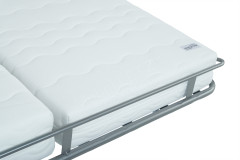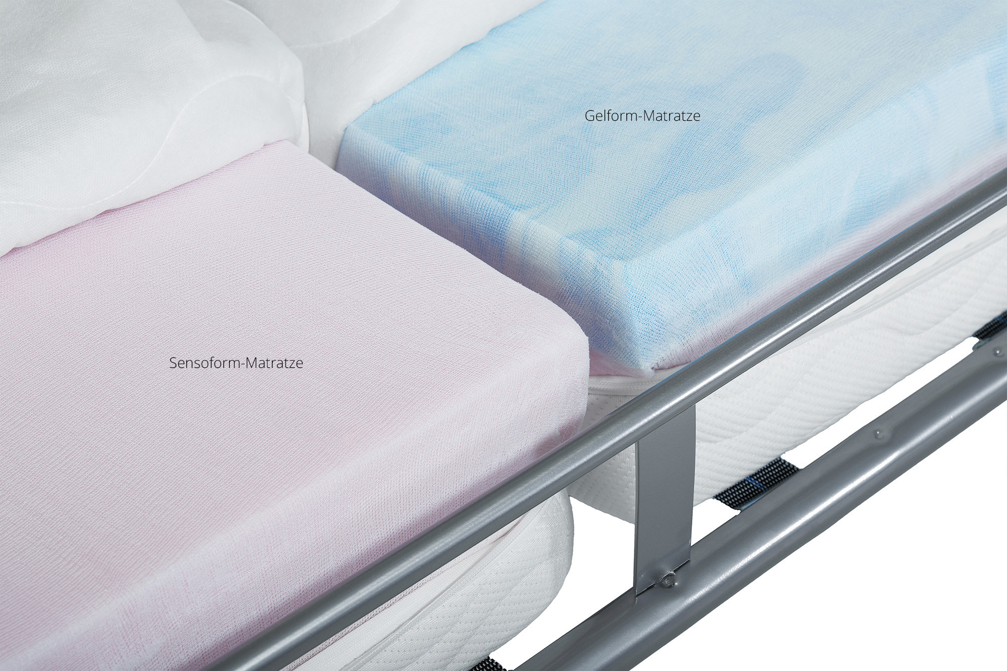 - Liegefläche: 7-Zonen-Sensoform-Matratze (Kern: Comfortschaum) und 7-Zonen-Geform-Wendematratze mit einer weichen und einer festen Liegeseite (Kern: Gelschaum → weich + Kaltschaum → fest) auf einem zweigeteiltem Lattenrost