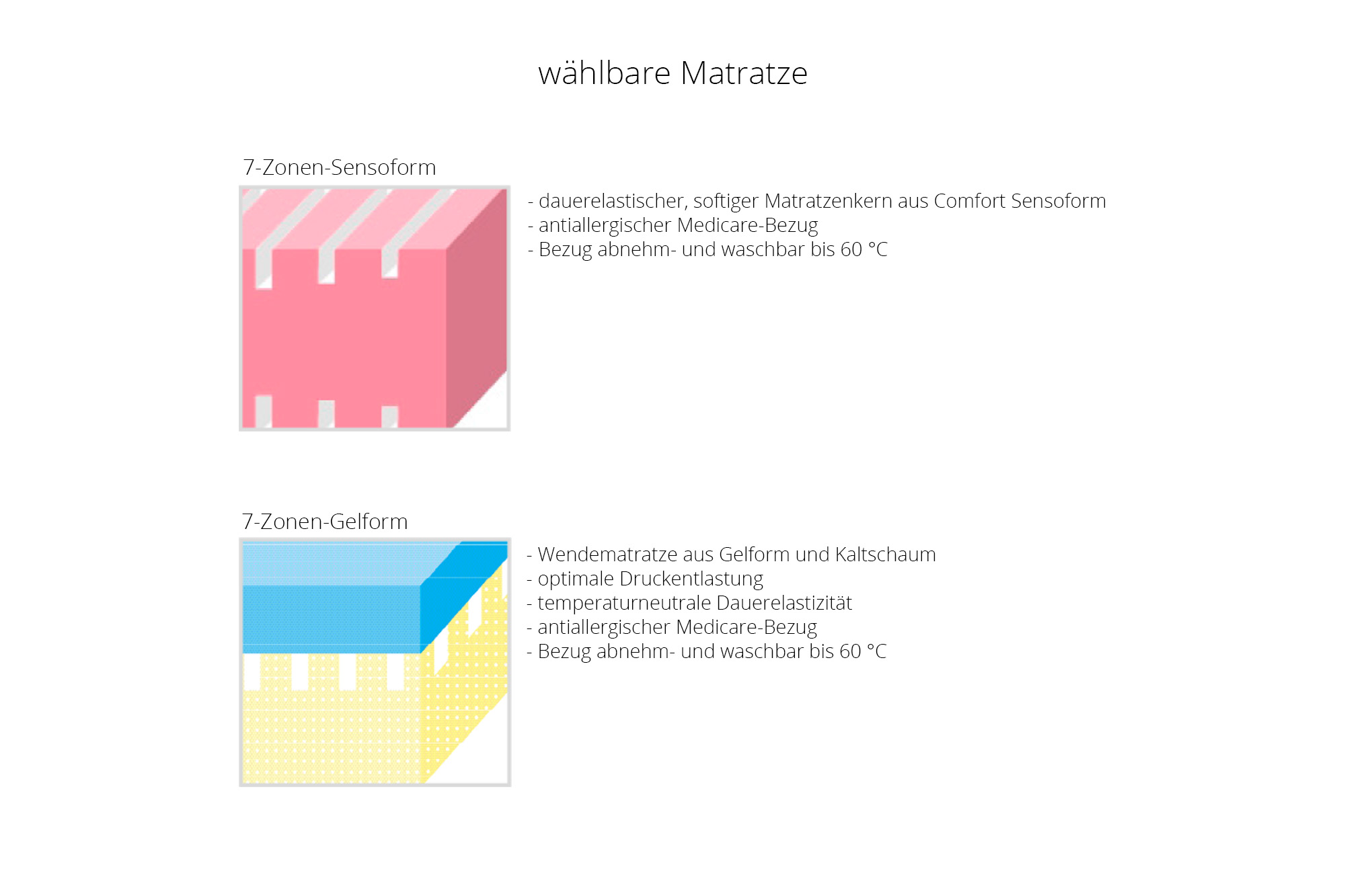 - Liegefläche: 7-Zonen-Sensoform auf einem zweigeteiltem Lattenrost