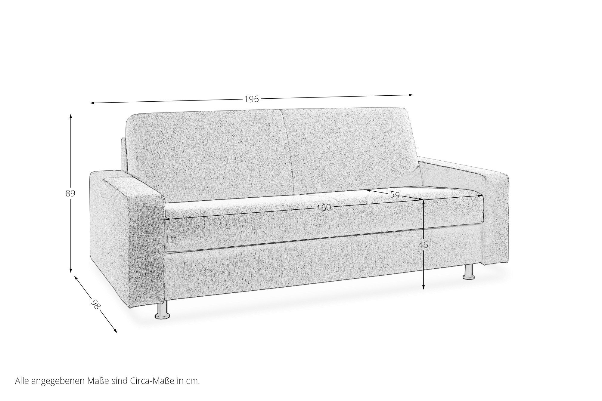 Hinweis! Die Breite ist ohne Armlehnen angegeben. Für die Gesamtbreite müssen die Maße der gewählten Armlehnen hinzugerechnet werden.