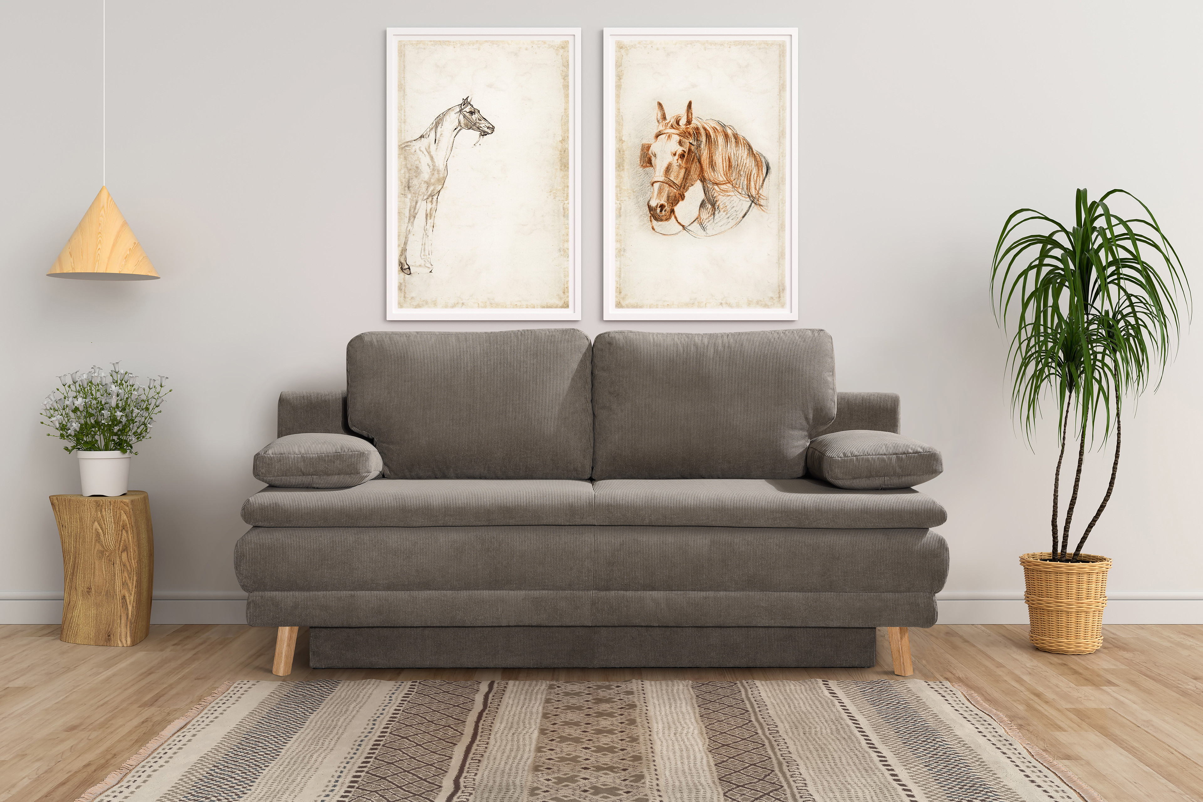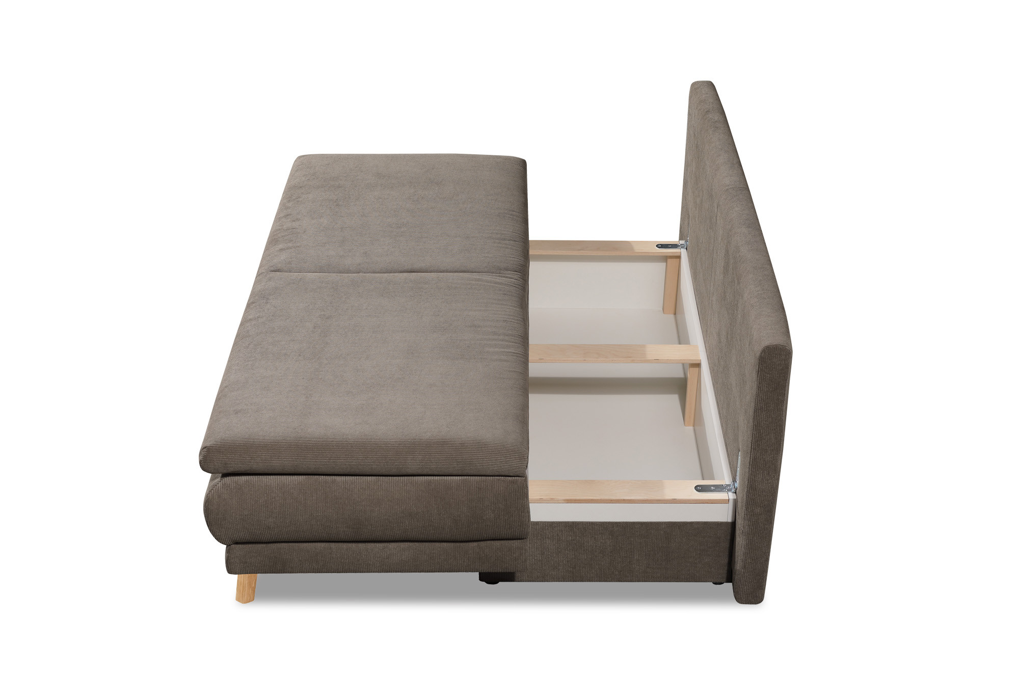 Multifunktionalität ist in einer kleinen Wohnung, einem WG- oder Jugendzimmer unentbehrlich – genauso wie die platzsparende Gestaltung und der gehobene Wohnkomfort. Für diese knifflige Aufgabe qualifiziert sich das Schlafsofa Boyd von Restyl, denn es erfüllt mehrere Aufgaben zugleich und tritt als flexibles Möbelstück auf. Seine Doppelfunktion beeindruckt einfach jeden und gibt Ihnen die Möglichkeit, Gäste jederzeit zu beherbergen und alles Wichtige in unmittelbarer Nähe zu verstauen. Zum einen entsteht durch Vorziehen der Sitzfläche, Herunterklappen des Rückenteils und aufklappen des Toppers eine komfortable Liegefläche von ca. 140 x 194 cm, die Ihrem Besuch eine unvergesslich gemütliche und erholsame Nacht verschafft. Zum anderen versteckt sich im Korpus des Schlafsofas der integrierte Bettkasten, welcher durch das Hervorziehen der Sitzfläche einfach und schnell erreichbar ist und praktische Utensilien platzsparend verstaut. Dank der Federkern-Polsterung mit Polyschaum und Wattevlies steht der Gemütlichkeit nichts mehr im Wege und Sie können Ihre Freizeit auf dem Sofa genießen. Zurücklehnen und entspannen - mit dem Schlafsofa von Restyl.