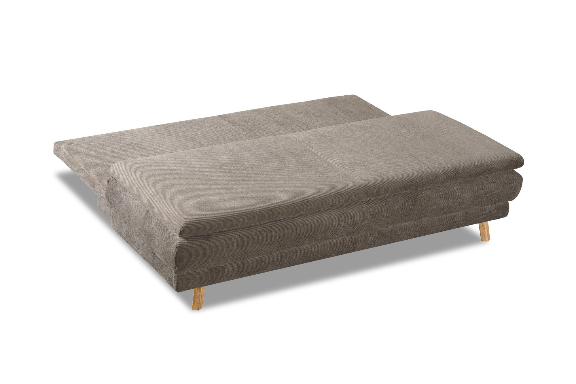 Durch Vorziehen der Sitzfläche und Herunterklappen des Rückenteils entsteht eine Doppelliege. Der Wendetopper muss nach hinten geschlagen werden, damit eine durchgehende Liegefläche entsteht. Die komplette Liegefläche ist mit Matratzendrell bezogen. - Fußausführung: Holzfuß Eiche natur