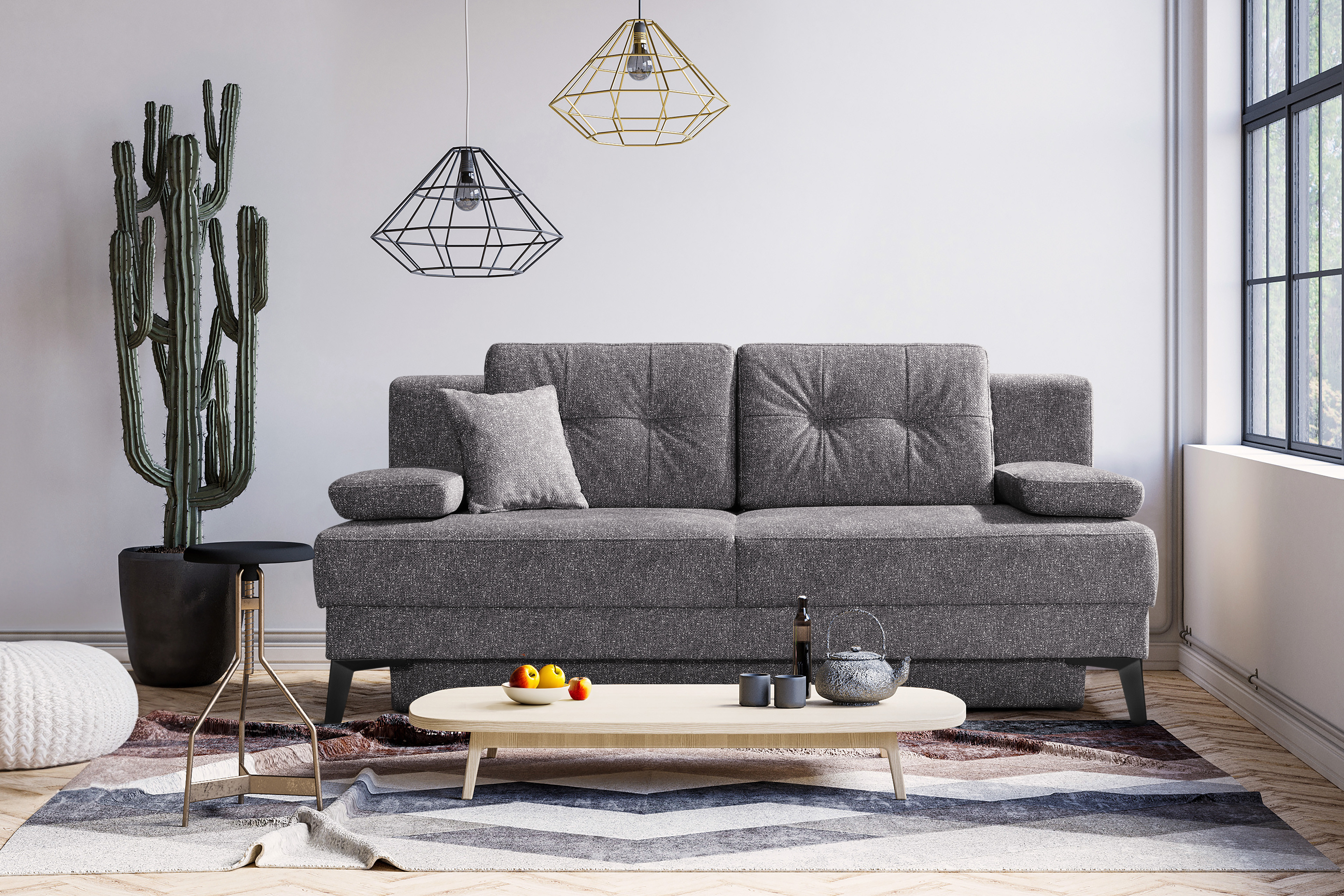 Mit diesem Schlafsofa setzen Sie ein echtes Statement - ob im Eingangsbereich, Gäste- oder Wohnzimmer, Fanny-Sleep von Restyl schenkt jedem Raum eine völlig neue Atmosphäre. Das moderne Schlafsofa lässt sich hervorragend mit jeglichen Farbtönen kombinieren. Getragen von schwarzen Füßen und ausgestattet mit zwei gesteppten Rückenkissen sowie losen Armlehnenkissen, wird dieses Modell zum Must-have unter den Schlafsofas. Im Sitz und Rücken stellt es Ihnen einen bequemen Federkern mit einer Polyschaum-Polsterung bereit, wodurch es Ihnen nach einem gemütlichen Abend möglich ist, Ihren Gästen zudem eine komfortable Schlafgelegenheit anzubieten. Auf der Liegefläche von ca. 155 x 200 cm werden problemlos auch zwei Ihrer Besucher wunderschöne Träume erleben dürfen. Für die perfekte Hygiene können Sie mittels unserer Zusatzoptionen eine Schonerdecke hinzubuchen, die den Stoffbezug des Sofas schützt. Bereits inklusive ist der praktische Bettkasten unter der Sitzfläche, der zusätzlichen Stauraum schafft, um beispielsweise Bettgarnituren oder Zierkissen griffbereit zu verstauen. Schlafsofa Fanny-Sleep von Restyl – bleibt jedem in Erinnerung.