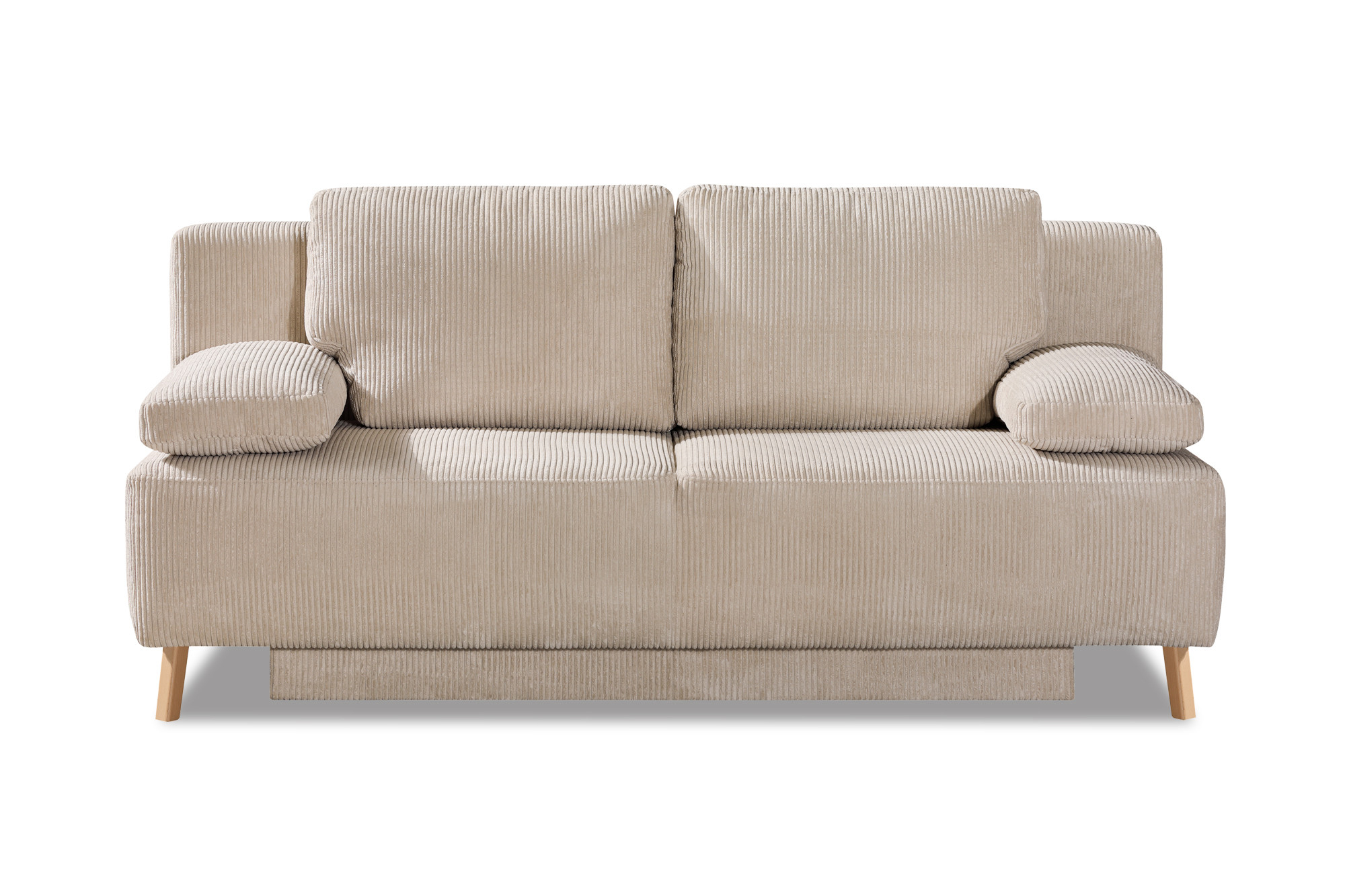 Das Schlafsofa George-Sleep von Restyl ist eine willkommene Lösung für die erste Wohnung, das Gästezimmer oder ein modernes Jugendzimmer. Im beigen Cordbezug lässt sich das Modell George-Sleep wunderbar mit bereits bestehenden Möbelstücken kombinieren oder es kann auf Wunsch mit unserer umfangreichen Farb- und Bezugskollektion auf Ihre bestehende Einrichtung abgestimmt werden. Gleichzeitig punktet das Sofa mit hohem Komfort und beeindruckender Verwandlungskunst. Nur wenige Handgriffe und der vielseitige 2-Sitzer streckt sich zu einem gemütlichen Gästebett mit einer komfortablen Liegefläche von ca. 140 x 194 cm. Der einmalige Sitz- und Liegekomfort des Schlafsofas wird durch eine hochwertige Polsterung aus Polyschaum auf Wellenfedern hervorgerufen und mit weichen Rücken- und Armlehnenkissen optimiert. Unter der Sitzfläche verbirgt sich darüber hinaus ein geräumiger Bettkasten, der für Kissen und Decken ausreichend Stauraum bereithält. Erleichtern Sie sich mit dem optional erhältlichen Hubbeschlag die Verwandlung der Couch, indem Sie diesen mit Hilfe der Zusatzoptionen hinzubuchen. Stil und Komfort rund um die Uhr – Schlafsofas von Restyl.