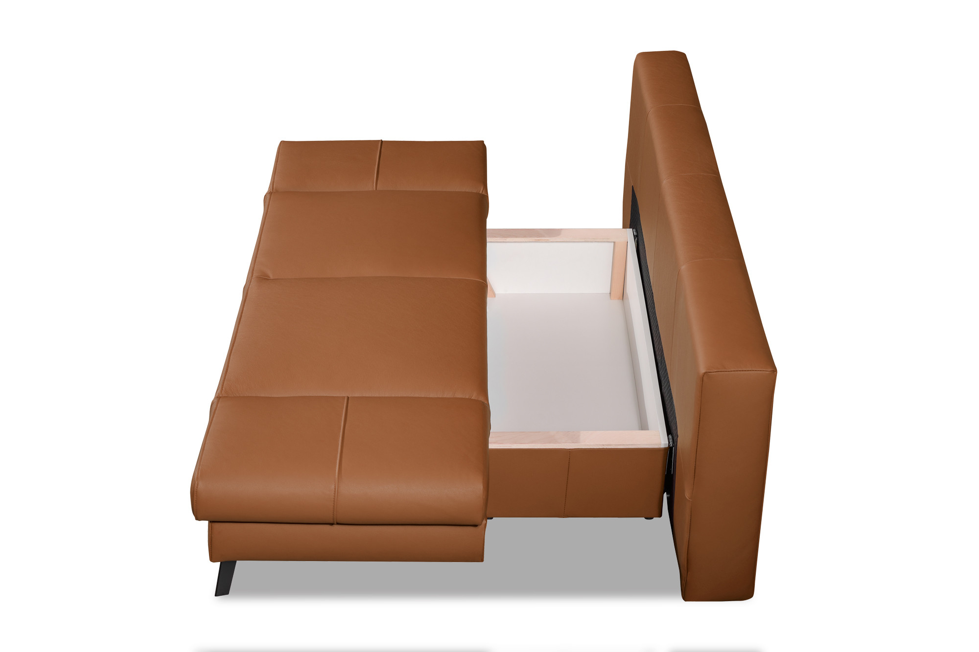Durch Vorziehen der Sitzfläche und Herunterklappen des Rückenteils entsteht eine Doppelliege. Schlafen auf Sitzhöhe. - Fußausführung: Metallfüße schwarz