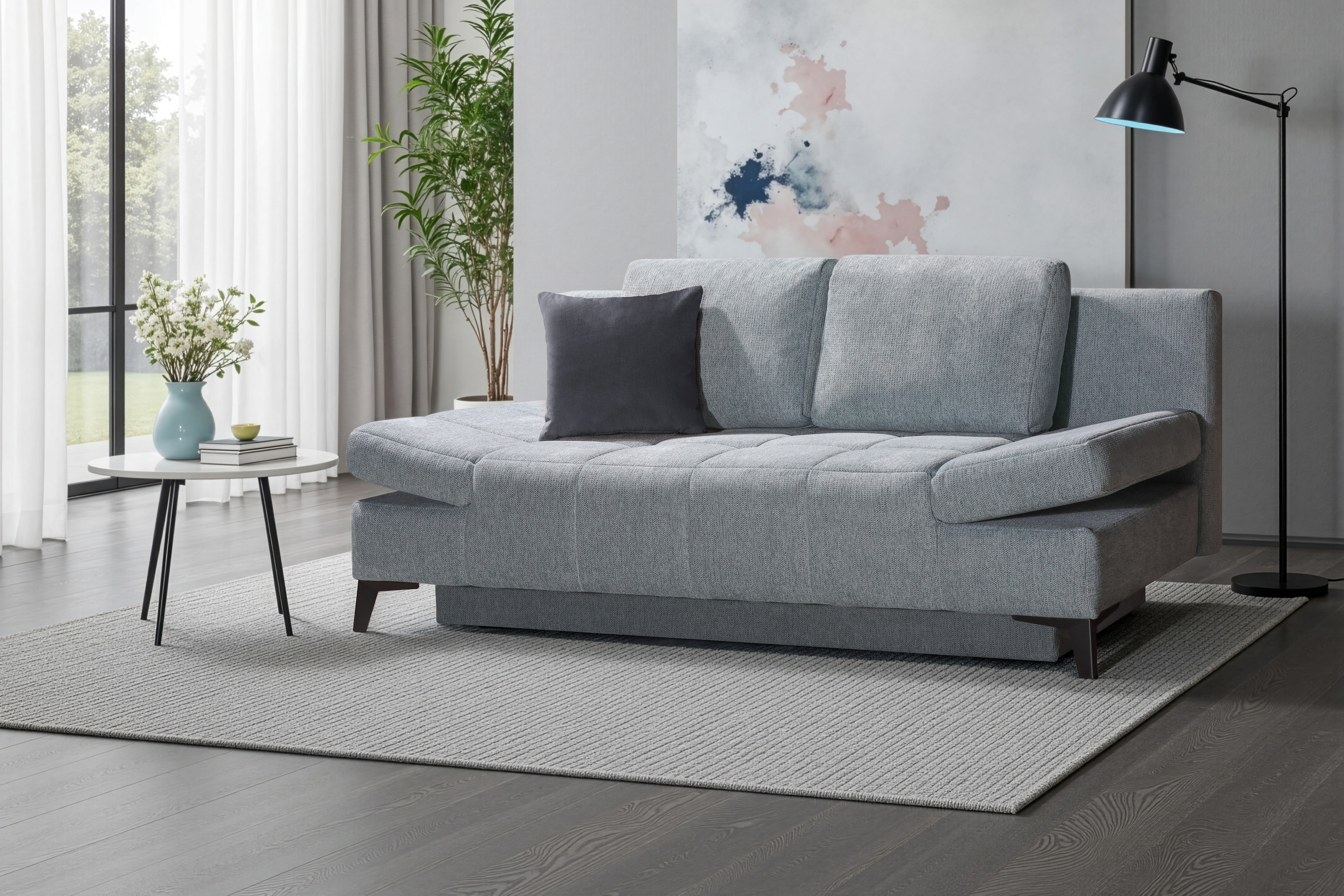 Funktionell, komfortabel und mit einem Hauch Eleganz präsentiert sich hier das Schlafsofa Tove von Restyl in einem hellblauen Chenille-Flachgewebe-Bezug. Was auf den ersten Blick einem klassischen 2-Sitzer gleichkommt, entpuppt sich bei genauerem Hinsehen als kleines Raumwunder. Dank einer integrierter Schlaffunktion, der verstellbaren Armlehnen und dem praktischen Bettkasten ist das elegante Schlafsofa individuell einsetzbar. Egal, ob als gemütliche Sitzgelegenheit, Gästebett oder Ordnungshüter - Tove sorgt für maximale Bereitschaft auf kleinsten Raum und beeindruckt nebenbei mit einem außergewöhnlich hohen Komfort. Die Federkern-Polsterung auf Wellenfedern verspricht Ihnen in Verbindung mit den verstellbaren Armlehnen ein wohltuendes Sitz- sowie Liegegefühl. Dank der großzügigen Liegefläche von ca. 150 x 200 cm haben Sie die Möglichkeit Ihren Übernachtungsgästen einen gemütlichen Schlafplatz anzubieten. Des Weiteren begeistert Tove mit einem geräumigen Bettkasten, in dem Kissen und Decken bequem verstaut werden und immer griffbereit sind. Entscheiden Sie sich für einen Verwandlungskünstler der besonderen Art - Restyl Schlafsofa.