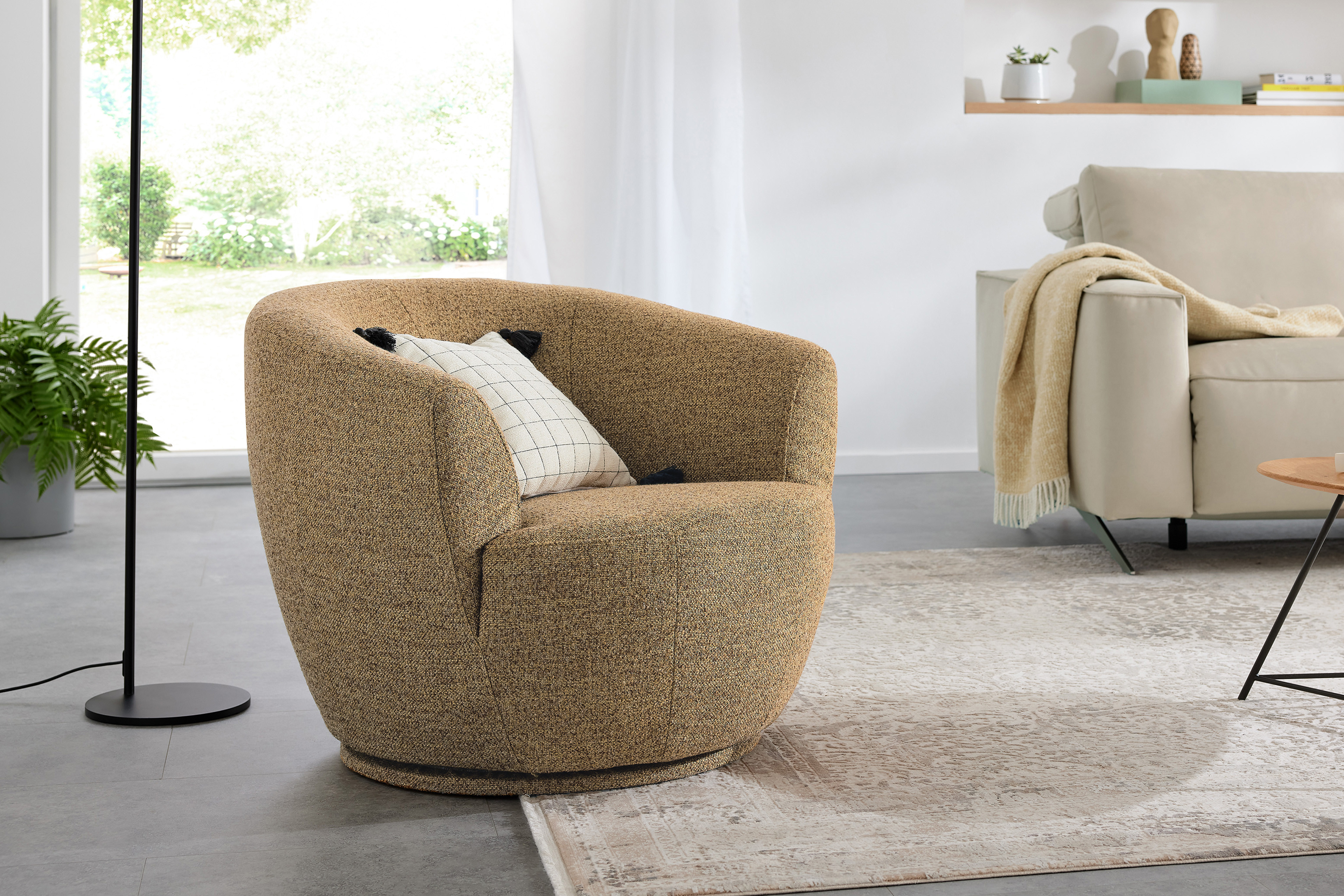 Ob als Solist in der Leseecke oder stilvoller Blickfang im Wohnzimmer - der charmante Einzelsessel MR 9455 von Musterring fügt sich mühelos in fast jeden Wohnbereich ein und wird schnell zu Ihrem neuen Lieblingsplatz. Mit seinem eleganten Stoffgewand in einem warmen Farbton sowie seiner sanft gerundeten Silhouette strahlt dieses Möbelstück nicht nur absolute Behaglichkeit und Ruhe aus, sondern bereichert Ihr Zuhause ebenfalls mit zeitloser Eleganz. Das Design wirkt mit dem Drehtellerfuß, welcher in Bezug auf den Sessel angepasst wurde, besonders klar und harmonisch, wodurch ein stimmiges sowie modernes Gesamtbild entsteht. Die sorgfältig abgestimmte Polsterung aus Polyätherschäumen sowie einem HR-Schaum vermittelt schon beim ersten Platznehmen ein Gefühl von Geborgenheit und schenkt Ihnen ein angenehmes Sitzempfinden, sodass Sie Ihre gemütlichen Lesestunden oder Filmabende genießen können. Ein besonderes Highlight ist die 360-Grad-Drehfunktion: Dank dieser Ausstattung passt sich der Musterring Sessel an jede Situation an und wird zum idealen Begleiter im Alltag. Sollte Ihnen das Bouclé-Outfit in der Farbe "camel" nicht gefallen, finden Sie unter der Rubrik "Wunschbezug - Farbe ändern" eine große Auswahl an diversen Bezugsmaterialien mit hellen sowie dunklen oder dezenten und kräftigen Farbnuancen. Der Drehsessel MR 9455 von Musterring passt sich perfekt Ihren Bedürfnissen an und ist eine Einladung zum Entspannen sowie Wohlfühlen.