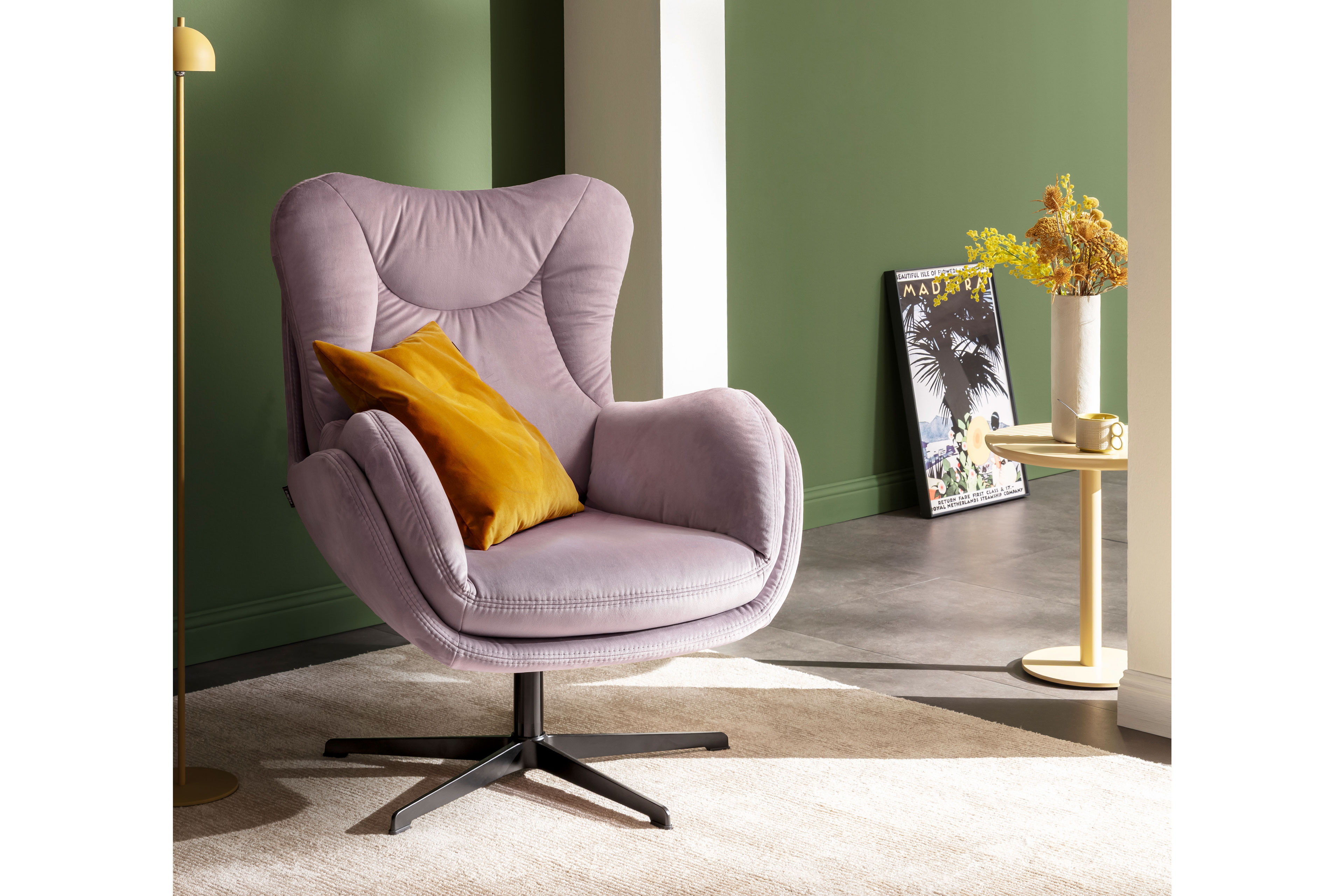 Wie ein stilles Plätzchen im Wald, fernab vom Trubel, lädt dieser Sessel zum Innehalten und Träumen ein. Mit seinen sanften Linien und dem modernen Design bringt der Polstersessel Kiko von SCHÖNER WOHNEN Ruhe sowie Gemütlichkeit direkt in Ihr Zuhause. Dieses Schmuckstück präsentiert sich in einem fliederfarbenen Flockstoff und einem stilvollen Sternfuß in matt schwarzer Ausführung. Die hochwertige Polsterung, bestehend aus einem Kaltschaum im Sitzbereich und einer PUR-Schaum-Polsterung im Rückenbereich, sorgt für ein angenehmes Sitzgefühl über längere Zeit hinweg, ob beim Lesen Ihres Lieblingsbuches oder einfach nur beim Entspannen. Dank der Kategorie Wunschbezug können Sie unter "Farbe ändern" nicht nur die Stofffarbe des SCHÖNER WOHNEN Sessels abändern, sondern Sie haben gleichzeitig auch die Möglichkeit, die Sitzschale von außen sowie von innen in unterschiedlichen Tönen oder Materialien zu hüllen. Zusätzlich bieten wir Ihnen die Option, den Polsterhocker in unseren Zusatzoptionen einfach mitzubestellen. In dieser Kombination ist das Set der absolute Wohlfühlbegleiter, der all den Stress Ihres Alltags an Ihnen vorbeiziehen lässt. Mit seiner sanften 360° Drehfunktion ist der Kiko Lehnsessel ein absolutes Must-have für Ihren Wohnbereich - ein Ort zum Durchatmen.