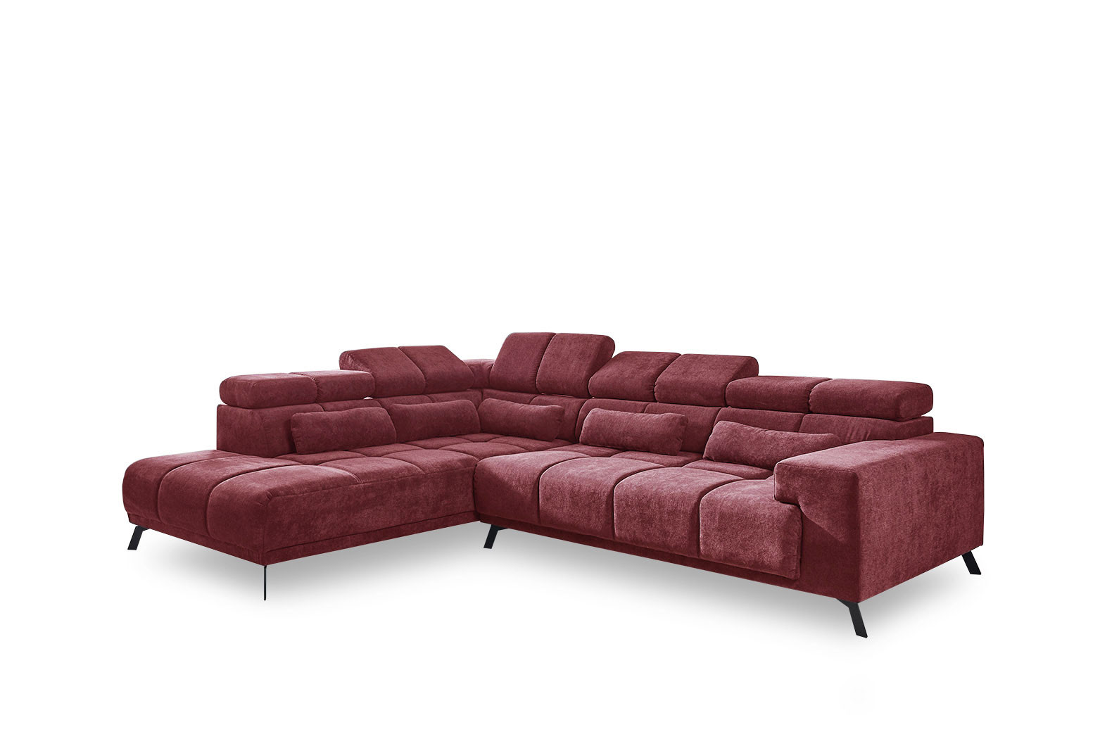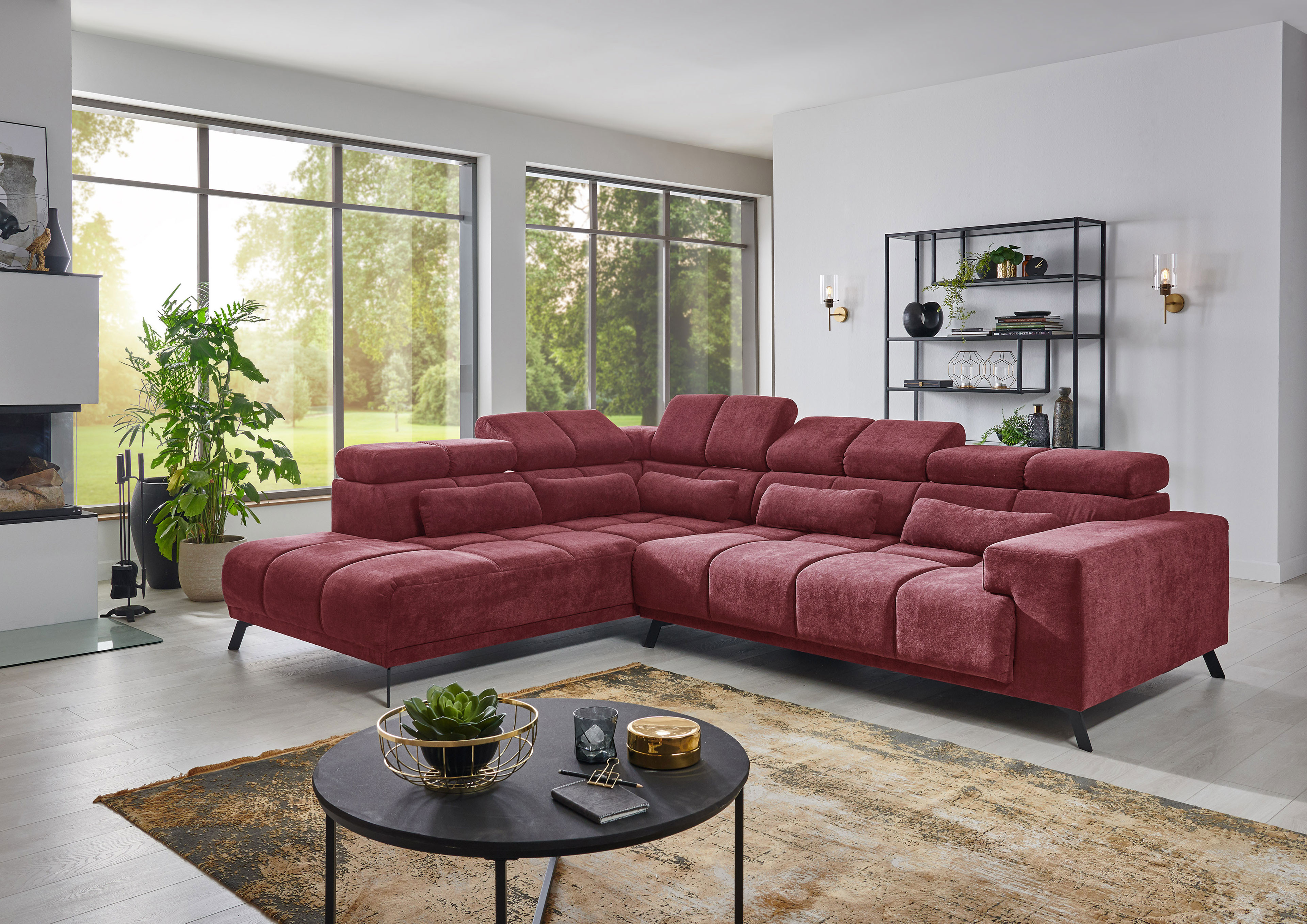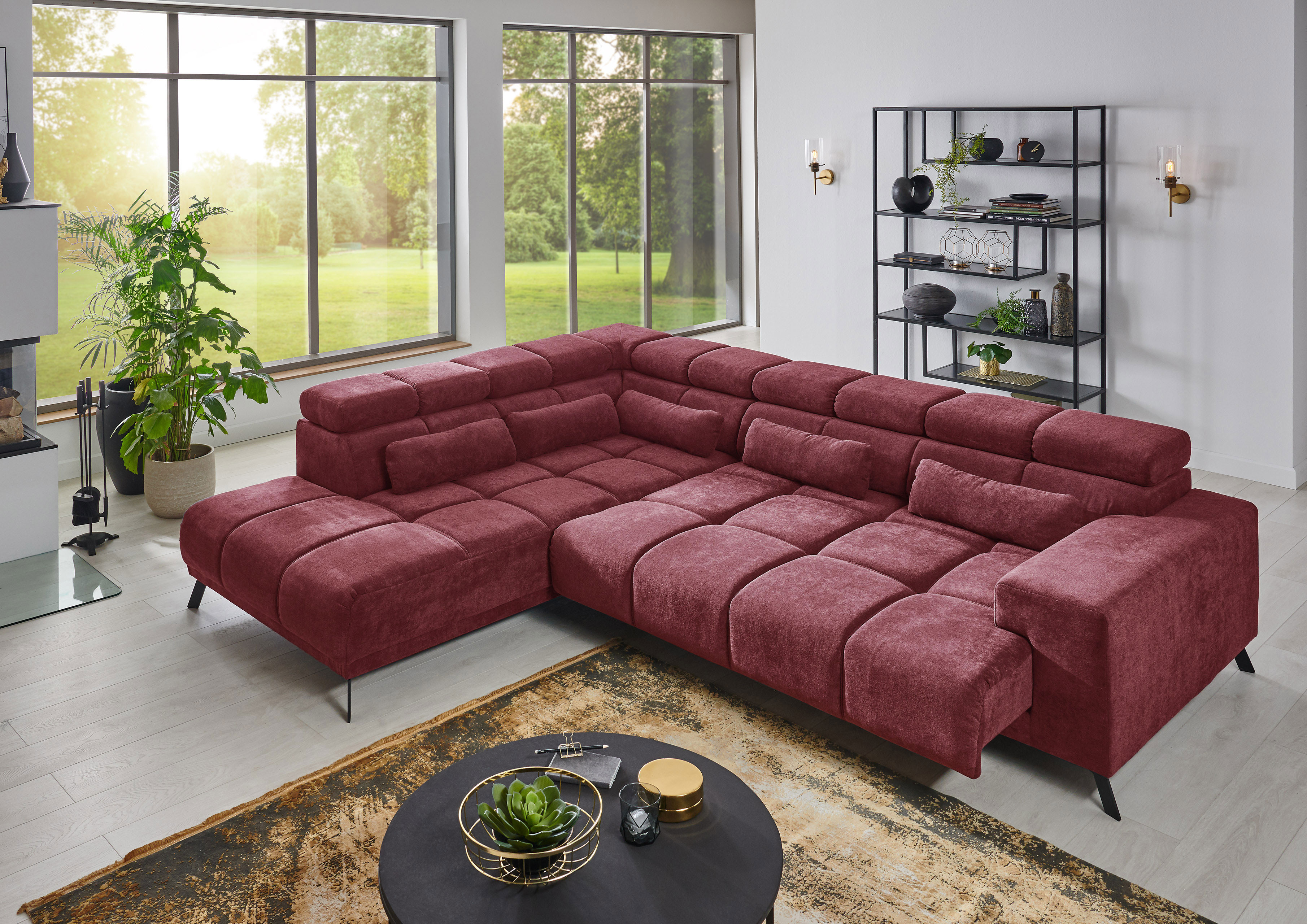 Wunderbar behaglich und zugleich modern – mit der Eckgarnitur Inside von Iwaniccy lassen Sie zeitlosen Charme in Ihr Zuhause einziehen und sichern sich dabei eine Wohlfühloase der besonderen Art. In der Kombination aus einer Ottomane und einem 2-Sitzer, welche ein großzügiges Stellmaß von etwa 232 x 295 cm ausmachen, können Sie es sich auf einer Bonellfederkern-Polsterung, ruhend auf Nosagunterfederung, unendlich bequem machen. Doch nicht nur das Äußere, das sich in einem roten Flockstoff präsentiert, kann punkten, auch die inklusiven Funktionen begeistern – eine motorische Sitztiefenverstellung ermöglicht das Variieren der Sitztiefe von ca. 75 bis auf etwa 105 cm. Hier können Sie es sich durch das einfache Drücken der Sensoren an der Innenseite der Armlehne auf einer Liegefläche von ca. 217 x 105 cm so richtig gemütlich machen, einen spannenden Film im Fernsehen schauen oder einfach nur nach Lust und Laune entspannen. Eine ebenso von Haus aus integrierte Kopfteilverstellung bietet Ihnen ferner die Möglichkeit, die Kopfteile von etwa 80 auf ca. 100 cm zu justieren, um beispielsweise in aufrechter Position das neuste Magazin zu durchstöbern. Mattschwarze Metallfüße verleihen der Couch sowohl einen sicheren Stand als auch einen eleganten Look, können jedoch bei Nichtgefallen unter unseren Zusatzoptionen auch durch eine chromfarbene Ausführung ersetzt werden. Um das Sitzempfinden abzurunden, liefern wir Ihnen fünf kuschelige Nierenkissen gleich mit. Hier bleiben keine Erholungswünsche offen – mit Inside von Iwaniccy.