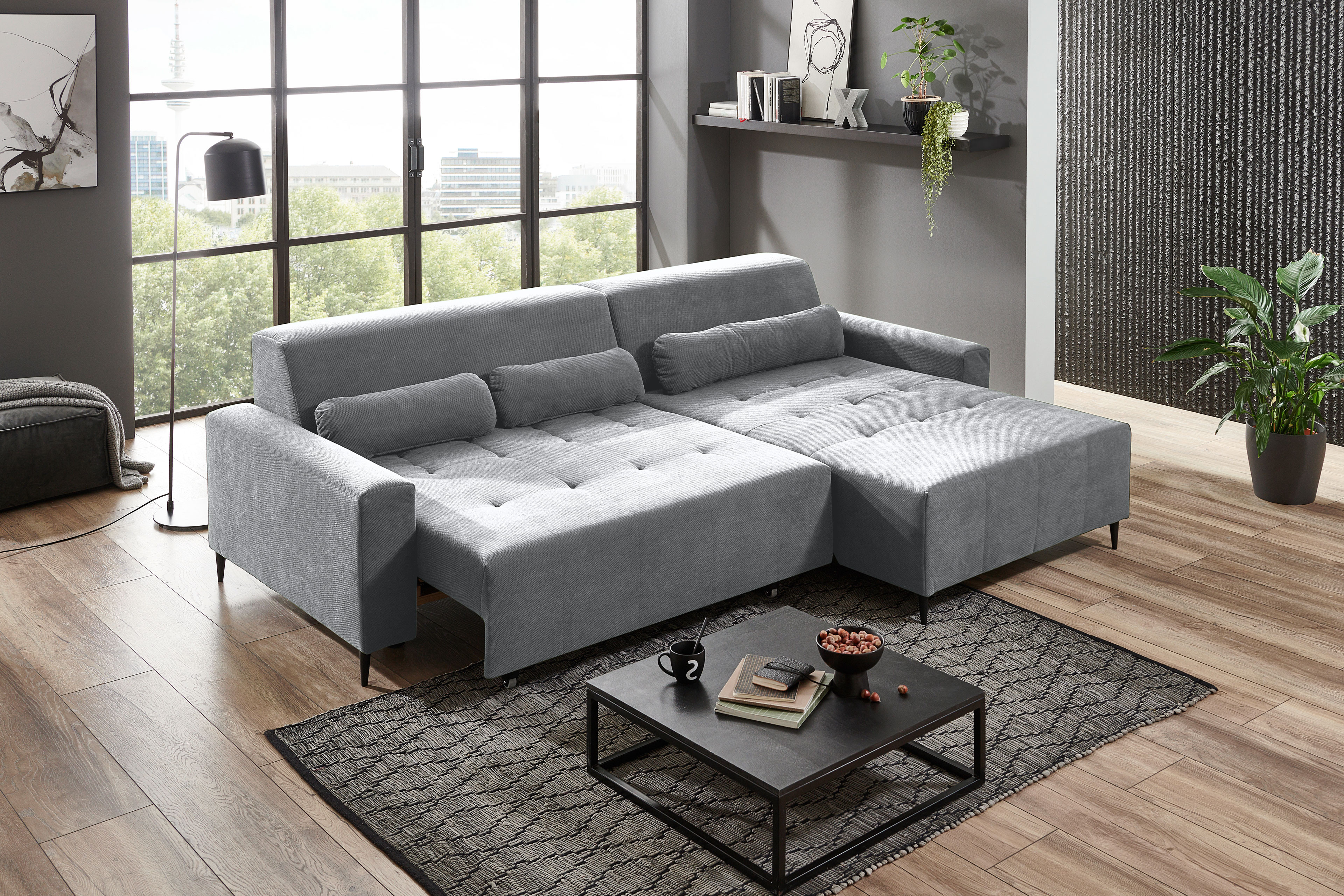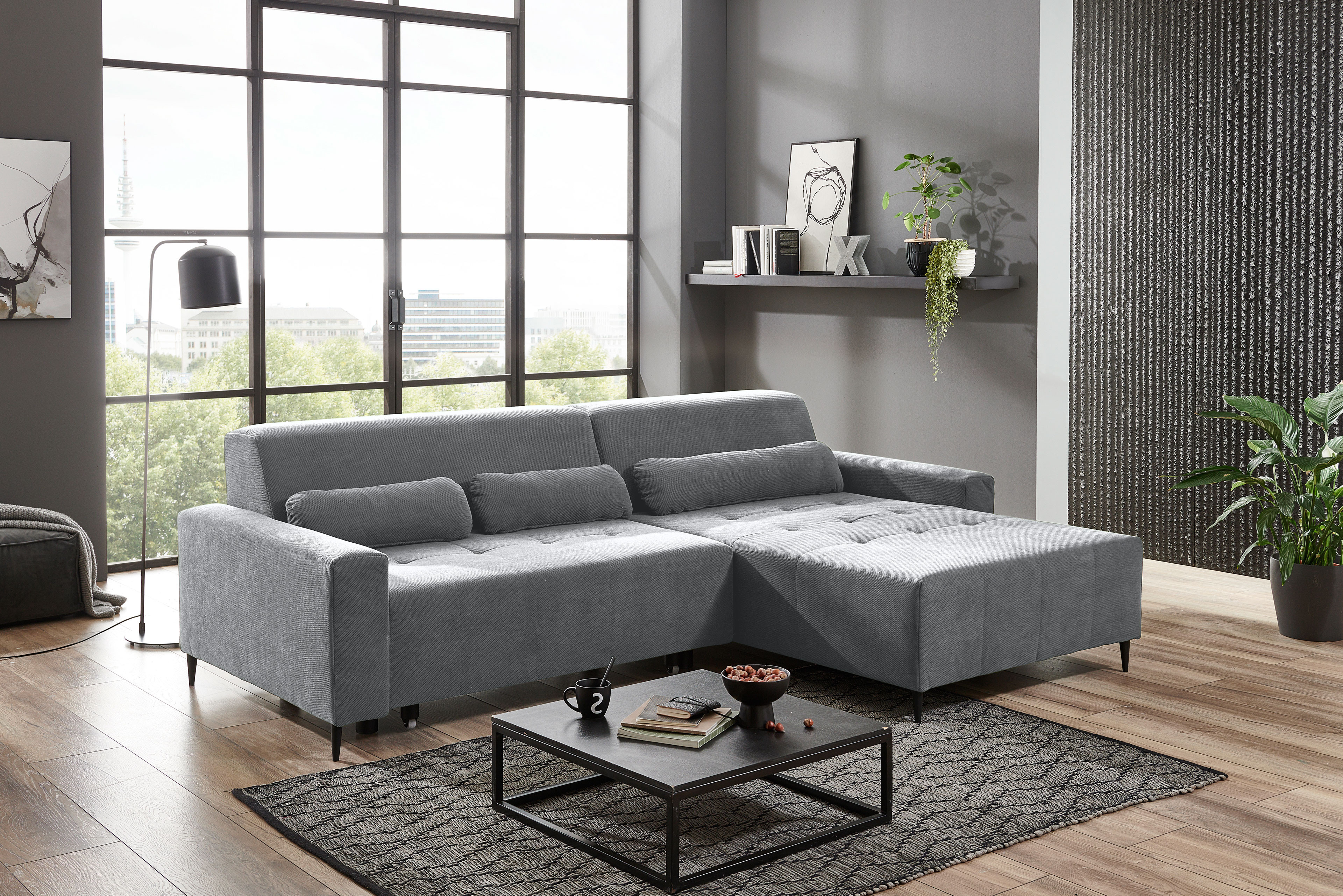Im wunderschönen Flachgewebebezug in Hellgrau stellt Iwaniccy die moderne Eckgarnitur Linz vor. Die wunderbare Haptik und Optik des Stoffes lässt Sie sicherlich viele Komplimente bei Ihren Gästen einheimsen, denn mit einem Flachgewebe-Sofa erhalten Sie einen der größten Trends des Jahres, der sich gut mit anderen Materialien sowie Einrichtungsgegenständen kombinieren lässt und dabei ebenso leicht zu reinigen ist. Für einen modernen Charme sowie einen sicheren Stand sorgen matt schwarze Metallfüße. Sollte Ihnen jedoch die äußere Hülle der Sitzgelegenheit nicht gefallen, so haben Sie unter dem Menüpunkt "Wunschbezug - Farbe ändern" die Möglichkeit, sich für ein differentes Outfit zu entscheiden, welches Ihnen kompromisslos zusagt. Besonderes Highlight dieser Garnitur ist die bereits im Lieferumfang enthaltene Wohlfühlfunktion: So punktet sie mit einer motorischen Sitztiefenverstellung, welche Ihnen eine erweiterte Liegefläche von etwa 40 cm zur Verfügung stellt. So können Sie Ihre gewünschte Lieblingsposition einstellen und es sich am Abend vor dem Fernseher oder am Nachmittag, angelehnt an die inklusiven Nierenkissen in zwei Größen, mit einem guten Buch so richtig gemütlich machen. Die Annehmlichkeiten in perfekter Balance mit dem ausdrucksstarken Auftreten machen aus Linz ein stilvolles sowie zeitgemäßes Iwaniccy Sofa, welches darauf wartet, Ihr Wohnraumbegleiter zu werden.