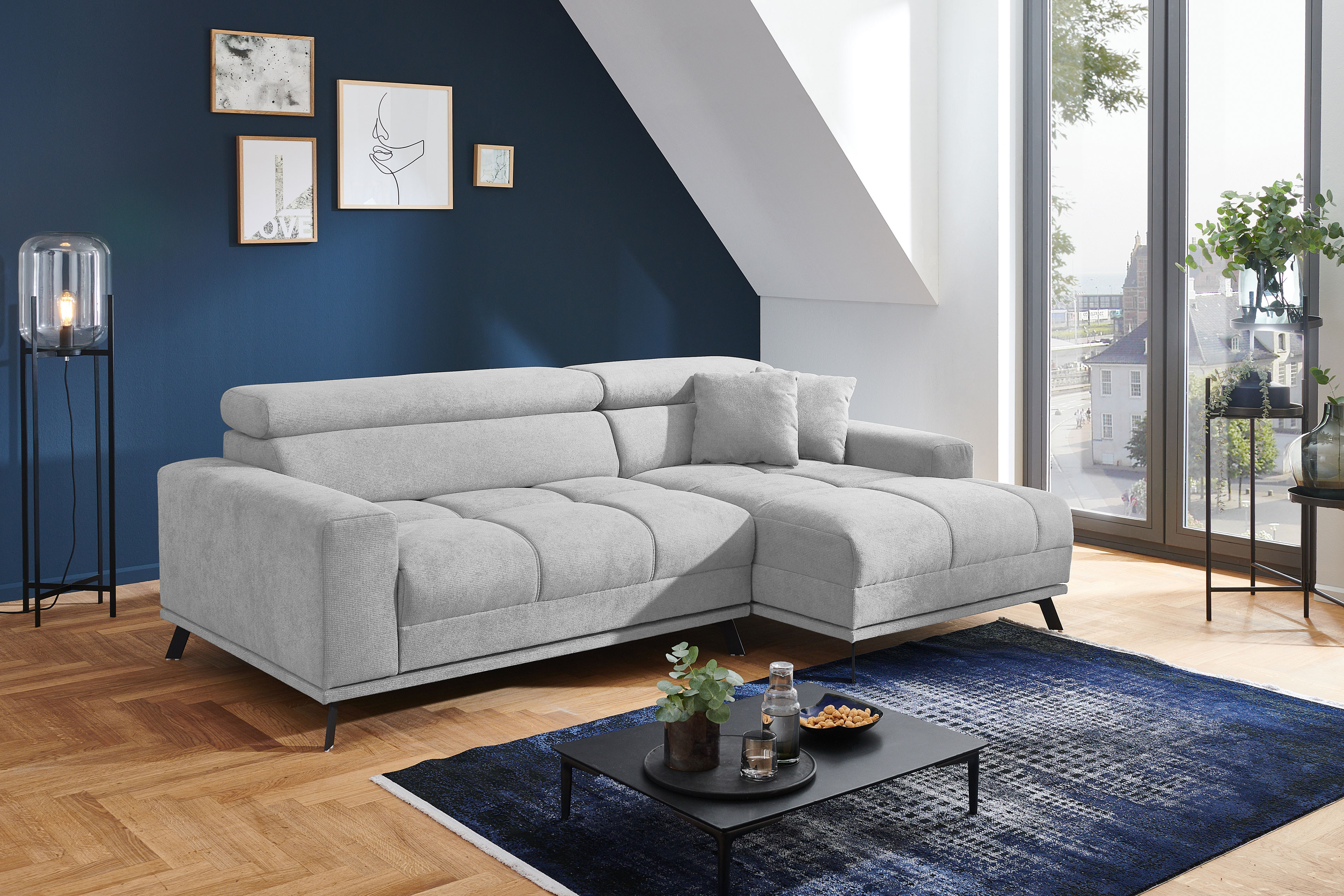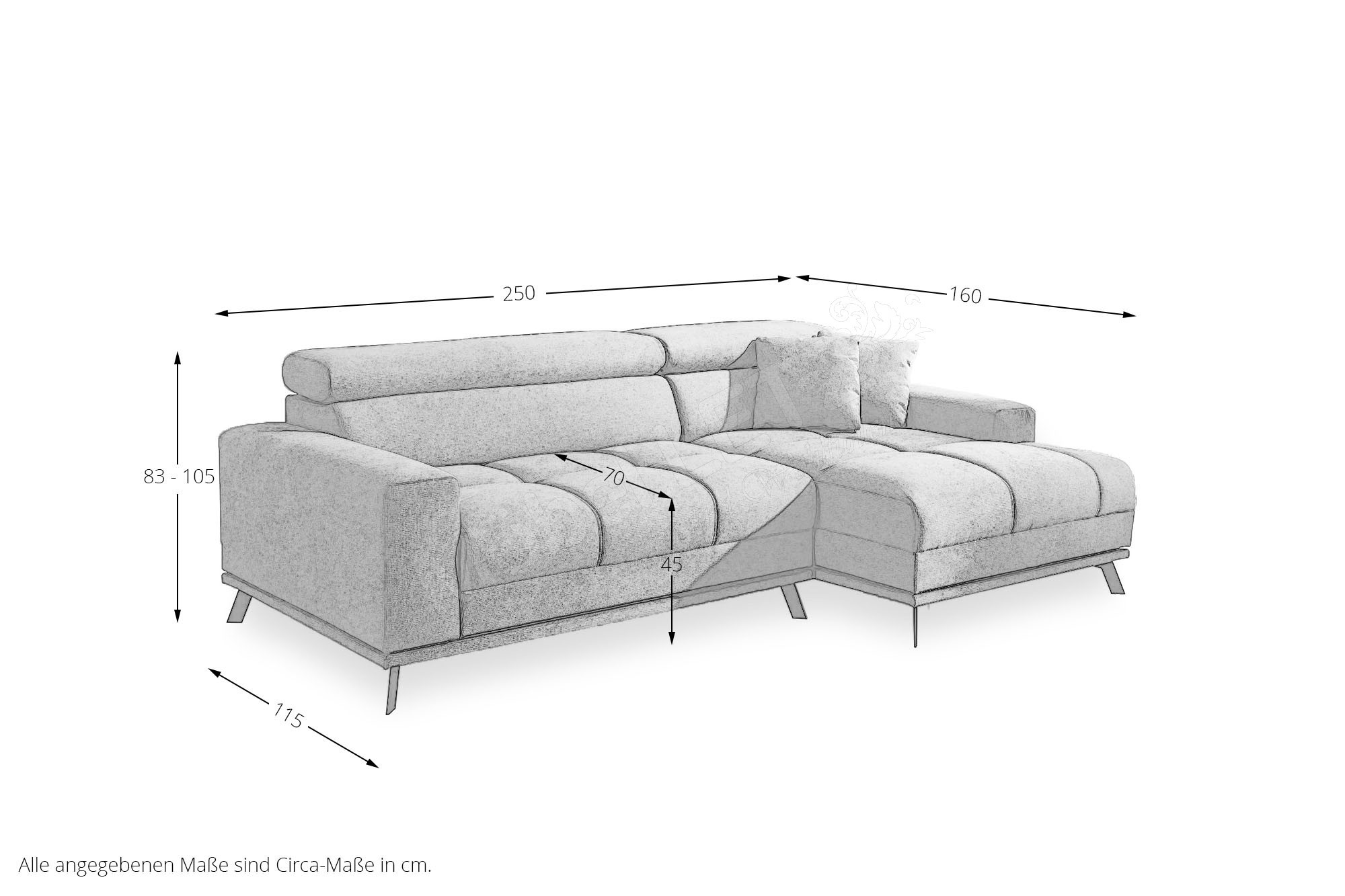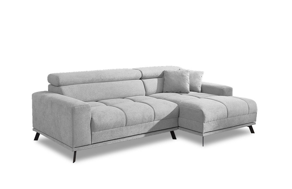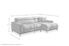 Moderne Polsterecke Malte-LE24 aus dem Hause Iwaniccy mit vielerlei Funktionen und einer großzügigen Steppung auf der Sitzfläche, die einem zum Relaxen einlädt. Bezogen in einem hellgrauen Chenille-Flachgewebe und stehend auf schwarzen Metallfüßen, ist das Sofa ein zeitloser Hingucker für Ihren Wohnbereich. Dank der bequemen Polsterung aus Polyätherschaum auf Nosagunterfederung, ist nicht nur ein langfristiges Sitzgefühl garantiert, sondern auch entspannten Nachmittagen mit dem Partner steht nichts mehr im Wege. Sollten Sie immer mal wieder spontane Schlafgäste haben, können Sie ganz einfach anhand der inkludierten elektrischen Sitztiefenverstellung eine Liegefläche von etwa 202 x 115 cm zaubern. Damit das tolle Gesamtpaket perfekt abgerundet wird, ist jeweils eine manuelle Kopfteilverstellung pro Element integriert und ebenso erhalten Sie zwei kleine Zierkissen, die sich der Garnitur farblich anpassen. Mit einem Stellmaß von ca. 250 x 160 cm lässt sich das Sofa nahezu in fast jedes Wohnzimmer stellen und wird dort zu einem schönen Eyecatcher. Für den Fall, dass der Bezug noch nicht perfekt zu Ihrer Einrichtung passt, können Sie unter dem Punkt "Wunschbezug - Farbe ändern" zwischen verschiedenen Bezügen entscheiden und somit die Garnitur ganz nach Ihrem persönlichen Geschmack gestalten. Die geschmackvolle Polstercouch Malte-LE24 vom Hersteller Iwaniccy kann schon bald auch zu Ihrer neuen Wohlfühloase werden, also bestellen Sie noch heute und relaxen schon bald.