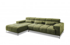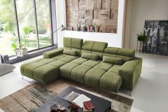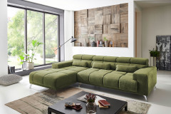 In moderner Aufmachung, mit großzügiger Steppung hält das Modell Speed von Iwaniccy gern Einzug in Ihrem Zuhause und überzeugt Sie mit trendigem Aussehen sowie komfortabler Funktionalität. Bezogen ist die Eckgarnitur in einem grünen Flachgewebe - ein Bezugsmaterial, welches aufgrund seiner angenehmen Haptik sowie seiner besonderen Optik sehr beliebt ist. Ein langlebiger Bonellfederkern garantiert einen angenehmen Sitz- sowie Liegekomfort, welcher dank der inklusiven Kopfteilverstellung maximal erhöht wird. Stellen Sie die Kopfteile in eine aufrechte Position, erhöhen Sie Ihre Anlehnfläche um ca. 20 cm und nehmen Sie sich mal wieder ein spannendes Buch zur Hand, oder schaffen Sie sich durch das Hinzubuchen der motorischen Sitztiefenverstellung eine erweiterte Liegefläche von ca. 222 x 105 cm, auf der Sie einen gemütlichen TV-Abend, allein oder mit Ihrem Partner, genießen können. Drei farblich abgestimmte, dazugehörige Nierenkissen unterstützen Ihren Lendenbereich, können unter dem Punkt "Wunschbezug" ebenso durch eine andere Farbe ersetzt werden wie das Bezugskleid des Sofas. Platzieren Sie Ihre neue Couchgarnitur schon einmal gedanklich in Ihrem Wohnbereich und sind Sie voller Vorfreude - auf die Sitzgelegenheit Speed von Iwaniccy.
