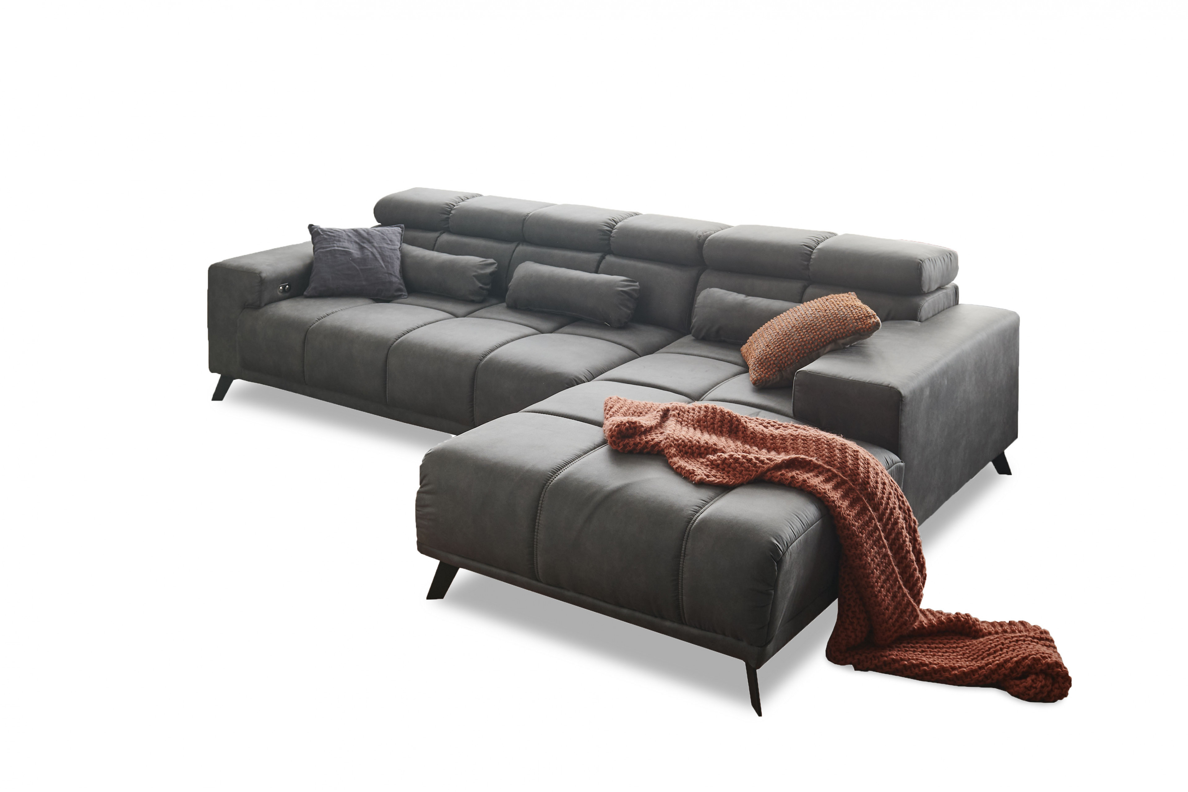 In moderner Aufmachung, mit großzügiger Steppung hält das Modell Speed von Iwaniccy gern Einzug in Ihrem Zuhause und überzeugt Sie mit trendigem Aussehen sowie komfortabler Funktionalität. Bezogen ist die Eckgarnitur in einem dunkelbraunen Microfaser - ein Bezugsmaterial, welches aufgrund seiner angenehmen Haptik sowie seiner besonderen Optik sehr beliebt ist. Ein langlebiger Bonellfederkern garantiert einen angenehmen Sitz- sowie Liegekomfort, welcher dank der inklusiven Kopfteilverstellung maximal erhöht wird. Stellen Sie die Kopfteile in eine aufrechte Position, erhöhen Sie Ihre Anlehnfläche um ca. 20 cm und nehmen Sie sich mal wieder ein spannendes Buch zur Hand, oder schaffen Sie sich durch das Hinzubuchen einer motorischen Sitztiefenverstellung eine erweiterte Liegefläche von ca. 222 x 105 cm, auf der Sie einen gemütlichen TV-Abend, allein oder mit Ihrem Partner, genießen können. Drei farblich abgestimmte, dazugehörige Nierenkissen unterstützen Ihren Lendenbereich, können unter dem Punkt "Wunschbezug" ebenso durch eine andere Farbe ersetzt werden wie das Bezugskleid des Sofas. Platzieren Sie Ihre neue Couchgarnitur schon einmal gedanklich in Ihrem Wohnbereich und sind Sie voller Vorfreude - auf die Sitzgelegenheit Speed von Iwaniccy.