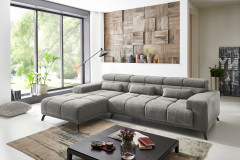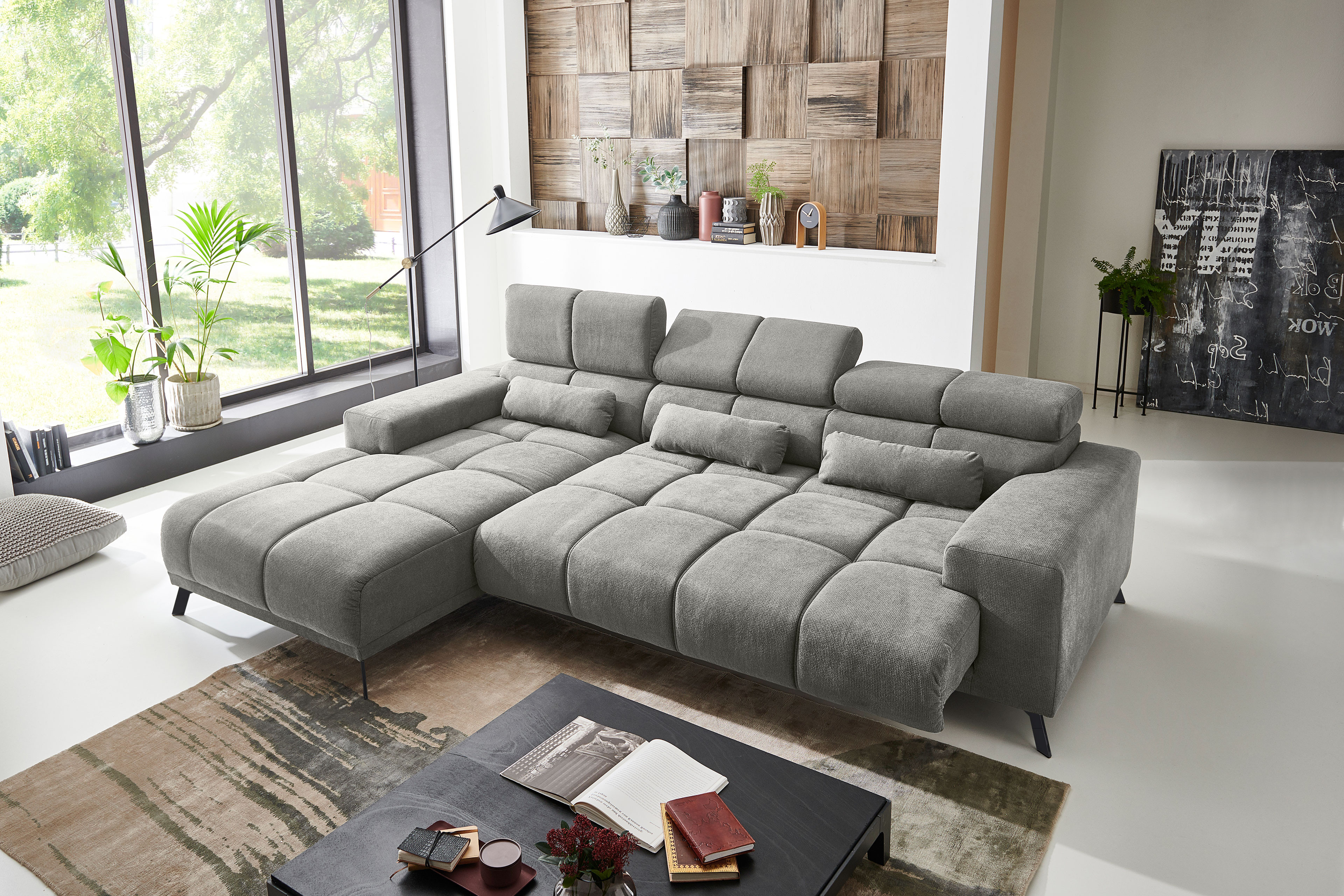 In moderner Aufmachung und mit großzügiger Steppung hält das Modell Speed von Iwaniccy gern Einzug in Ihrem Zuhause und überzeugt Sie mit trendigem Aussehen und komfortabler Funktionalität. Bezogen ist die Eckgarnitur in einem hellgrauen Flachgewebe - ein Bezugsmaterial, welches aufgrund seiner angenehmen Haptik sowie seiner besonderen Optik sehr beliebt ist. Ein langlebiger Bonellfederkern garantiert einen angenehmen Sitz- sowie Liegekomfort, welcher dank der inklusiven Kopfteilverstellung maximal erhöht wird. Stellen Sie die Kopfteile in eine aufrechte Position, erhöhen Sie Ihre Anlehnfläche um ca. 20 cm und nehmen Sie sich mal wieder ein spannendes Buch zur Hand, oder schaffen Sie sich durch das Hinzubuchen der motorischen Sitztiefenverstellung eine erweiterte Liegefläche von ca. 222 x 105 cm, auf der Sie einen gemütlichen TV-Abend, allein oder mit Ihrem Partner, genießen können. Drei farblich abgestimmte, dazugehörige Nierenkissen unterstützen Ihren Lendenbereich. Unter dem Punkt “Wunschbezug“ haben Sie die Möglichkeit, eine anderes Bezugskleid für das Sofa zu wählen. Platzieren Sie Ihre neue Couchgarnitur schon einmal gedanklich in Ihrem Wohnbereich und sind Sie voller Vorfreude - auf die Sitzgelegenheit Speed von Iwaniccy.
