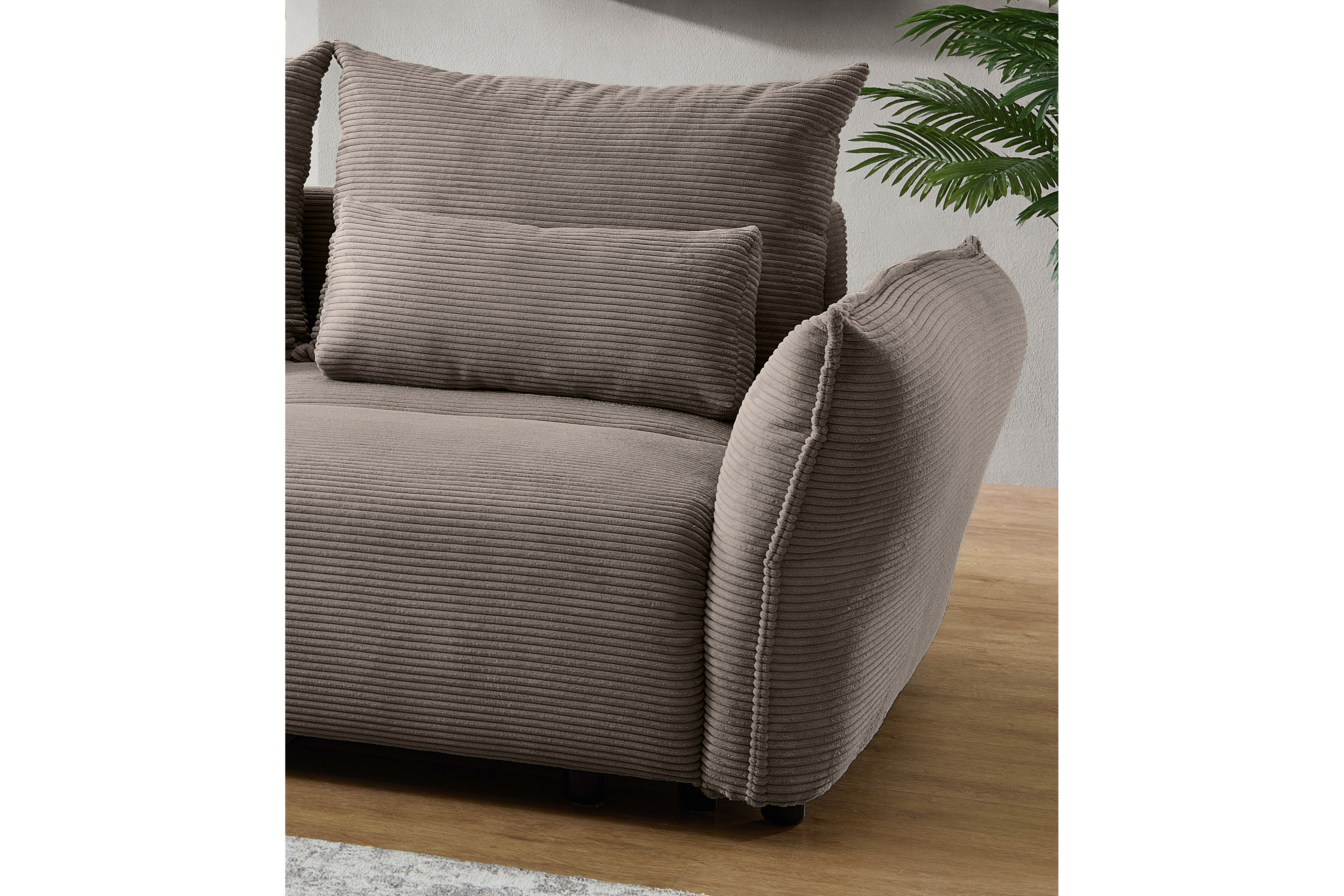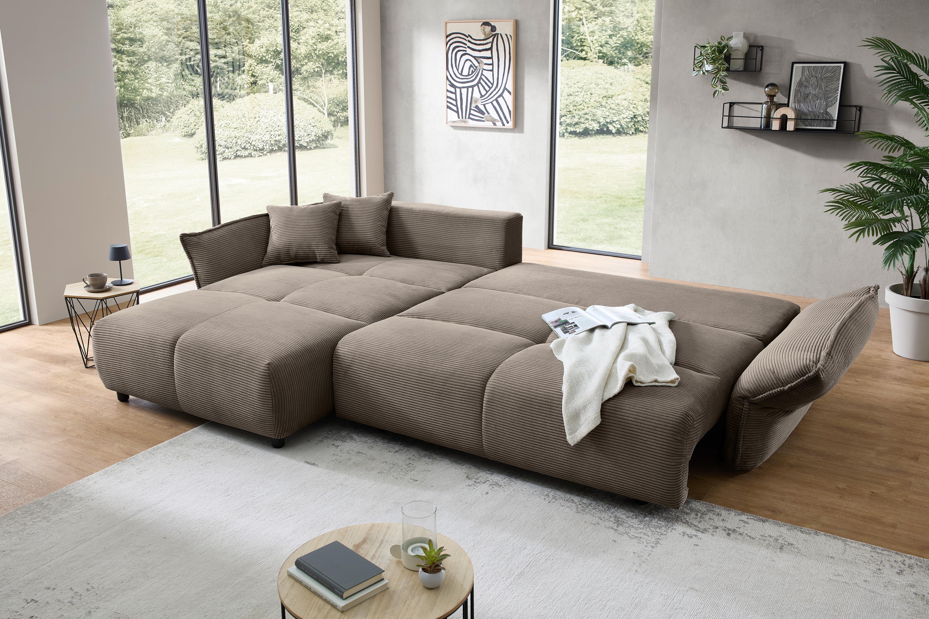 Sie sind auf der Suche nach einer charmanten Ruheoase für Ihr Zuhause? Nach einem anstrengenden Tag möchten Sie nach Hause kommen, die Beine hochlegen und einfach nur entspannen oder ein gutes Buch lesen? Zugleich sollte Ihr neues Sofa aber auch ausreichend Platz für Ihre Liebsten oder den Übernachtungsbesuch bieten? Dann sind Sie hier genau richtig - denn das Modell Amaro aus dem Hause Benformato wird allen diesen Anforderungen gerecht! Im angesagten Cordbezug im Farbton Grau-Braun wird die Eckgarnitur ganz sicher zum Eyecatcher in Ihrem Wohnzimmer. Ein erstklassiger Sitz- sowie Liegekomfort wird durch einen hochwertigen Federkern garantiert und eine überragende Sitztiefe von ca. 77 cm sowie die zahlreichen bereits im Lieferumfang enthaltenen Kissen sorgen für den höchsten Gemütlichkeitsfaktor. Aber das Benformato Sofa bringt nicht nur gutes Aussehen und Bequemlichkeit mit - in dieser formschönen Eckcouch steckt noch viel mehr! Eine integrierte Schlaffunktion mit einer Liegefläche von etwa 260 x 140 cm verspricht Ihren Schlafgästen angenehme Nächte und im ebenfalls integrierten Bettkasten finden nicht benötigte Kissen sowie Decken einen passenden Platz. Wählen Sie Ihren Wunschbezug, passen Sie Ihr neues Ecksofa farblich an Ihr Interieur an und bestellen Sie noch heute - Amaro von Benformato Polstermöbel.