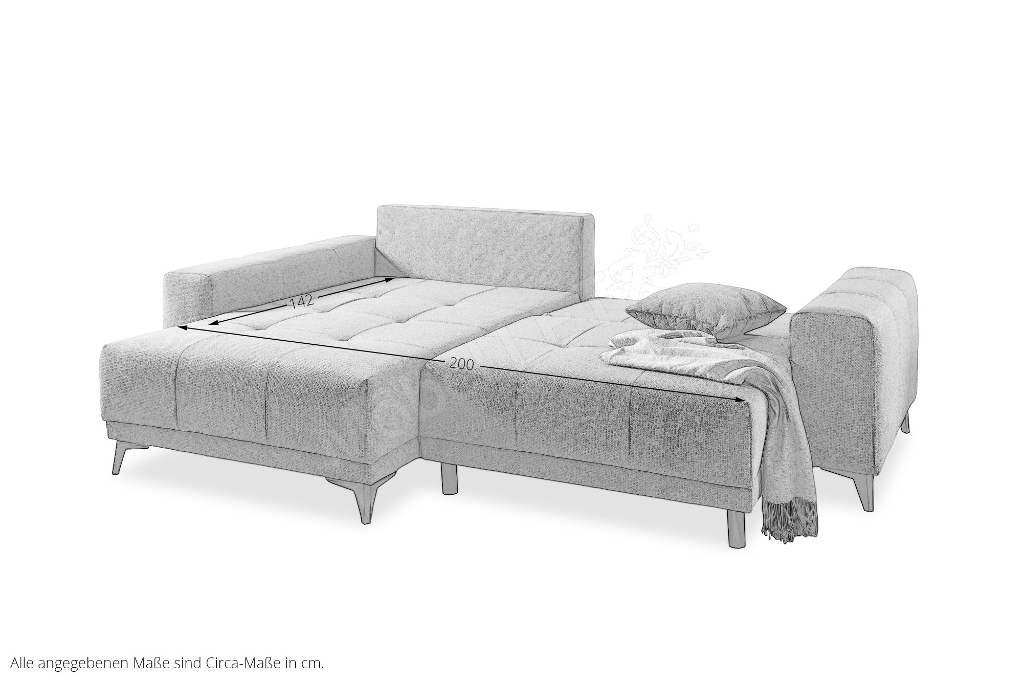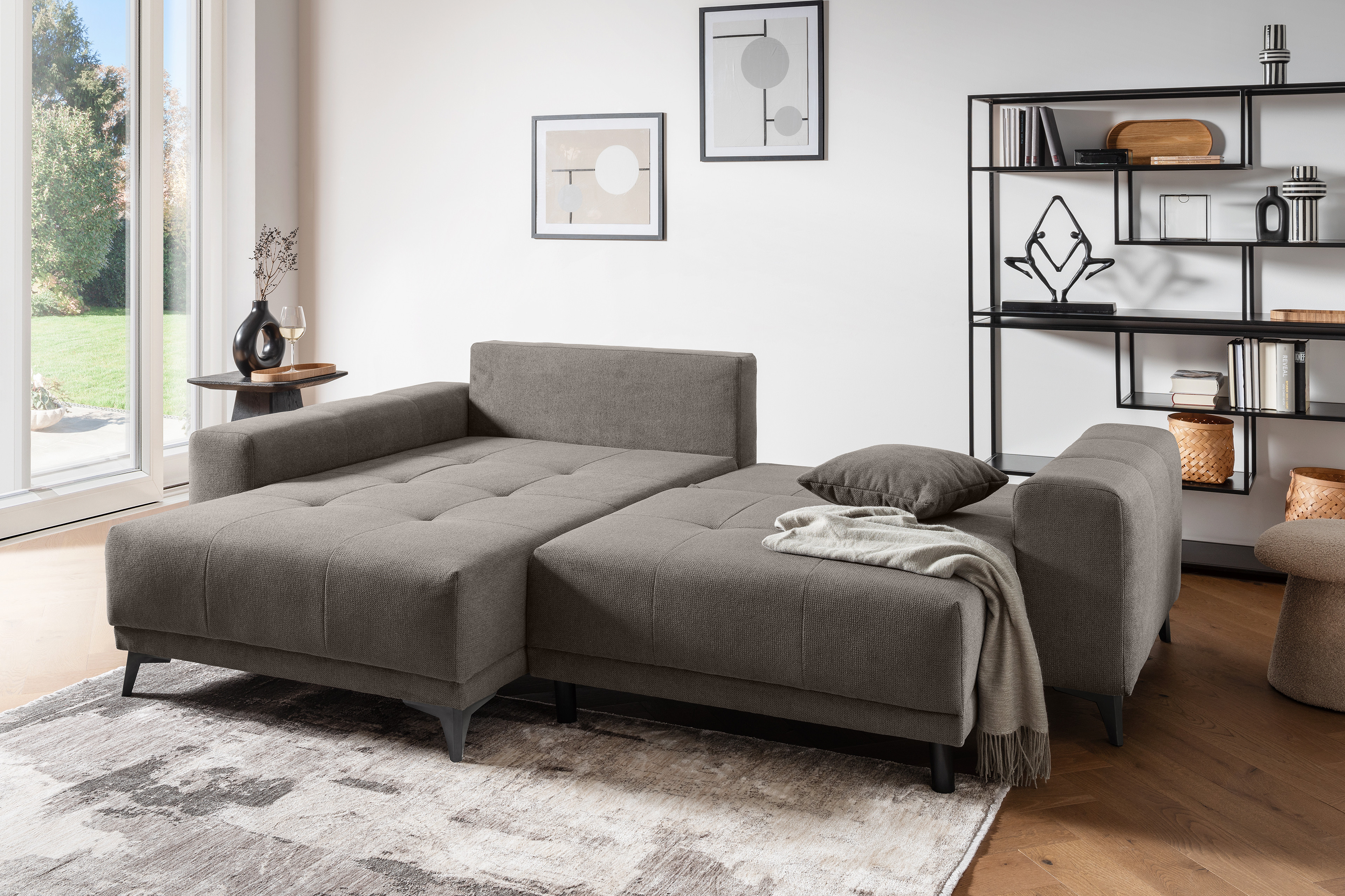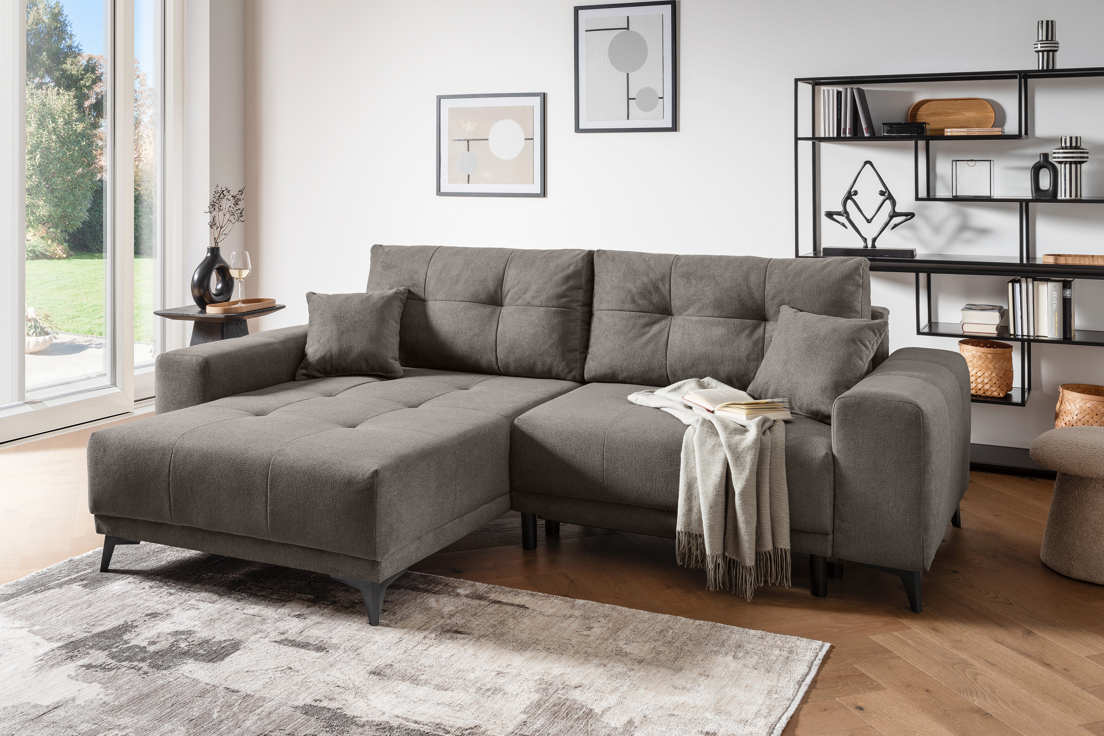 Praktisch und komfortabel zugleich - das Ecksofa Appassito aus dem Hause Benformato Polstermöbel. Mit einem kompakten Stellmaß von ca. 170 x 256 cm lässt sich die Garnitur besonders gut in kleine sowie verwinkelte Wohnräume integrieren. Mit ihren klaren Linien, der eleganten Steppung und den dezenten Füßen fügt sie sich zudem mühelos in verschiedenste Einrichtungsstile ein - von minimalistisch bis gemütlich-modern. Der hochwertige Chenille-Flachgewebe-Bezug fühlt sich angenehm weich an und überzeugt gleichzeitig durch seine Strapazierfähigkeit im Alltag. Eine Komfortschaumpolsterung bietet die perfekte Grundlage zum Entspannen, während die bequemen Rücken- sowie Zierkissen zusätzlichen Komfort bieten - ideal für lange Abende oder entspannte Wochenenden. Ein besonderes Highlight ist die integrierte Schlaffunktion: Mit wenigen Handgriffen lässt sich das Sofa in eine komfortable Liegefläche verwandeln. So sind Sie bestens vorbereitet für spontane Übernachtungsgäste oder gemütliche Filmabende mit extra viel Platz. Dafür benötigte Kissen und Decken finden im inkludierten Bettkasten ihren Platz. Typisch für Benformato: Die Eckcouch ist in zahlreichen Bezugsmaterialien erhältlich. Stöbern Sie einfach durch die Bezugsübersicht, entscheiden Sie sich für den passenden Stoff im präferierten Farbton und kreieren Sie mit nur wenigen Klicks ein Sofa, welches demnächst in Ihr Zuhause einziehen darf. Appassito von Benformato - Ihr Platz zum Wohlfühlen.