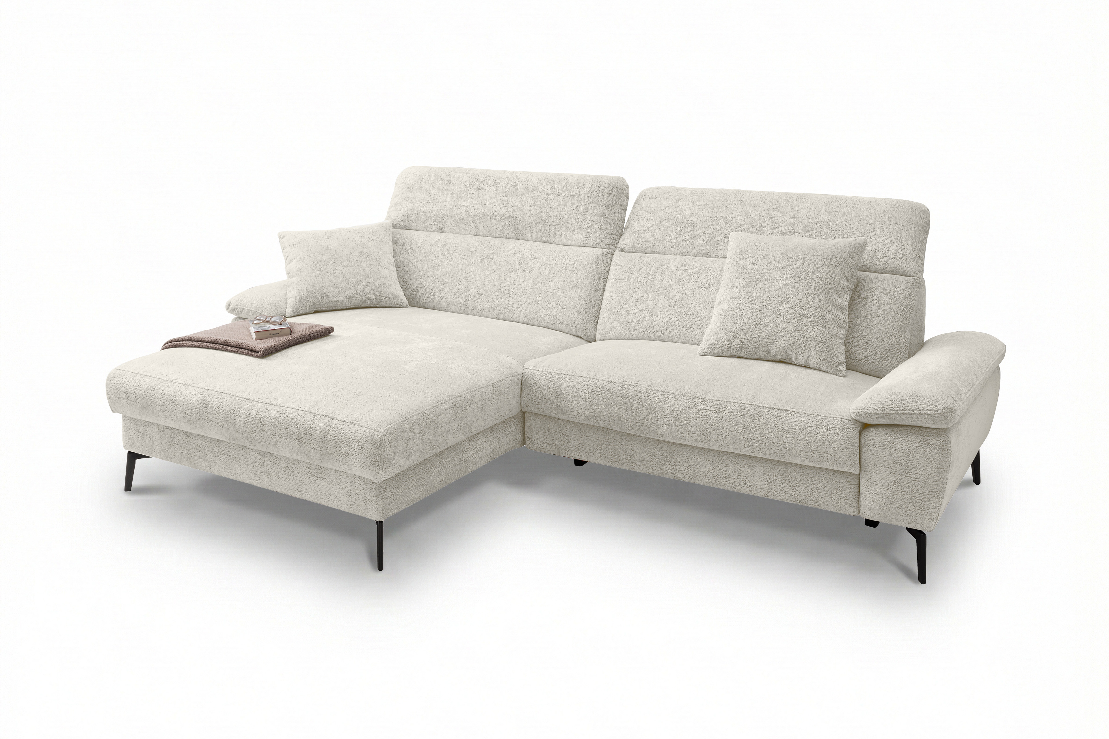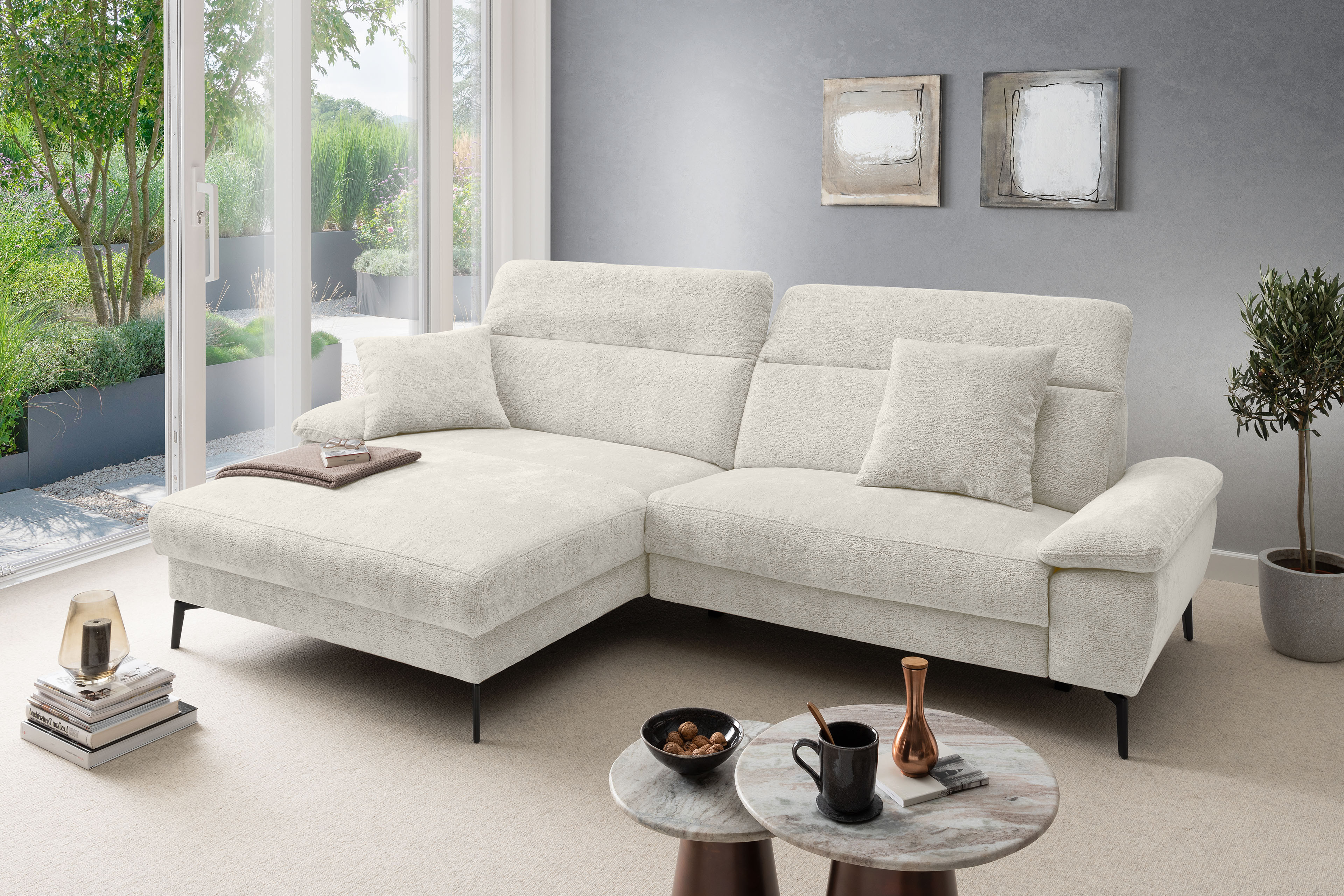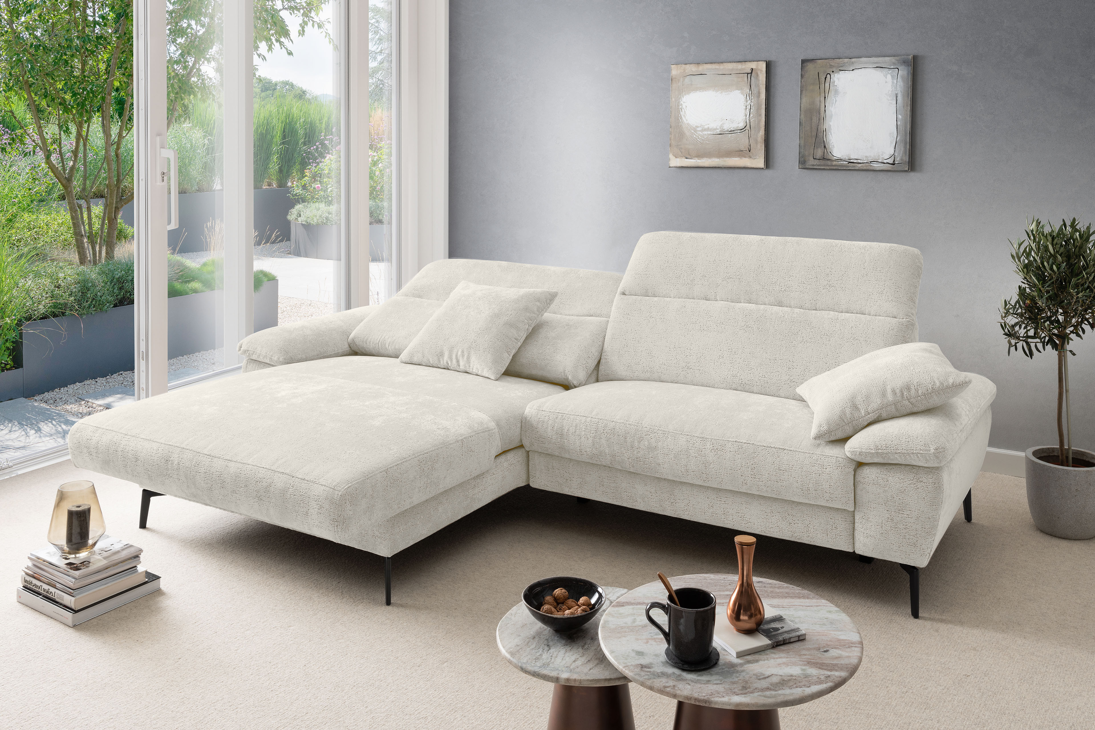 Stellen Sie sich vor, Sie kommen nach einem langen Tag nach Hause. Sie lassen sich fallen und der Stress des Alltags bleibt einfach draußen. Die moderne Eckgarnitur Cancelli von Benformato ist nicht einfach nur ein Möbelstück, sie ist Ihre persönliche Wohlfühloase. Ganz gleich, ob ein geselliger Wein-Abend mit Ihren liebsten Freunden ansteht oder Sie den perfekten Serien-Marathon planen: Auf der großzügigen Zusammenstellung aus einer Recamiere mit anschließendem 2-Sitzer findet das Leben statt. Die hochwertige Federkern-Polsterung fängt Sie sanft auf und bietet einen Sitzkomfort, der Sie den Alltag vergessen lässt. Passen Sie die Kopfteile mit einem einfachen Handgriff genau an Ihre Bedürfnisse an und spüren Sie, wie sich die Anspannung löst. Sie möchten den absoluten Luxus? Gönnen Sie sich das Upgrade auf die elektrische Relaxfunktion im 2-Sitzer. Ein Knopfdruck genügt, und Sie gleiten sanft in die wohltuende Herz-Waage-Position. Ihre Beine ruhen auf einer Höhe mit Ihrem Herzen - ein Gefühl von Schwerelosigkeit, das Ihren Kreislauf spürbar entlastet. Eingehüllt in ein kuschelweiches Chenille-Flachgewebe, verleiht die Garnitur Ihrem Wohnzimmer eine unwiderstehlich behagliche Atmosphäre. Und weil Ihr Zuhause so individuell ist wie Sie: Wählen Sie aus einer riesigen Farb- und Stoffkollektion genau das Design, das Ihr Herz höherschlagen lässt. Schaffen Sie sich den Rückzugsort, den Sie verdienen. Holen Sie sich die Cancelli von Benformato nach Hause.