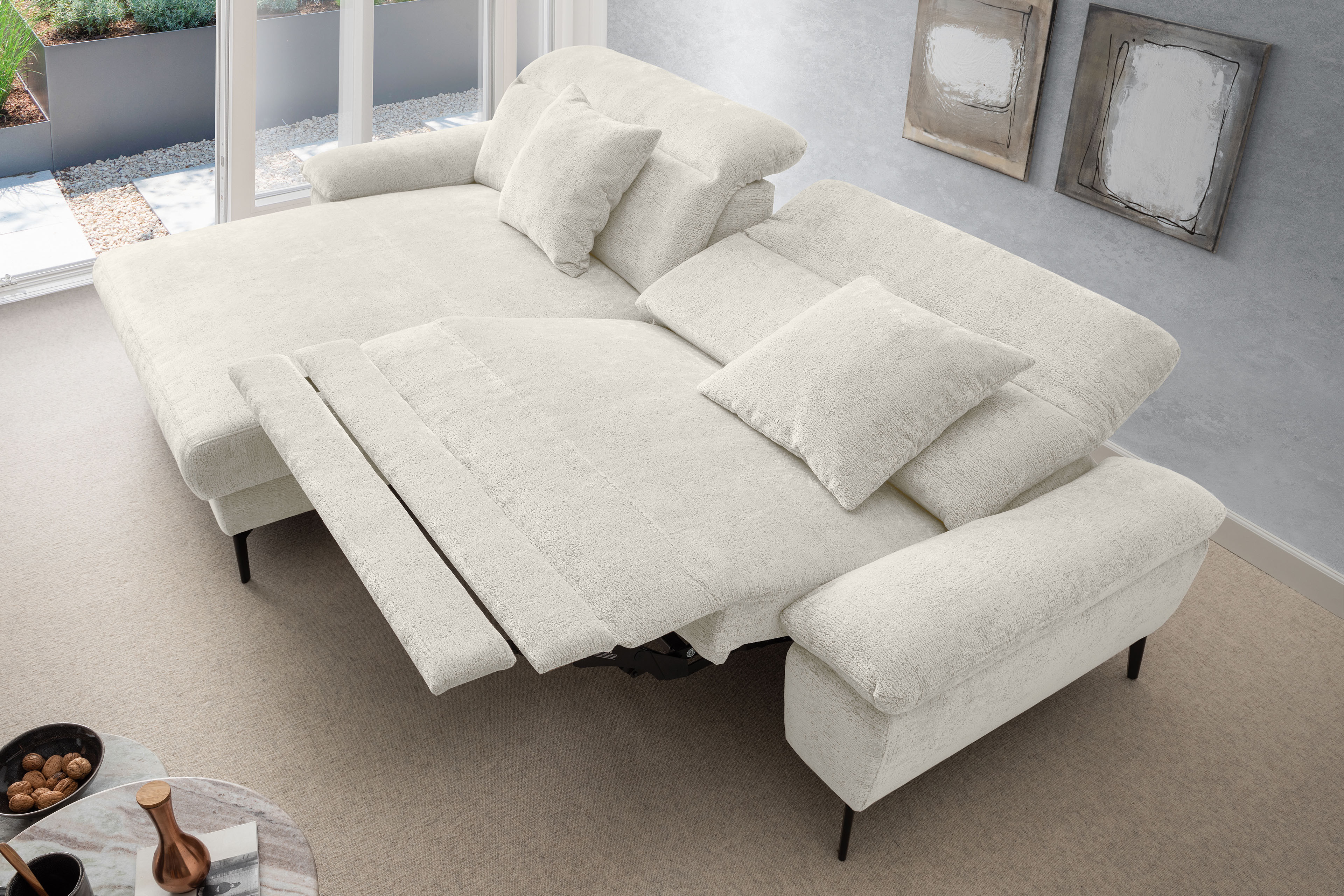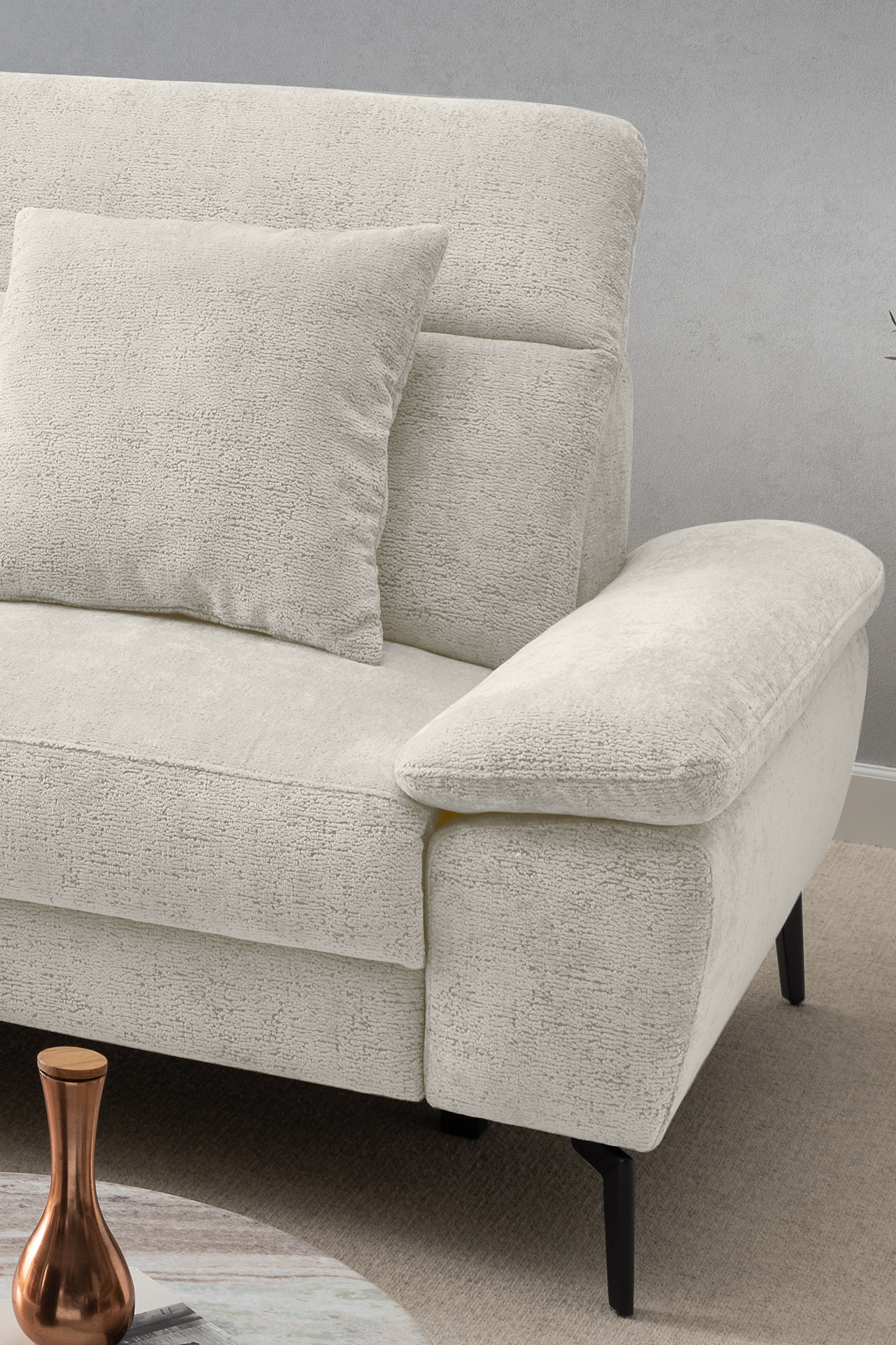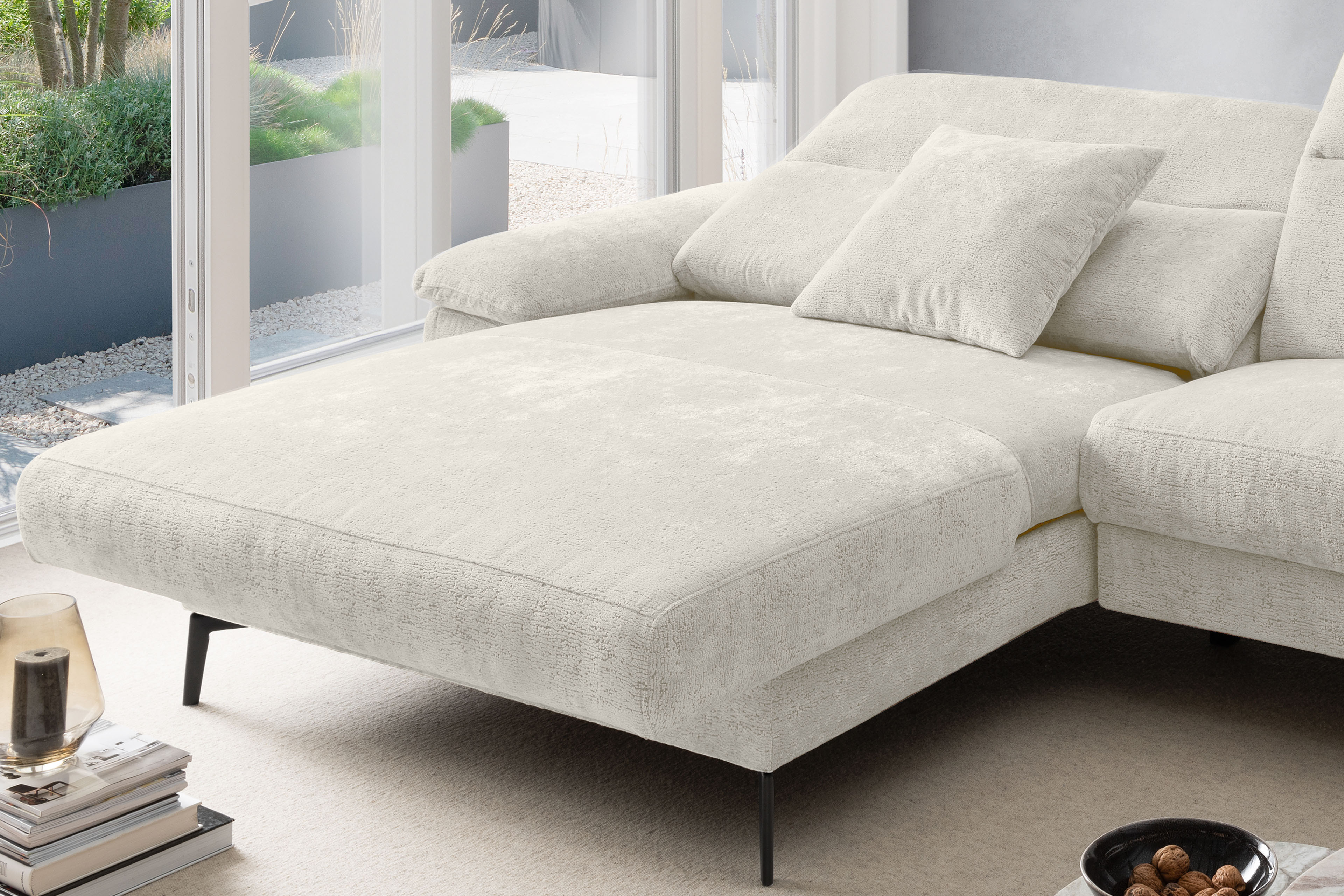 Stellen Sie sich vor, Sie kommen nach einem langen Tag nach Hause. Sie lassen sich fallen und der Stress des Alltags bleibt einfach draußen. Die moderne Eckgarnitur Cancelli von Benformato ist nicht einfach nur ein Möbelstück, sie ist Ihre persönliche Wohlfühloase. Ganz gleich, ob ein geselliger Wein-Abend mit Ihren liebsten Freunden ansteht oder Sie den perfekten Serien-Marathon planen: Auf der großzügigen Zusammenstellung aus einer Recamiere mit anschließendem 2-Sitzer findet das Leben statt. Die hochwertige Federkern-Polsterung fängt Sie sanft auf und bietet einen Sitzkomfort, der Sie den Alltag vergessen lässt. Passen Sie die Kopfteile mit einem einfachen Handgriff genau an Ihre Bedürfnisse an und spüren Sie, wie sich die Anspannung löst. Sie möchten den absoluten Luxus? Gönnen Sie sich das Upgrade auf die elektrische Relaxfunktion im 2-Sitzer. Ein Knopfdruck genügt, und Sie gleiten sanft in die wohltuende Herz-Waage-Position. Ihre Beine ruhen auf einer Höhe mit Ihrem Herzen - ein Gefühl von Schwerelosigkeit, das Ihren Kreislauf spürbar entlastet. Eingehüllt in ein kuschelweiches Chenille-Flachgewebe, verleiht die Garnitur Ihrem Wohnzimmer eine unwiderstehlich behagliche Atmosphäre. Und weil Ihr Zuhause so individuell ist wie Sie: Wählen Sie aus einer riesigen Farb- und Stoffkollektion genau das Design, das Ihr Herz höherschlagen lässt. Schaffen Sie sich den Rückzugsort, den Sie verdienen. Holen Sie sich die Cancelli von Benformato nach Hause.
