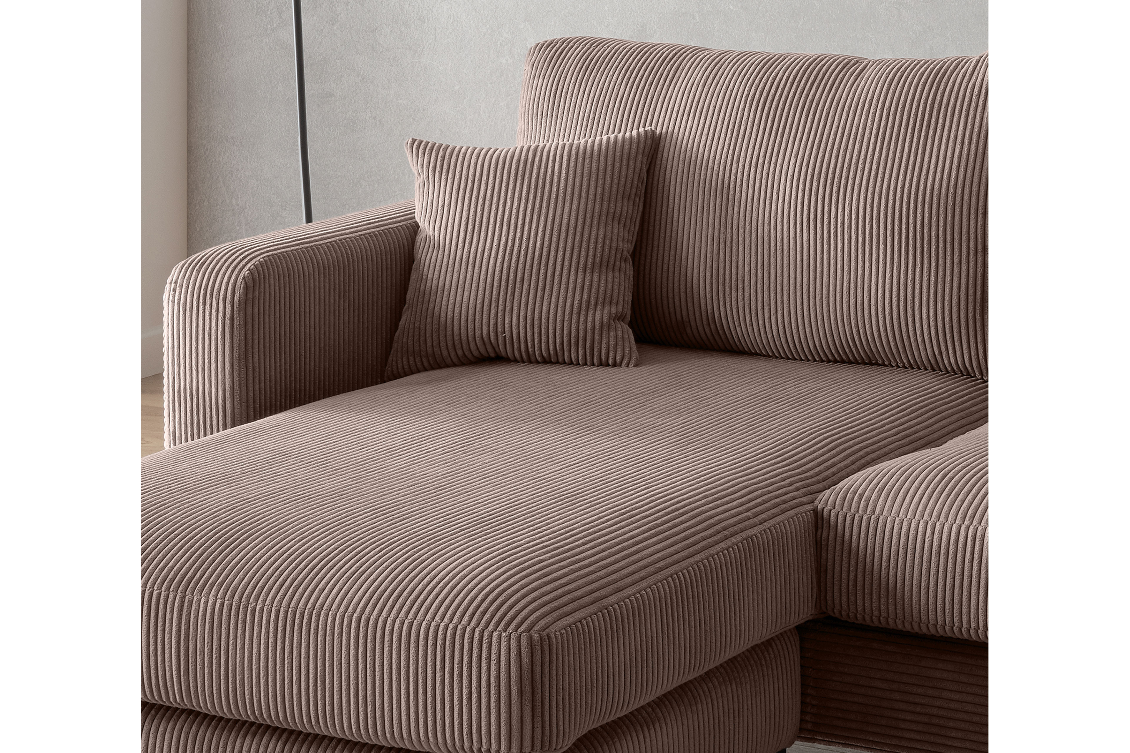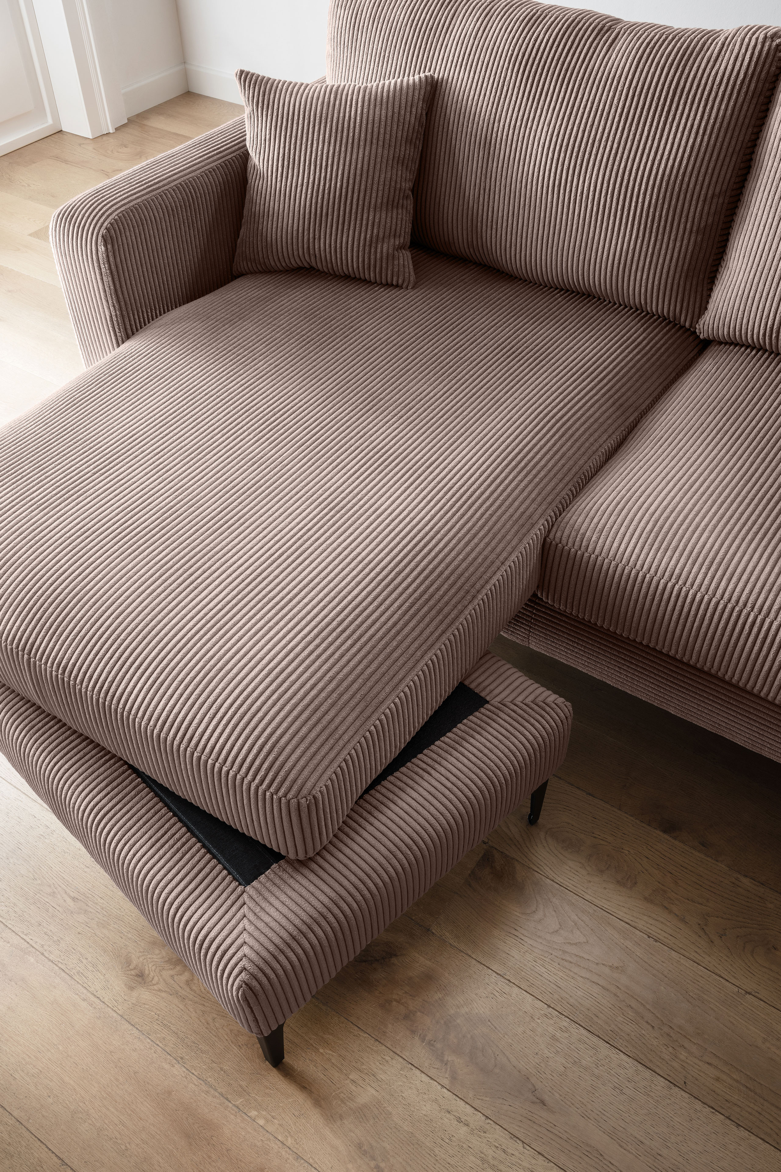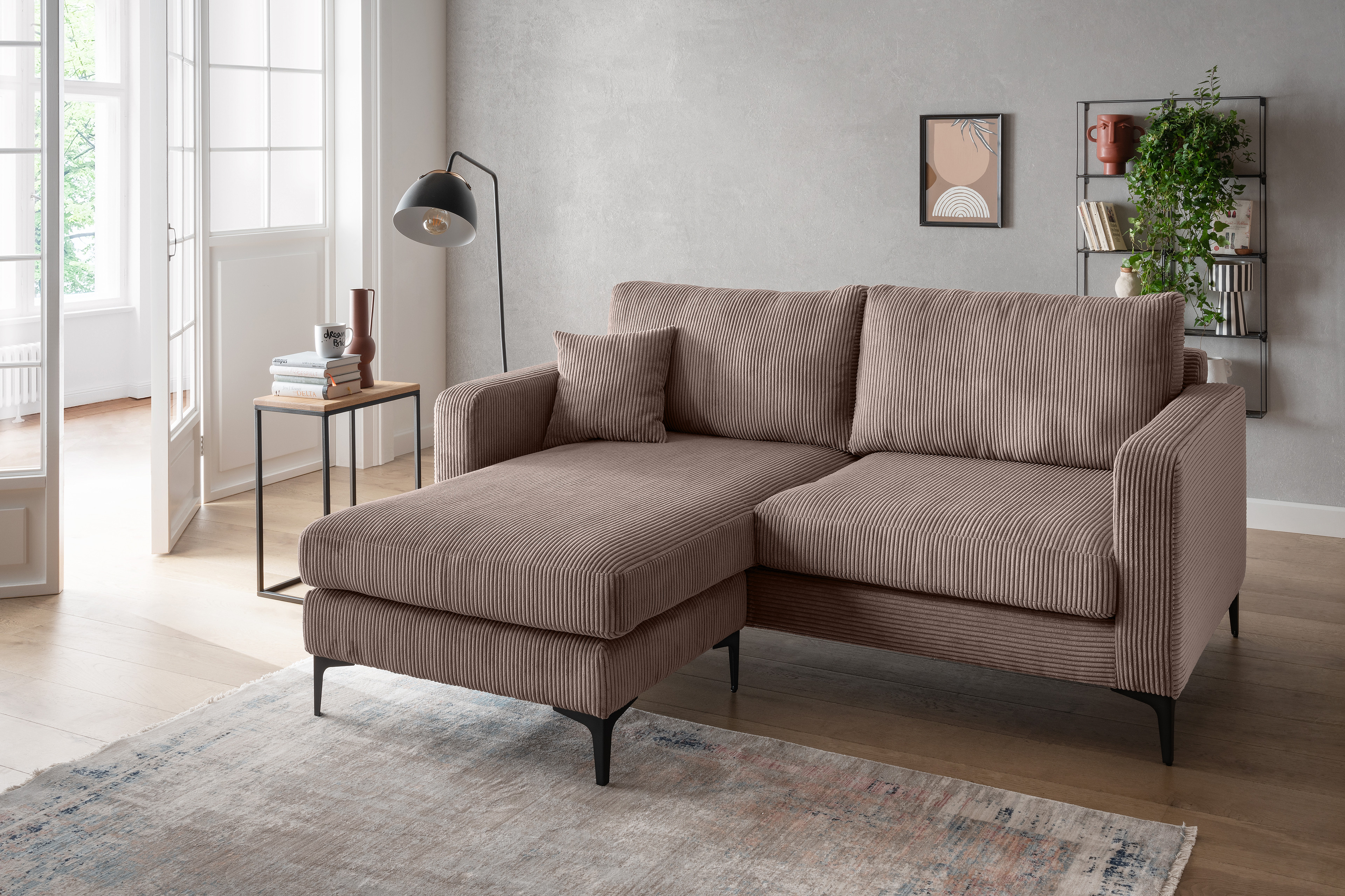 Sie sind noch auf der Suche nach einer modernen Polstergarnitur, die Ihnen den nötigen Raum bietet, um einen gemütlichen Abend vor dem Fernseher zu verbringen, doch leider ist Ihr Wohnzimmer alles andere als groß? Vielleicht könnte das Ecksofa Eliza aus dem Hause Benformato Polstermöbel die langersehnte Lösung sein, denn mit einem Stellmaß von ca. 153 x 204 cm lässt sich das Sofa in kleine wie auch in verwinkelte Räume problemlos integrieren. Die Zusammenstellung aus einem Sitzelement und einem Hockerelement sowie die losen Sitzkissen, welche mit einem Klettverschluss an den Elementen befestigt sind, ermöglichen Ihnen zudem, die Richtung des Ecksofas ganz einfach zu ändern. Doch auch optisch weiß das Benformato Sofa zu überzeugen, so besticht der braune Cordbezug mit einer angenehm weichen Haptik und verleiht seinem neuen Wirkungskreis eine behagliche Note. Als Herzstück des Möbelstücks dient eine hochwertige Wellenunterfederung, die für eine gleichmäßige Gewichtsverteilung sorgt und den formstabilen Komfortschaum, der sich dem Körper sanft anpasst, ohne weich nachzugeben, optimal stützt. Für einen individuellen Look stehen Ihnen zahlreiche Bezugsmaterialien in den unterschiedlichsten Farbtönen zur Auswahl - von zeitlosen Naturtönen über warme Erdtöne bis hin zu mutigen Statements in Gelb, Petrol oder Rot ist hier alles dabei. Eliza von Benformato - Ihr Lieblingsplatz für jeden Tag.