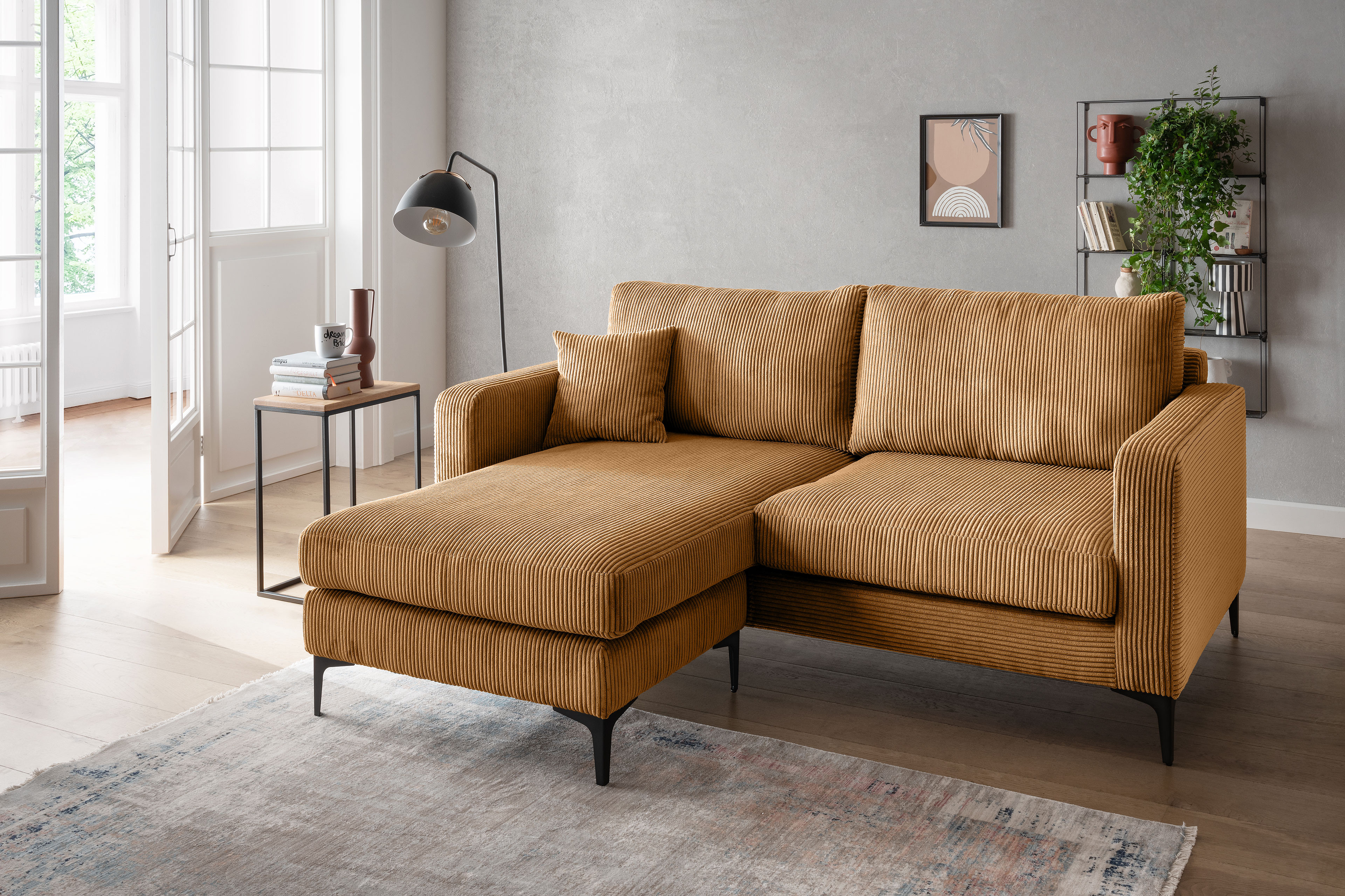 Sie sind noch auf der Suche nach einer modernen Polstergarnitur, die Ihnen den nötigen Raum bietet, um einen gemütlichen Abend vor dem Fernseher zu verbringen, doch leider ist Ihr Wohnzimmer alles andere als groß? Vielleicht könnte das Ecksofa Eliza aus dem Hause Benformato Polstermöbel die langersehnte Lösung sein, denn mit einem Stellmaß von ca. 153 x 204 cm lässt sich das Sofa in kleine wie auch in verwinkelte Räume problemlos integrieren. Die Zusammenstellung aus einem Sitzelement und einem Hockerelement sowie die losen Sitzkissen, welche mit einem Klettverschluss an den Elementen befestigt sind, ermöglichen Ihnen zudem, die Richtung des Ecksofas ganz einfach zu ändern. Doch auch optisch weiß das Benformato Sofa zu überzeugen, so besticht der goldene Cordbezug mit einer angenehm weichen Haptik und verleiht seinem neuen Wirkungskreis eine behagliche Note. Als Herzstück des Möbelstücks dient eine hochwertige Wellenunterfederung, die für eine gleichmäßige Gewichtsverteilung sorgt und den formstabilen Komfortschaum, der sich dem Körper sanft anpasst, ohne weich nachzugeben, optimal stützt. Für einen individuellen Look stehen Ihnen zahlreiche Bezugsmaterialien in den unterschiedlichsten Farbtönen zur Auswahl - von zeitlosen Naturtönen über warme Erdtöne bis hin zu mutigen Statements in Gelb, Petrol oder Rot ist hier alles dabei. Eliza von Benformato - Ihr Lieblingsplatz für jeden Tag.