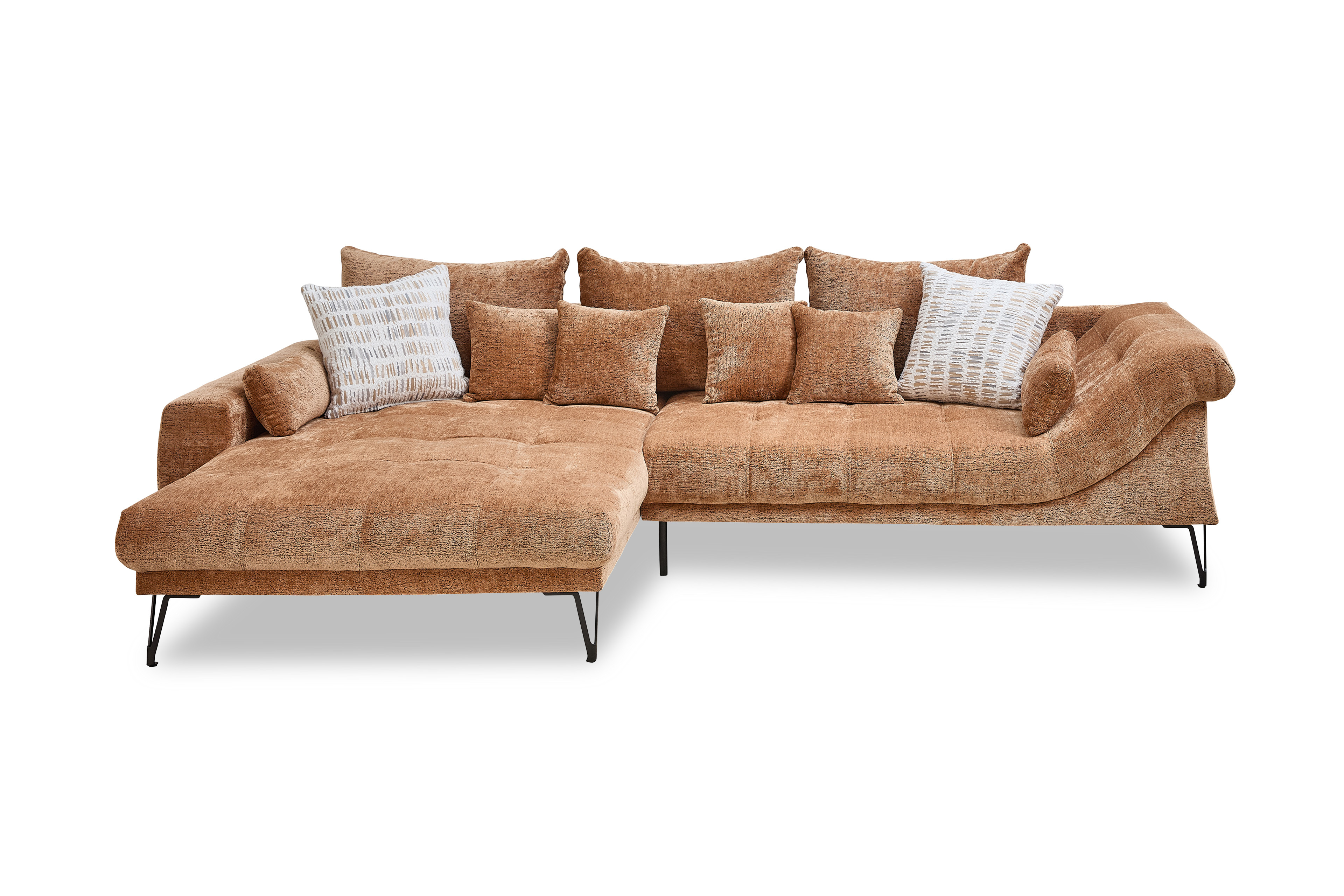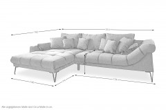 Erweitern Sie Ihr Wohnzimmer mit einem stilvollen Sitzmöbel, welches sich harmonisch in Ihren Einrichtungsstil einfügt und dabei eine behagliche Note versprüht - das Ecksofa Garda aus dem Hause Benformato Polstermöbel. Bezogen in einem hellbraunen Chenille-Flachgewebe, welches sich durch seine angenehm weiche Haptik sowie Pflegeleichtigkeit auszeichnet, und ausgestattet mit einer Vielzahl an Zierkissen, die Sie durch die Wahl des Bezugsmaterials sowie des Farbtons ganz an Ihren Geschmack anpassen können, zieht das Sofa stets alle Blicke auf sich und weckt den Wunsch, sich hier niederzulassen, um dem hektischen Alltag für einen Moment zu entkommen. Grazile Metallfüße in Schwarz vervollständigen das moderne Gesamtbild und schaffen durch ihre Höhe von etwa 19 cm, neben einer schwebenden Optik, ausreichend Bodenfreiheit für den Saugroboter. Die Zusammenstellung aus einer Recamiere und einem 2-Sitzer hält ein großzügiges Stellmaß von ca. 192 x 314 cm für Sie bereit - hier finden Sie ausreichend Platz für einen Nachmittagskaffee mit Ihrer besten Freundin oder für einen gemütlichen Fernsehabend mit Ihrer Familie, eingekuschelt in Ihre Lieblingsdecke und mit einer Schale Knabbereien in der Hand. Garda von Benformato - Ankommen. Fallenlassen. Wohlfühlen.