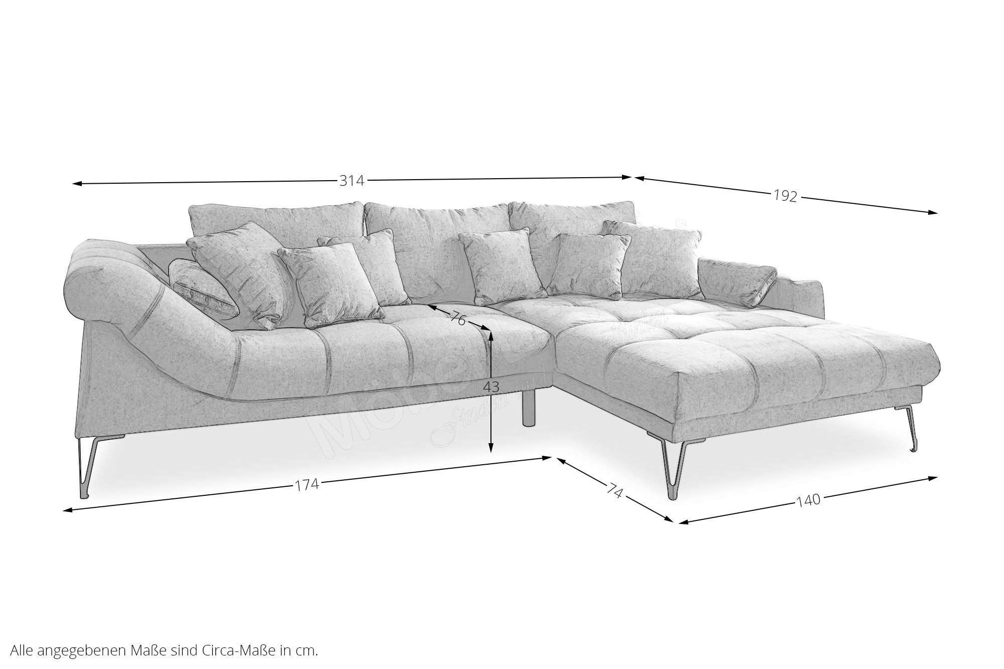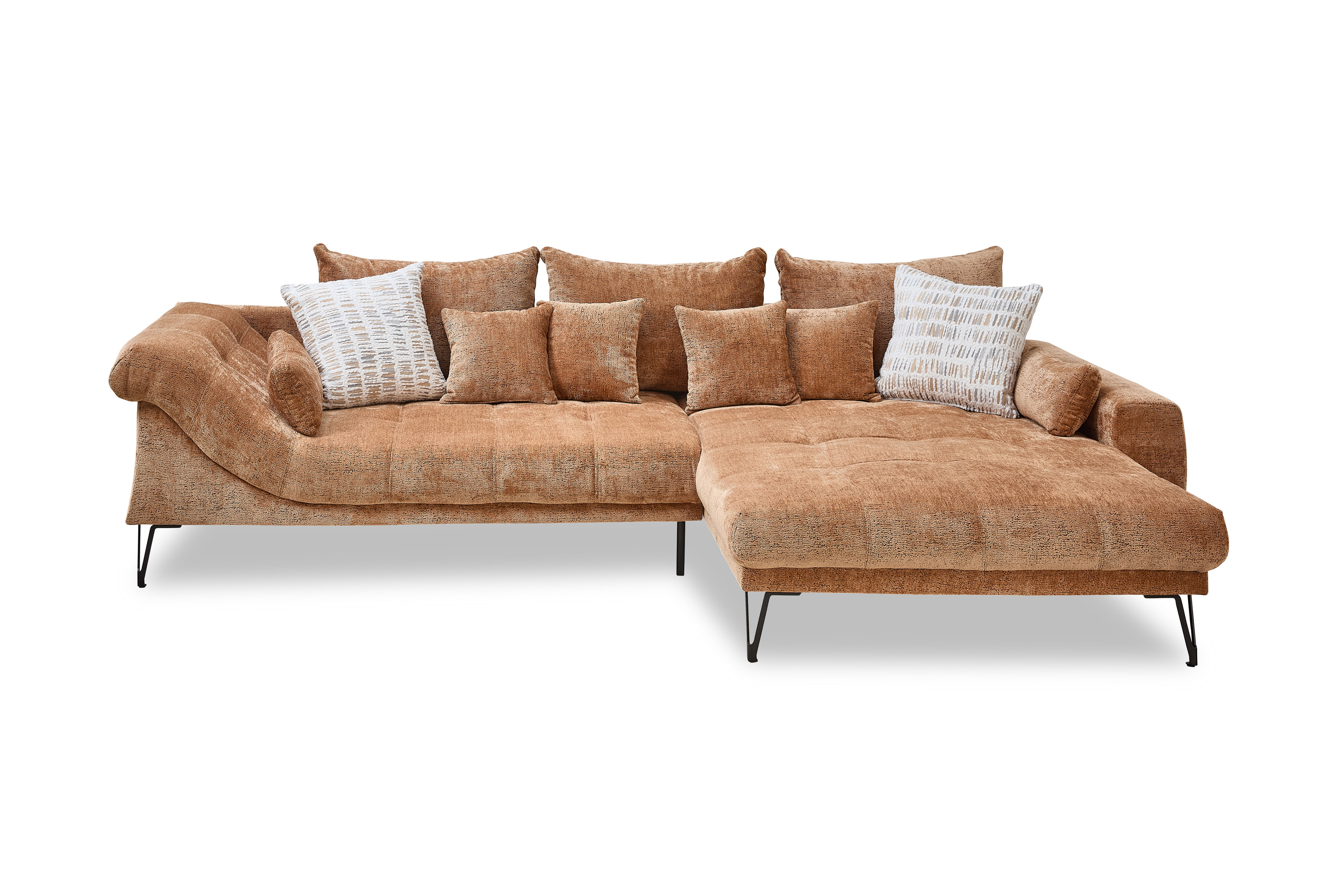 Erweitern Sie Ihr Wohnzimmer mit einem stilvollen Sitzmöbel, welches sich harmonisch in Ihren Einrichtungsstil einfügt und dabei eine behagliche Note versprüht - das Ecksofa Garda aus dem Hause Benformato Polstermöbel. Bezogen in einem hellbraunen Chenille-Flachgewebe, welches sich durch seine angenehm weiche Haptik sowie Pflegeleichtigkeit auszeichnet, und ausgestattet mit einer Vielzahl an Zierkissen, die Sie durch die Wahl des Bezugsmaterials sowie des Farbtons ganz an Ihren Geschmack anpassen können, zieht das Sofa stets alle Blicke auf sich und weckt den Wunsch, sich hier niederzulassen, um dem hektischen Alltag für einen Moment zu entkommen. Grazile Metallfüße in Schwarz vervollständigen das moderne Gesamtbild und schaffen durch ihre Höhe von etwa 19 cm, neben einer schwebenden Optik, ausreichend Bodenfreiheit für den Saugroboter. Die Zusammenstellung aus einem 2-Sitzer und einer Recamiere hält ein großzügiges Stellmaß von ca. 314 x 192 cm für Sie bereit - hier finden Sie ausreichend Platz für einen Nachmittagskaffee mit Ihrer besten Freundin oder für einen gemütlichen Fernsehabend mit Ihrer Familie, eingekuschelt in Ihre Lieblingsdecke und mit einer Schale Knabbereien in der Hand. Garda von Benformato - Ankommen. Fallenlassen. Wohlfühlen.