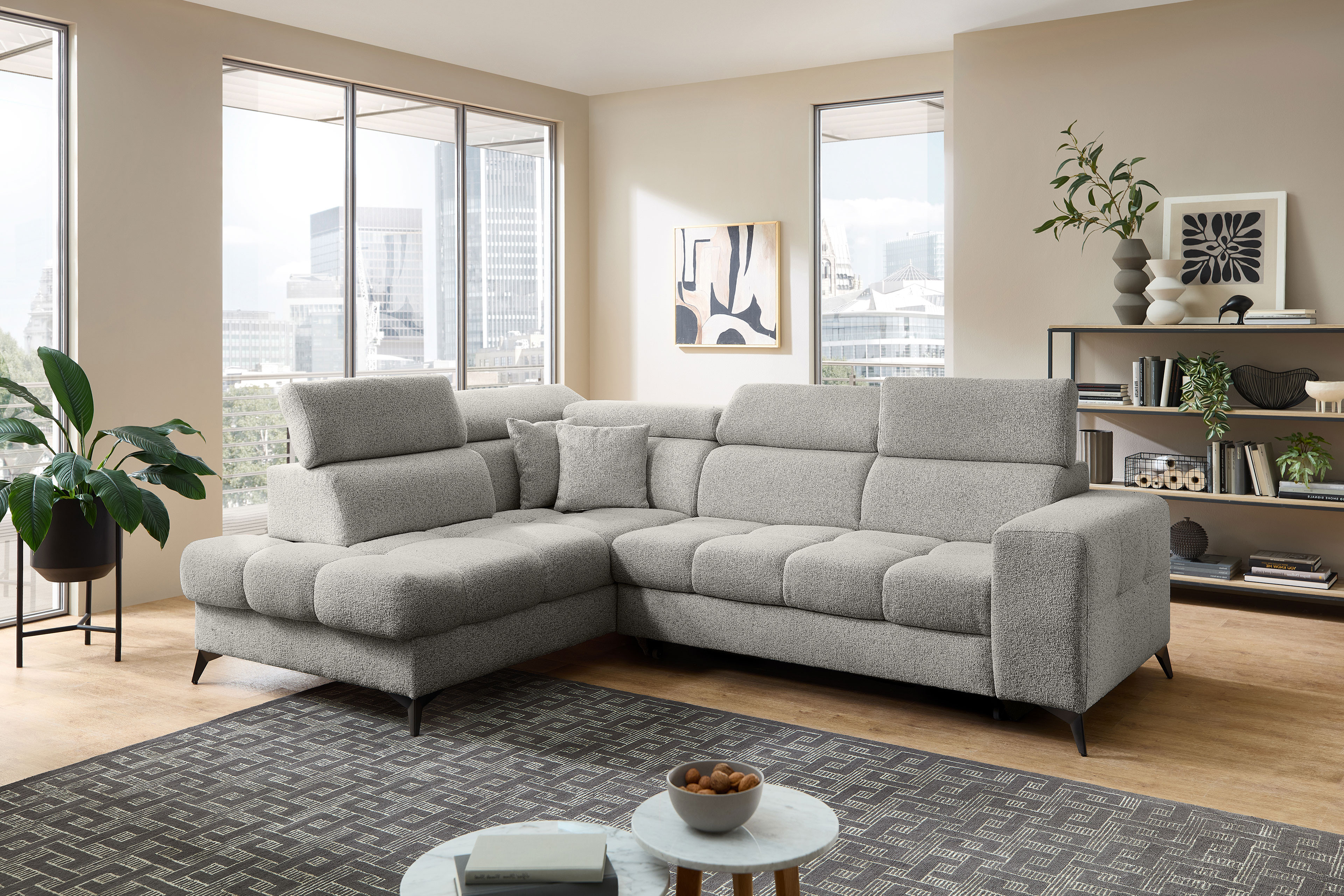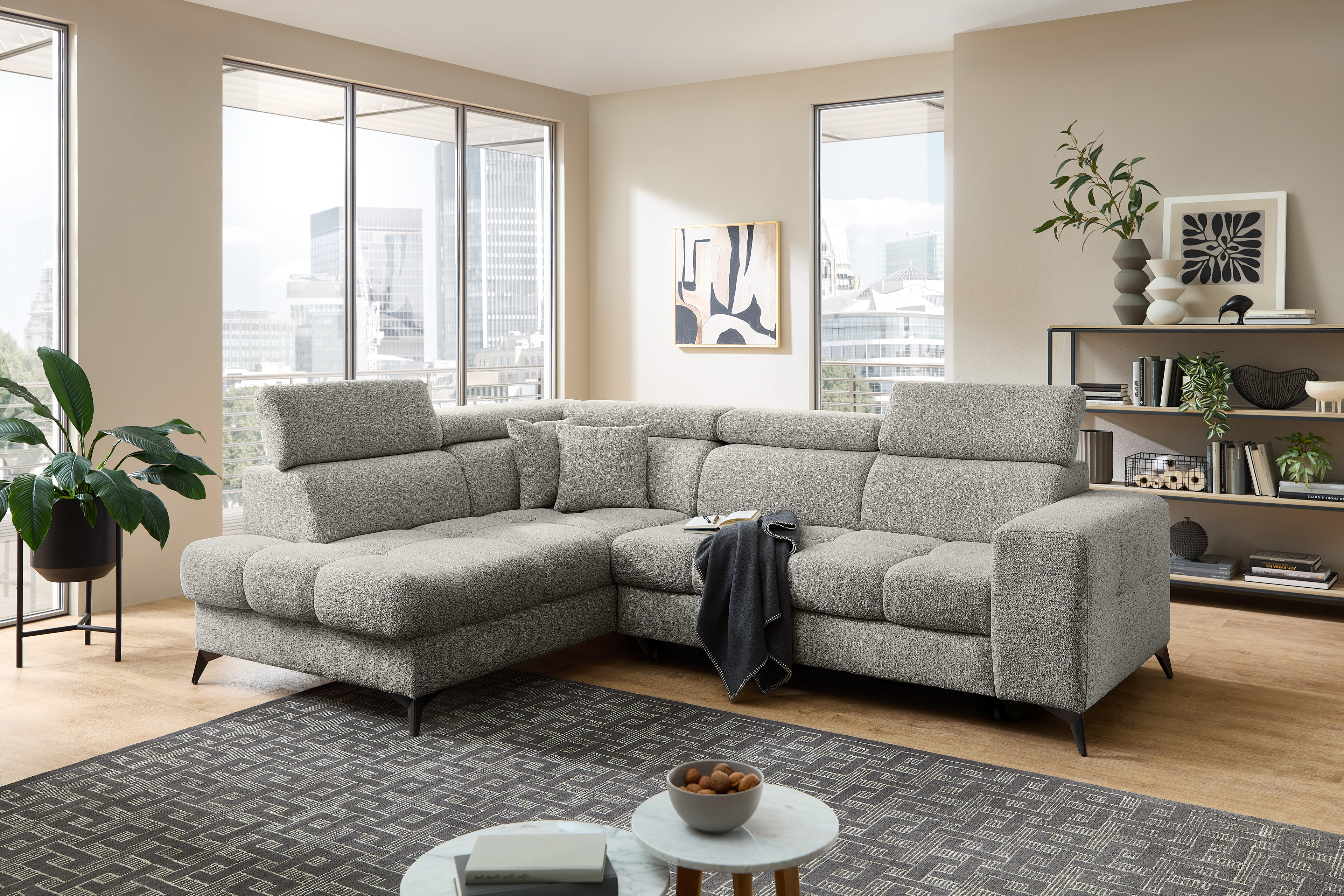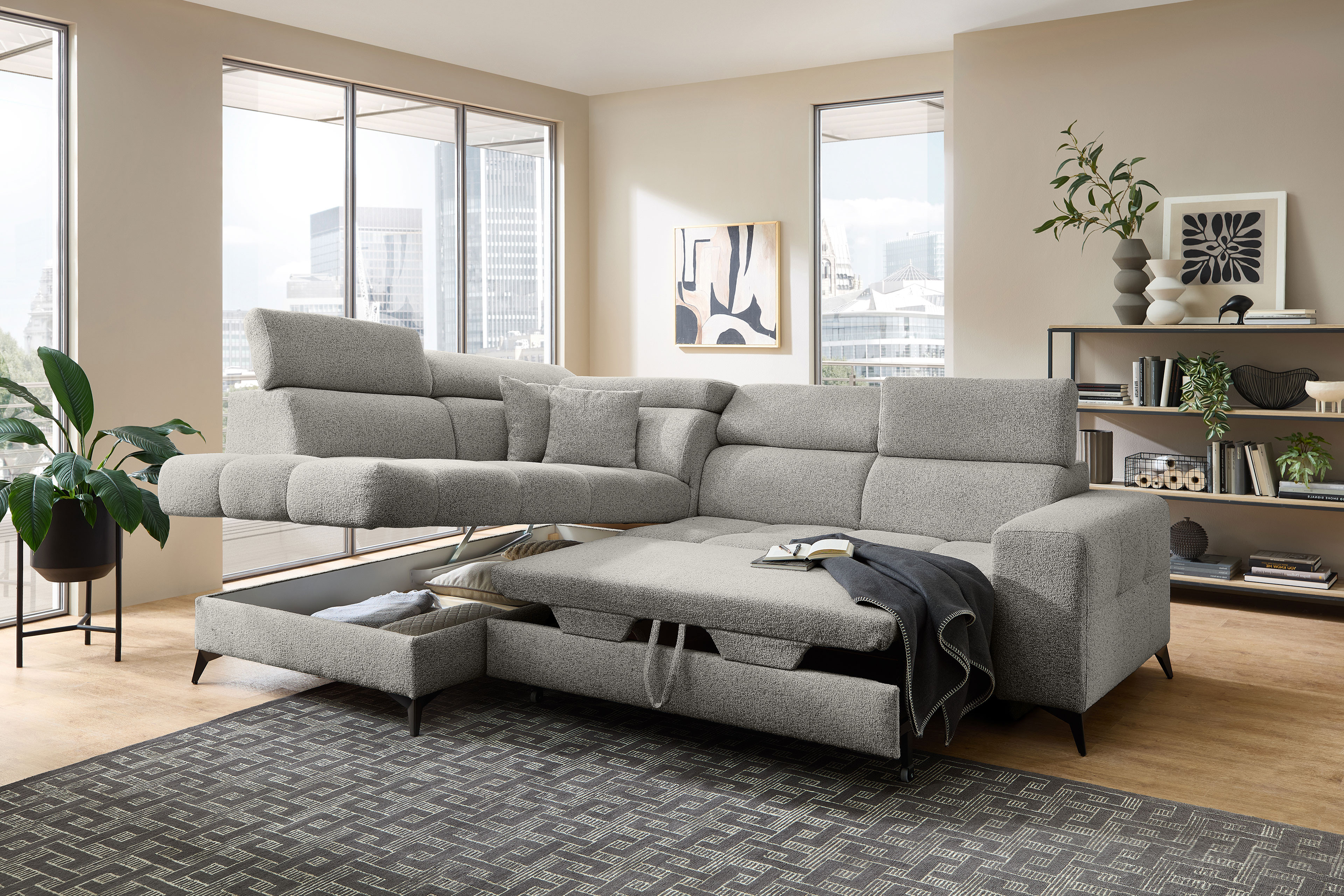 Für alle kostbaren Momente der Ruhe wurde die Polstergarnitur Gobi von Benformato kreiert. Sie ist weit mehr als nur ein Möbelstück - sie ist Ihr persönlicher Rückzugsort. Ob Sie einen geselligen, unvergesslichen Abend mit guten Freunden verbringen oder an einem verregneten Sonntag gemütlich vor dem Fernseher die Seele baumeln lassen möchten: Gobi empfängt Sie stets mit einer einladenden Umarmung. Der weiche Komfortschaum, der sanft von einer stützenden Wellenunterfederung getragen wird, macht die Garnitur zu einem Ort der puren Entspannung. Wenn der Nacken nach einem anstrengenden Tag nach Entlastung ruft, passen sich die flexibel verstellbaren Kopfteile perfekt an Ihre individuellen Bedürfnisse an. So finden Sie mühelos exakt die Position, in der Sie tief durchatmen und restlos loslassen können. Der helle, freundliche Strukturstoff bringt eine strahlende Leichtigkeit in Ihren Raum und fügt sich harmonisch in nahezu jeden Einrichtungsstil ein. Er umschmeichelt die Sinne und ist zugleich so strapazierfähig, dass er das echte Leben mühelos sowie dauerhaft begleitet. Wenn ein wunderbarer Abend einmal länger dauert und Ihre Gäste über Nacht bleiben, erweist sich Ihr neues Lieblingsstück als vollendeter Gastgeber. Mit der optionalen Schlaffunktion verwandeln Sie das Sofa mit nur wenigen Handgriffen in eine großzügige und gemütliche Liegefläche von etwa 204 x 120 cm. Die kuscheligen Decken und Kissen für Ihre Besucher zaubern Sie dabei ganz bequem aus dem hinzubuchbaren Bettkasten. Mit Gobi von Benformato machen Sie Ihr Wohnzimmer zum wahren Mittelpunkt Ihres Zuhauses.
