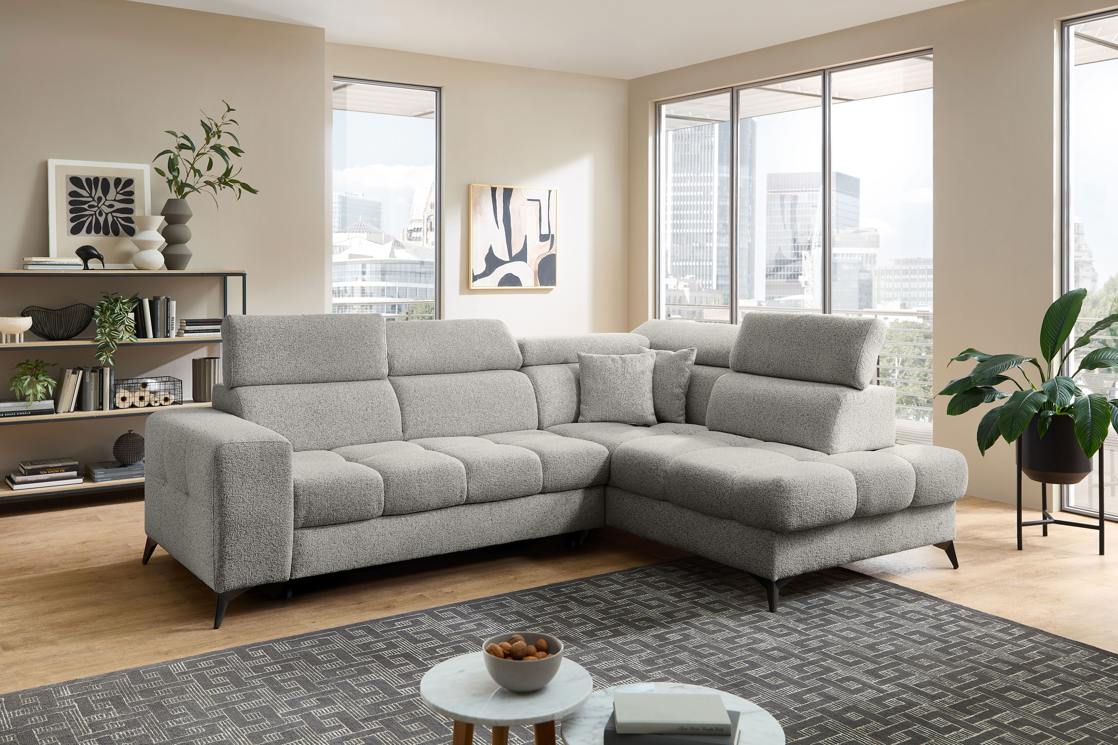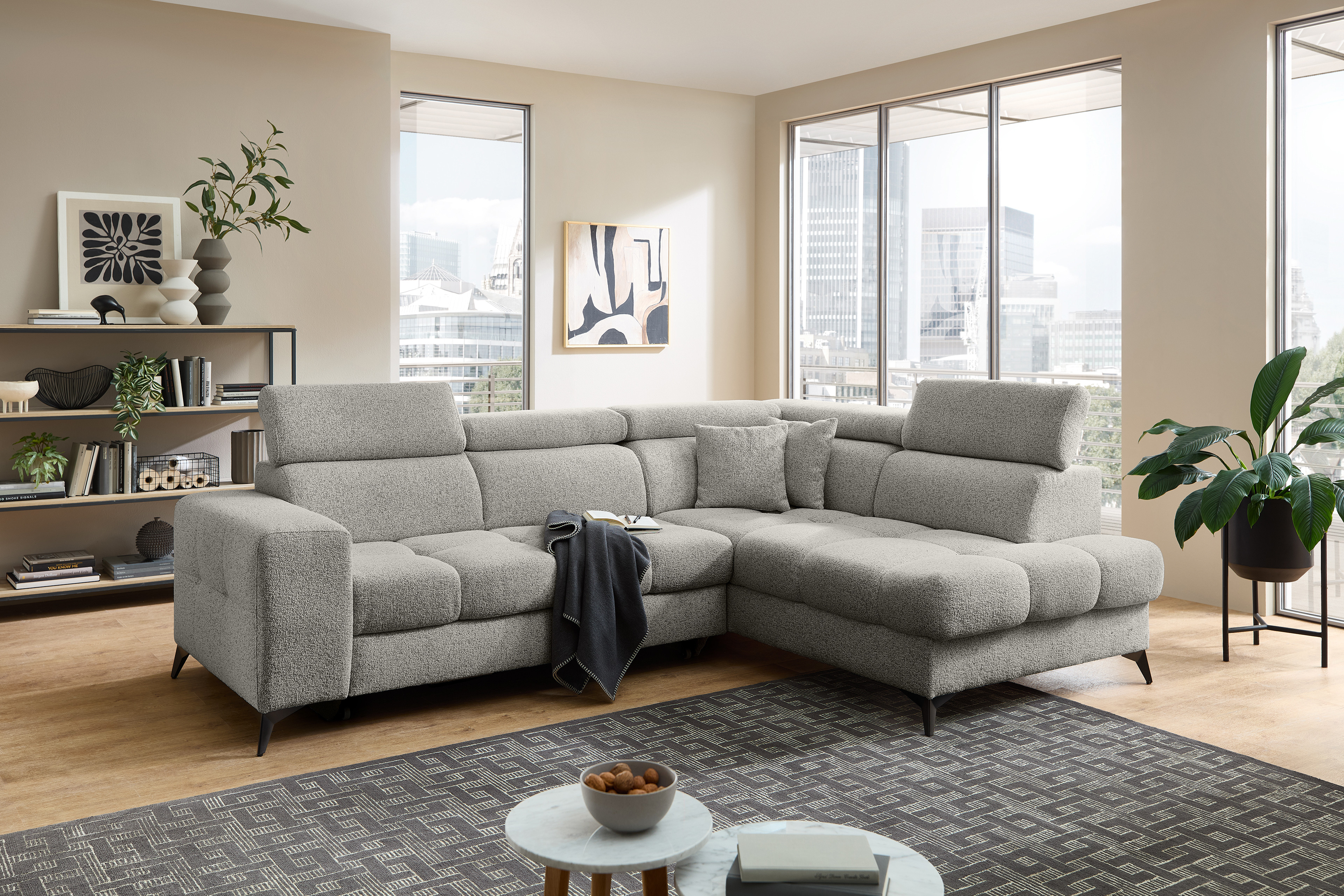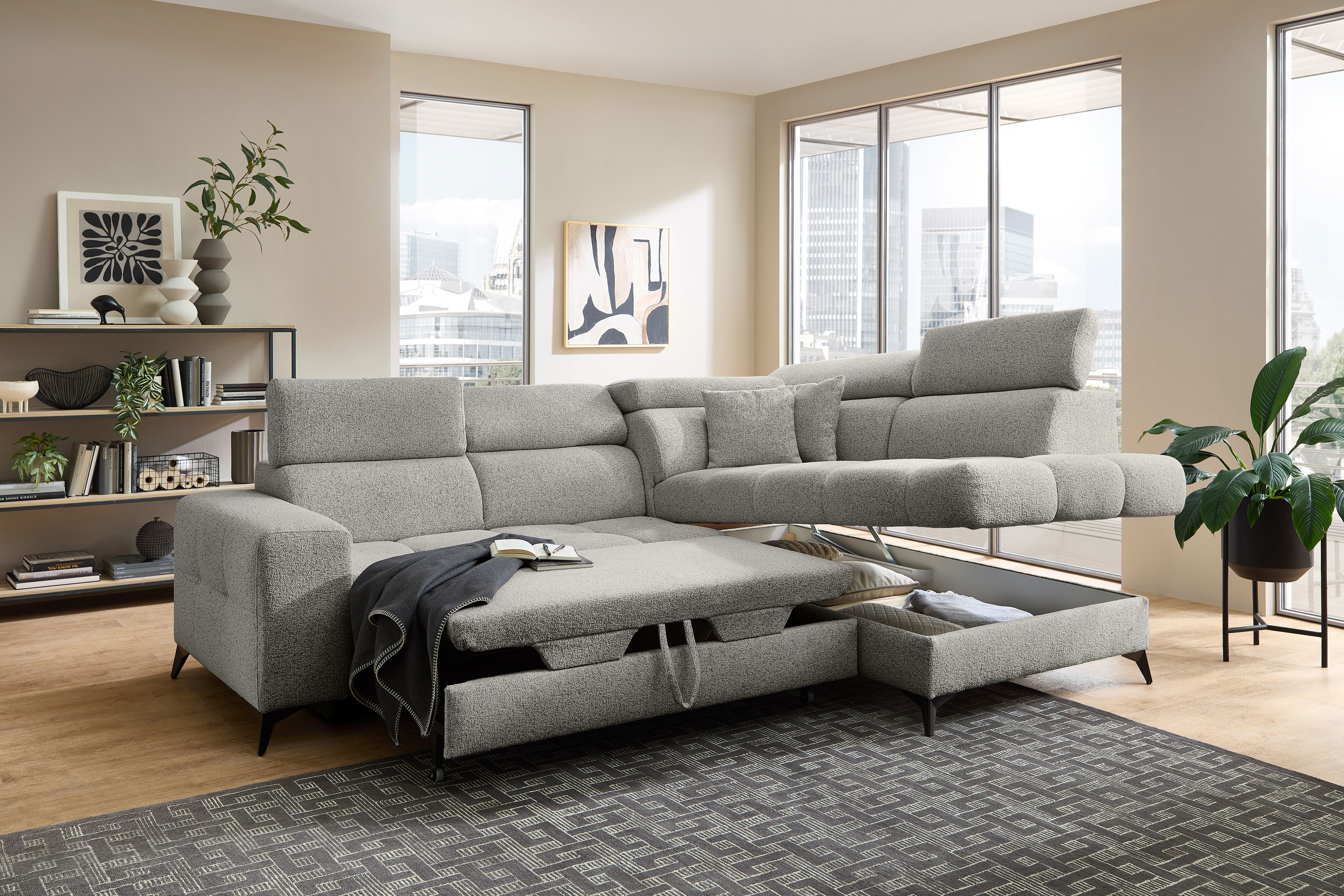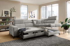 Für alle kostbaren Momente der Ruhe wurde die Polstergarnitur Gobi von Benformato kreiert. Sie ist weit mehr als nur ein Möbelstück - sie ist Ihr persönlicher Rückzugsort. Ob Sie einen geselligen, unvergesslichen Abend mit guten Freunden verbringen oder an einem verregneten Sonntag gemütlich vor dem Fernseher die Seele baumeln lassen möchten: Gobi empfängt Sie stets mit einer einladenden Umarmung. Der weiche Komfortschaum, der sanft von einer stützenden Wellenunterfederung getragen wird, macht die Garnitur zu einem Ort der puren Entspannung. Wenn der Nacken nach einem anstrengenden Tag nach Entlastung ruft, passen sich die flexibel verstellbaren Kopfteile perfekt an Ihre individuellen Bedürfnisse an. So finden Sie mühelos exakt die Position, in der Sie tief durchatmen und restlos loslassen können. Der helle, freundliche Strukturstoff bringt eine strahlende Leichtigkeit in Ihren Raum und fügt sich harmonisch in nahezu jeden Einrichtungsstil ein. Er umschmeichelt die Sinne und ist zugleich so strapazierfähig, dass er das echte Leben mühelos sowie dauerhaft begleitet. Wenn ein wunderbarer Abend einmal länger dauert und Ihre Gäste über Nacht bleiben, erweist sich Ihr neues Lieblingsstück als vollendeter Gastgeber. Mit der optionalen Schlaffunktion verwandeln Sie das Sofa mit nur wenigen Handgriffen in eine großzügige und gemütliche Liegefläche von etwa 204 x 120 cm. Die kuscheligen Decken und Kissen für Ihre Besucher zaubern Sie dabei ganz bequem aus dem hinzubuchbaren Bettkasten. Mit Gobi von Benformato machen Sie Ihr Wohnzimmer zum wahren Mittelpunkt Ihres Zuhauses.