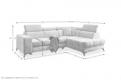 - Funktionen: Schlaffunktion - Liegefläche echt bezogen, Stauraum, Ottomane mit Sitztiefenverstellung (in der Ecke nicht möglich), Kopfteilverstellung