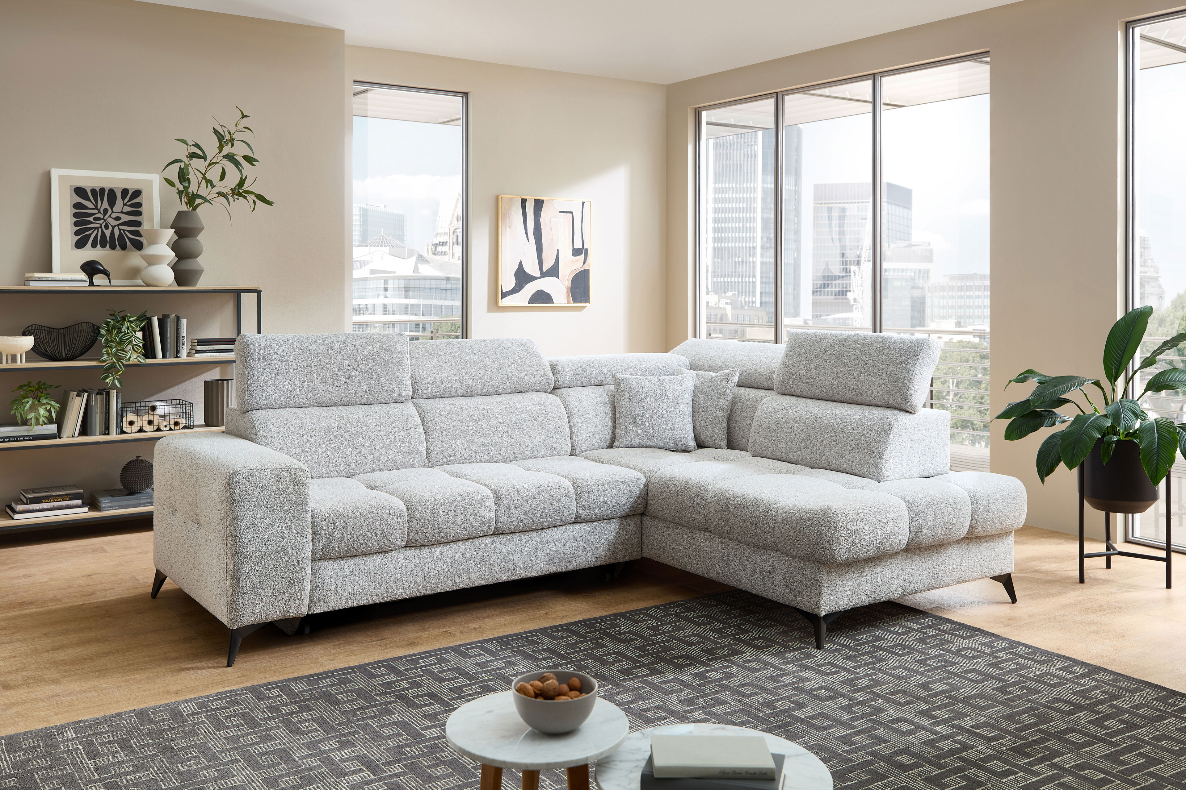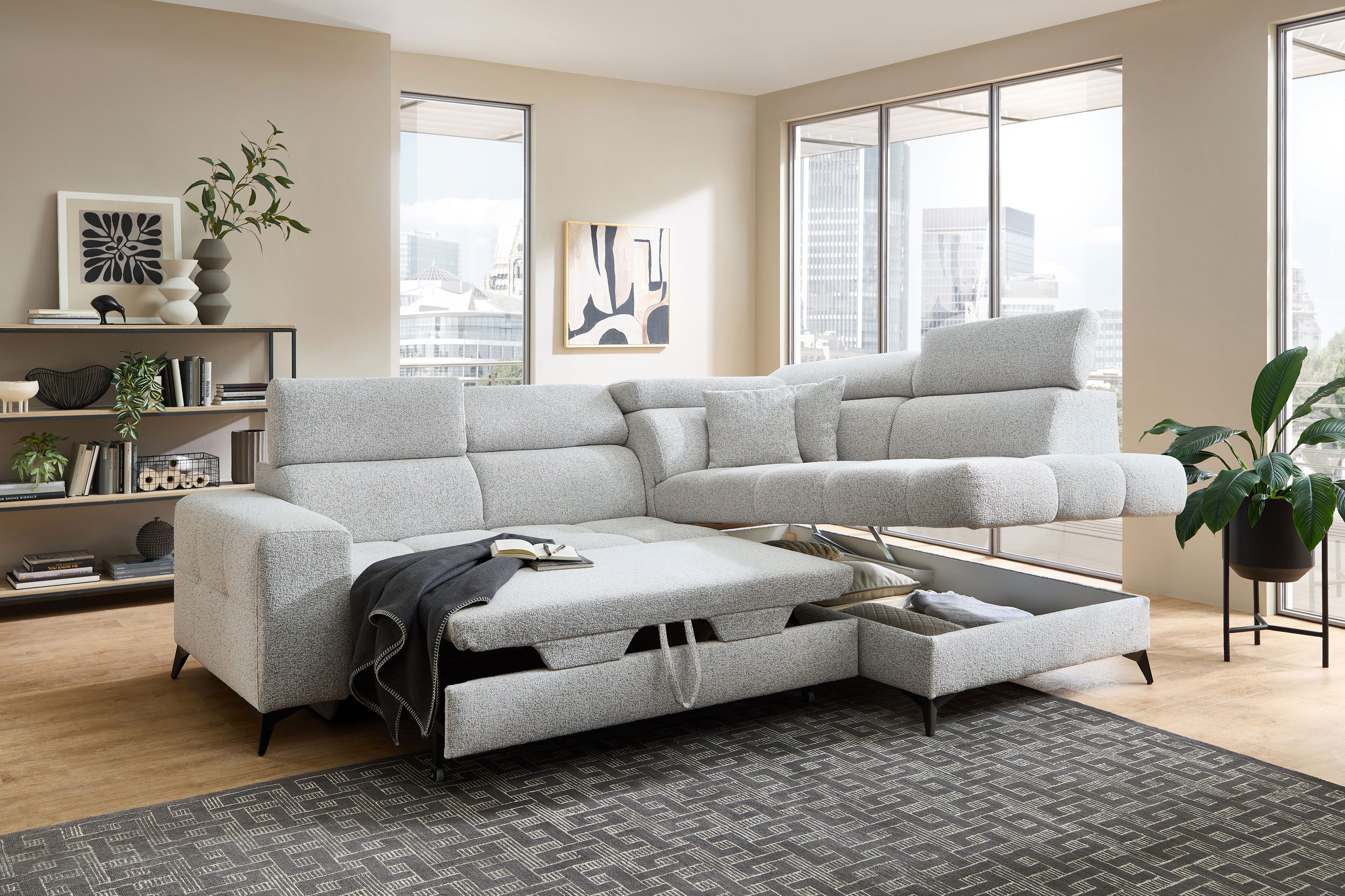 Für alle kostbaren Momente der Ruhe wurde die Polstergarnitur Gobi von Benformato kreiert. Sie ist weit mehr als nur ein Möbelstück - sie ist Ihr persönlicher Rückzugsort. Ob Sie einen geselligen, unvergesslichen Abend mit guten Freunden verbringen oder an einem verregneten Sonntag gemütlich vor dem Fernseher die Seele baumeln lassen möchten: Gobi empfängt Sie stets mit einer einladenden Umarmung. Der weiche Komfortschaum, der sanft von einer stützenden Wellenunterfederung getragen wird, macht die Garnitur zu einem Ort der puren Entspannung. Wenn der Nacken nach einem anstrengenden Tag nach Entlastung ruft, passen sich die flexibel verstellbaren Kopfteile perfekt an Ihre individuellen Bedürfnisse an. So finden Sie mühelos exakt die Position, in der Sie tief durchatmen und restlos loslassen können. Der helle, freundliche Strukturstoff bringt eine strahlende Leichtigkeit in Ihren Raum und fügt sich harmonisch in nahezu jeden Einrichtungsstil ein. Er umschmeichelt die Sinne und ist zugleich so strapazierfähig, dass er das echte Leben mühelos sowie dauerhaft begleitet. Wenn ein wunderbarer Abend einmal länger dauert und Ihre Gäste über Nacht bleiben, erweist sich Ihr neues Lieblingsstück als vollendeter Gastgeber. Mit der optionalen Schlaffunktion verwandeln Sie das Sofa mit nur wenigen Handgriffen in eine großzügige und gemütliche Liegefläche von etwa 204 x 120 cm. Die kuscheligen Decken und Kissen für Ihre Besucher zaubern Sie dabei ganz bequem aus dem hinzubuchbaren Bettkasten. Mit Gobi von Benformato machen Sie Ihr Wohnzimmer zum wahren Mittelpunkt Ihres Zuhauses.