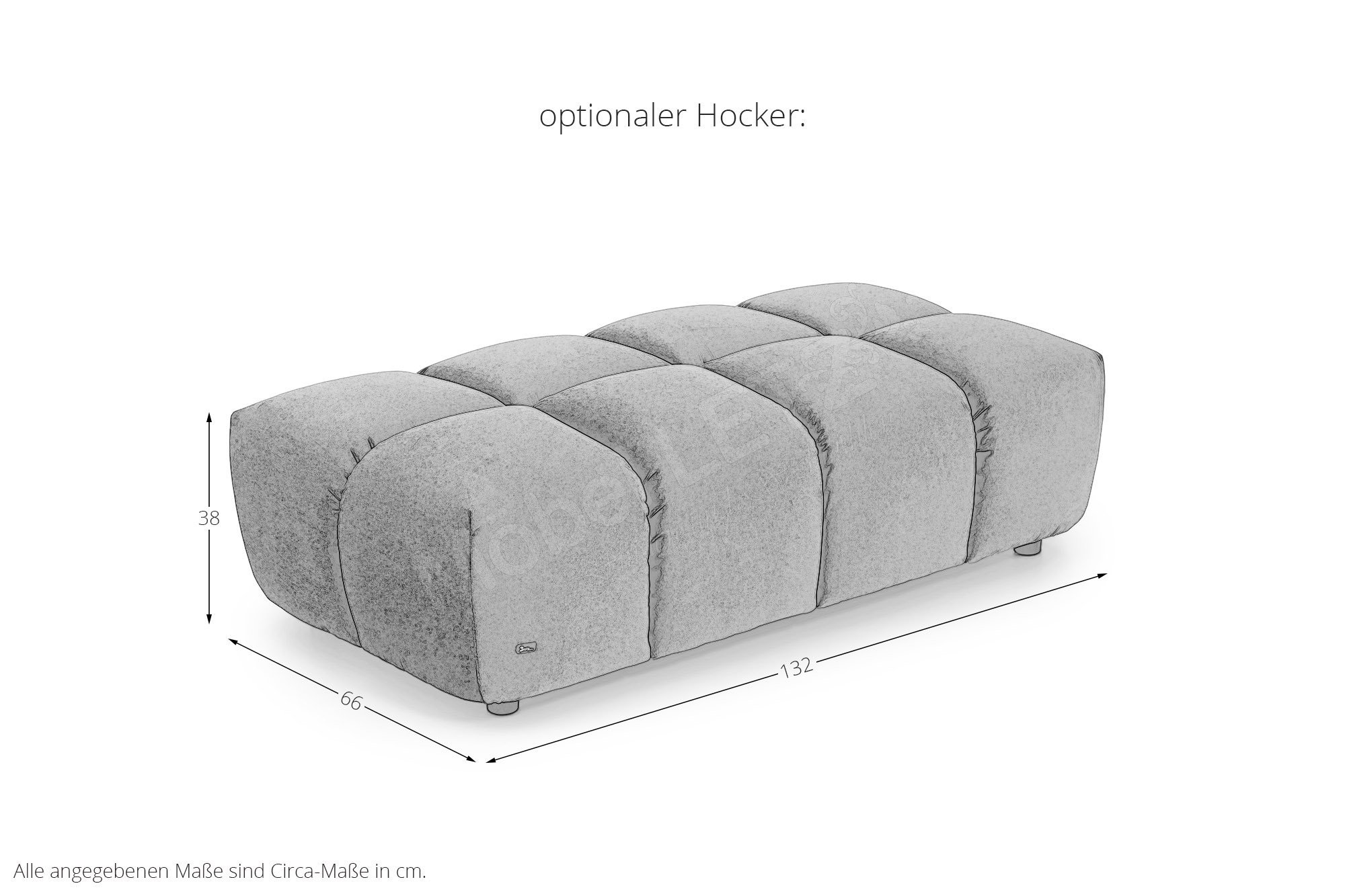 Eine starke, unregelmäßige Faltenbildung stellt keinen Qualitätsmangel dar, sondern ist modellbedingt gewollt und eine warentypische Eigenschaft. Einige Bezüge (Velours, Samt, Viskose) weisen starke Schattierungen auf und changieren je nach Blickrichtung. Das heißt, bei unterschiedlichen Beleuchtungs- sowie Blickwinkeln kommt es zu einem Farbwechsel bzw. zu einer farblichen Veränderung des Bezuges, dies ist eine warentypische Eigenschaft und stellt keinen Beanstandungsgrund dar. Die Anbauteile werden mit Elementverbindern verbunden. Alle Elemente - mit oder ohne Armlehne(n) - sind an allen Seiten sauber verpolstert und können als Abschlussteil, als Zwischenteil und als einzelstehendes Teil verwendet werden. Anbau- und Davorstellhocker unterscheiden sich in der Florrichtung. Gedreht schattieren sie deutlich gegen die anderen Teile.
