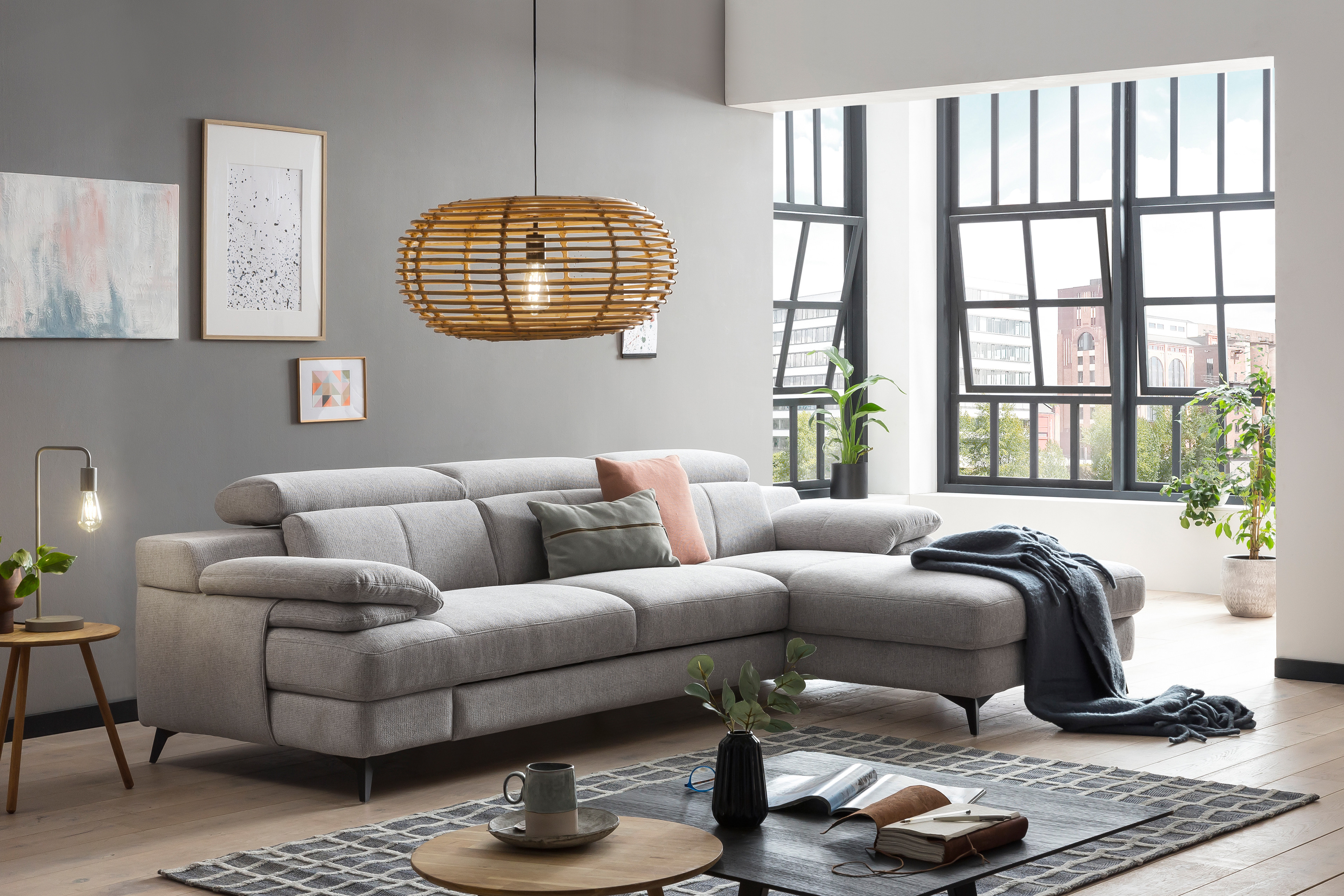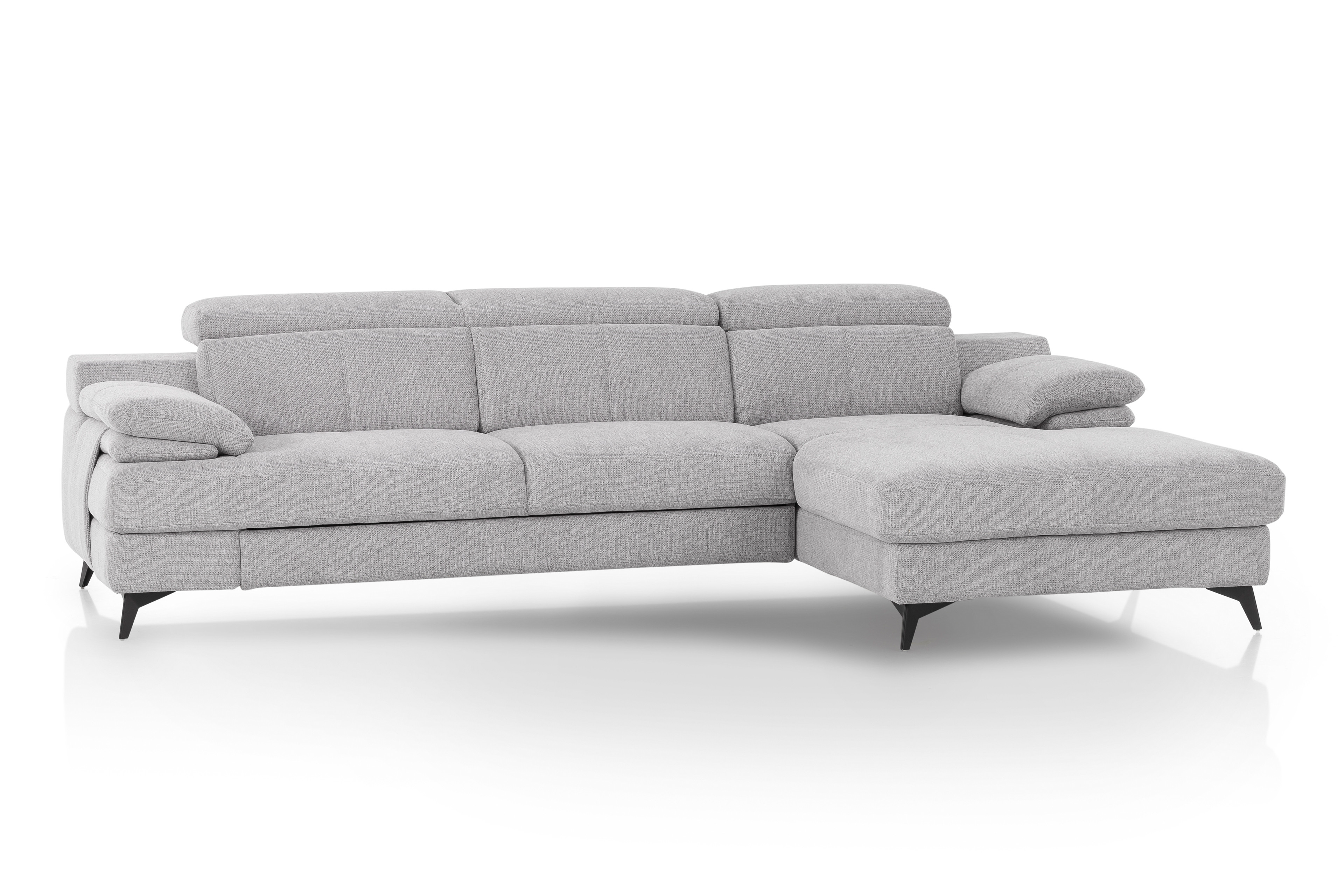 Tür zu, Schuhe aus, rauf auf´s Sofa – nach einem anstrengenden Arbeitstag braucht man nichts weiter als den heimischen Lieblingsplatz zum Beinehochlegen und Abschalten. Die moderne Eckgarnitur Titus-LE26 von Cotta, die in einem hellgrauen Chenille-Flachgewebe bezogen ist und auf schwarzen Metallfüßen steht, ist gern Ihr treuer Partner für jegliche Form der Erholung. Bestehend aus einem 3-Sitzer sowie einer Recamiere, welche zusammen ein Stellmaß von ca. 291 x 178 cm ergeben, können Sie sich am Abend ganz Ihrer Lieblingsserie widmen und den Tag nach Ihren Wünschen ausklingen lassen. Eine nosagunterfederte Polsterung liefert dafür den nötigen Sitzkomfort, welcher durch die bereits im Angebot enthaltene Kopfteilverstellung wohltuend verstärkt wird. Gern können Sie sich im weiteren Bestellprozess für eine praktische Schlaffunktion, die eine traumhafte Liegefläche von ca. 215 x 122 cm eröffnet, sowie einen nützlichen Bettkasten entscheiden, welcher alle benötigten Übernachtungsutensilien wie Decken und Kissen gut sortiert für Sie aufbewahrt. Ferner verfügt Titus-LE26 über einen echt bezogenen Rücken und eröffnet Ihnen so die Möglichkeit, Ihre neue Wohlfühloase auf verschiedenste Art sowie Weise im Wohnraum zu platzieren. Sollte der Farbton der Couch nicht Ihren Vorstellungen entsprechen, so können Sie sich unter der Rubrik "Wunschbezug" in Ruhe umsehen – der Hersteller verfügt über eine umfangreiche Stoff- und Bezugskollektion, aus der Sie sicher Ihren persönlichen Favoriten entdecken werden. Definieren Sie Ihre Vorstellung von Komfort neu und kreieren Sie Ihren Wohnraum elegant – mit Titus-LE26 aus dem Hause COTTA Polstermöbel.