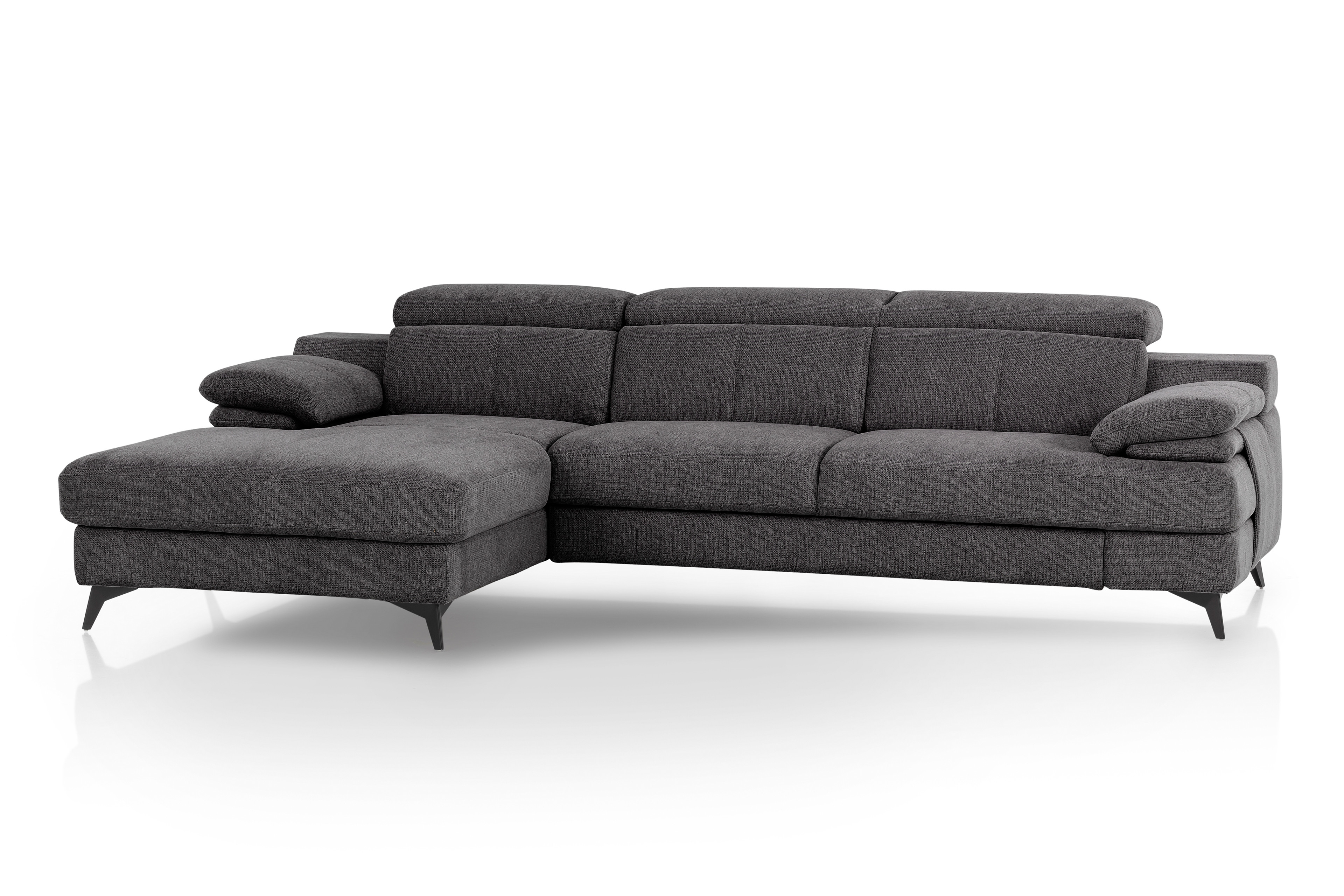 Tür zu, Schuhe aus, rauf auf´s Sofa – nach einem anstrengenden Arbeitstag braucht man nichts weiter als den heimischen Lieblingsplatz zum Beinehochlegen und Abschalten. Die moderne Eckgarnitur Titus-LE26 von Cotta, die in einem dunkelgrauen Chenille-Flachgewebe bezogen ist und auf schwarzen Metallfüßen steht, ist gern Ihr treuer Partner für jegliche Form der Erholung. Bestehend aus einer Recamiere sowie einem 3-Sitzer, welche zusammen ein Stellmaß von ca. 178 x 291 cm ergeben, können Sie sich am Abend ganz Ihrer Lieblingsserie widmen und den Tag nach Ihren Wünschen ausklingen lassen. Eine nosagunterfederte Polsterung liefert dafür den nötigen Sitzkomfort, welcher durch die bereits im Angebot enthaltene Kopfteilverstellung wohltuend verstärkt wird. Gern können Sie sich im weiteren Bestellprozess für eine praktische Schlaffunktion, die eine traumhafte Liegefläche von ca. 215 x 122 cm eröffnet, sowie einen nützlichen Bettkasten entscheiden, welcher alle benötigten Übernachtungsutensilien wie Decken und Kissen gut sortiert für Sie aufbewahrt. Ferner verfügt Titus-LE26 über einen echt bezogenen Rücken und eröffnet Ihnen so die Möglichkeit, Ihre neue Wohlfühloase auf verschiedenste Art sowie Weise im Wohnraum zu platzieren. Sollte der Farbton der Couch nicht Ihren Vorstellungen entsprechen, so können Sie sich unter der Rubrik "Wunschbezug" in Ruhe umsehen – der Hersteller verfügt über eine umfangreiche Stoff- und Bezugskollektion, aus der Sie sicher Ihren persönlichen Favoriten entdecken werden. Definieren Sie Ihre Vorstellung von Komfort neu und kreieren Sie Ihren Wohnraum elegant – mit Titus-LE26 aus dem Hause COTTA Polstermöbel.