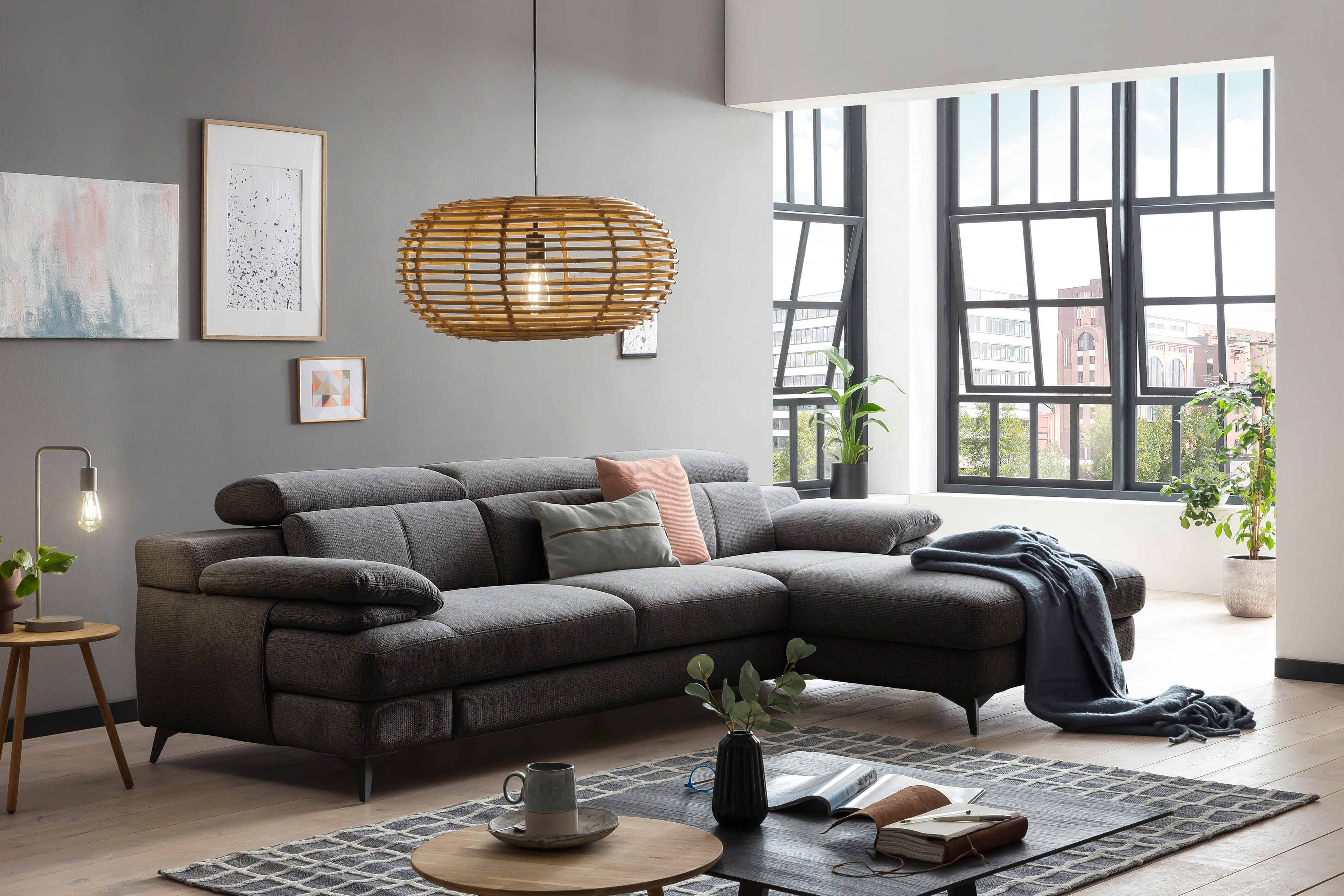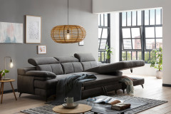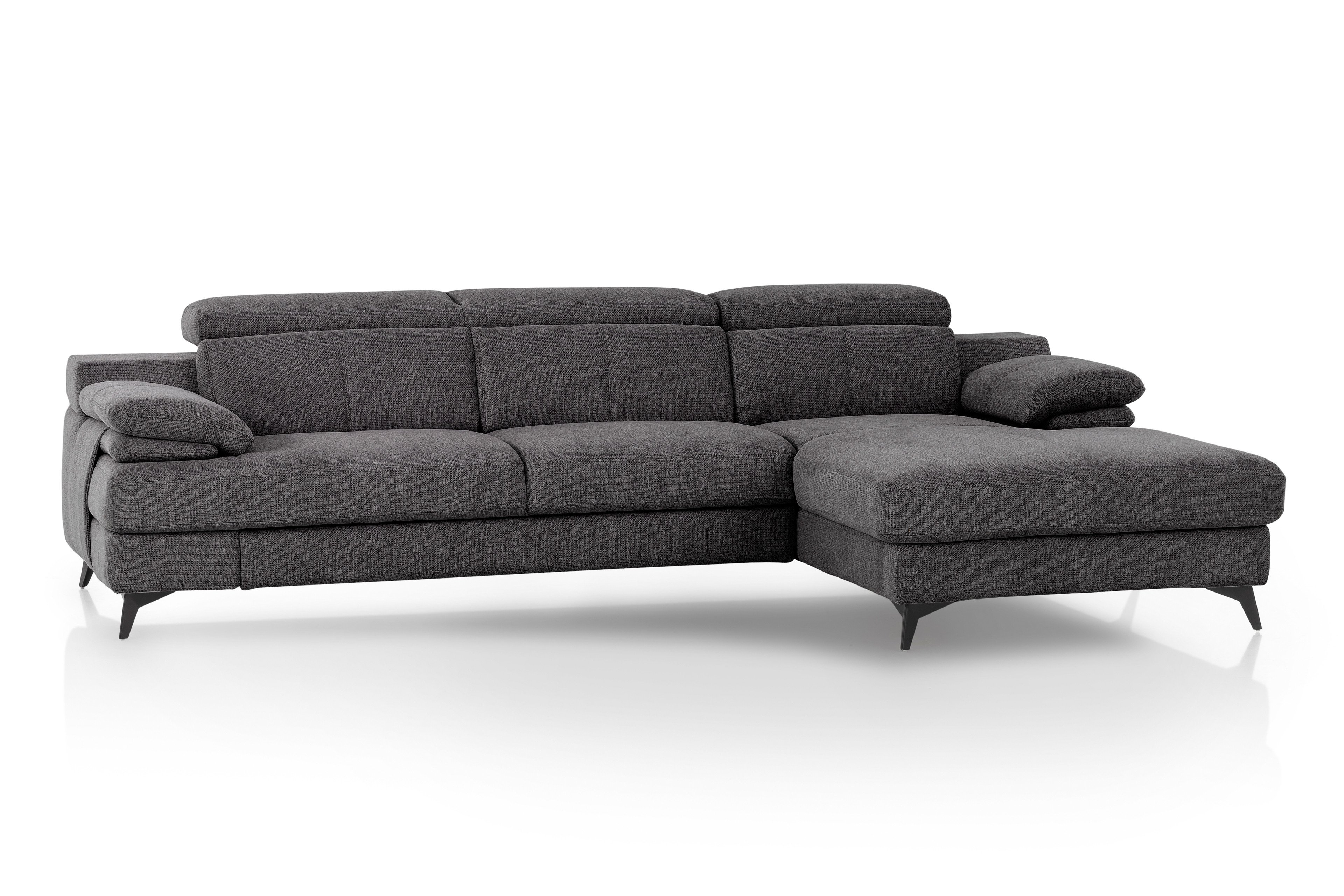 Tür zu, Schuhe aus, rauf auf´s Sofa – nach einem anstrengenden Arbeitstag braucht man nichts weiter als den heimischen Lieblingsplatz zum Beinehochlegen und Abschalten. Die moderne Eckgarnitur Titus-LE26 von Cotta, die in einem dunkelgrauen Chenille-Flachgewebe bezogen ist und auf schwarzen Metallfüßen steht, ist gern Ihr treuer Partner für jegliche Form der Erholung. Bestehend aus einem 3-Sitzer sowie einer Recamiere, welche zusammen ein Stellmaß von ca. 291 x 178 cm ergeben, können Sie sich am Abend ganz Ihrer Lieblingsserie widmen und den Tag nach Ihren Wünschen ausklingen lassen. Eine nosagunterfederte Polsterung liefert dafür den nötigen Sitzkomfort, welcher durch die bereits im Angebot enthaltene Kopfteilverstellung wohltuend verstärkt wird. Gern können Sie sich im weiteren Bestellprozess für eine praktische Schlaffunktion, die eine traumhafte Liegefläche von ca. 215 x 122 cm eröffnet, sowie einen nützlichen Bettkasten entscheiden, welcher alle benötigten Übernachtungsutensilien wie Decken und Kissen gut sortiert für Sie aufbewahrt. Ferner verfügt Titus-LE26 über einen echt bezogenen Rücken und eröffnet Ihnen so die Möglichkeit, Ihre neue Wohlfühloase auf verschiedenste Art sowie Weise im Wohnraum zu platzieren. Sollte der Farbton der Couch nicht Ihren Vorstellungen entsprechen, so können Sie sich unter der Rubrik "Wunschbezug" in Ruhe umsehen – der Hersteller verfügt über eine umfangreiche Stoff- und Bezugskollektion, aus der Sie sicher Ihren persönlichen Favoriten entdecken werden. Definieren Sie Ihre Vorstellung von Komfort neu und kreieren Sie Ihren Wohnraum elegant – mit Titus-LE26 aus dem Hause COTTA Polstermöbel.