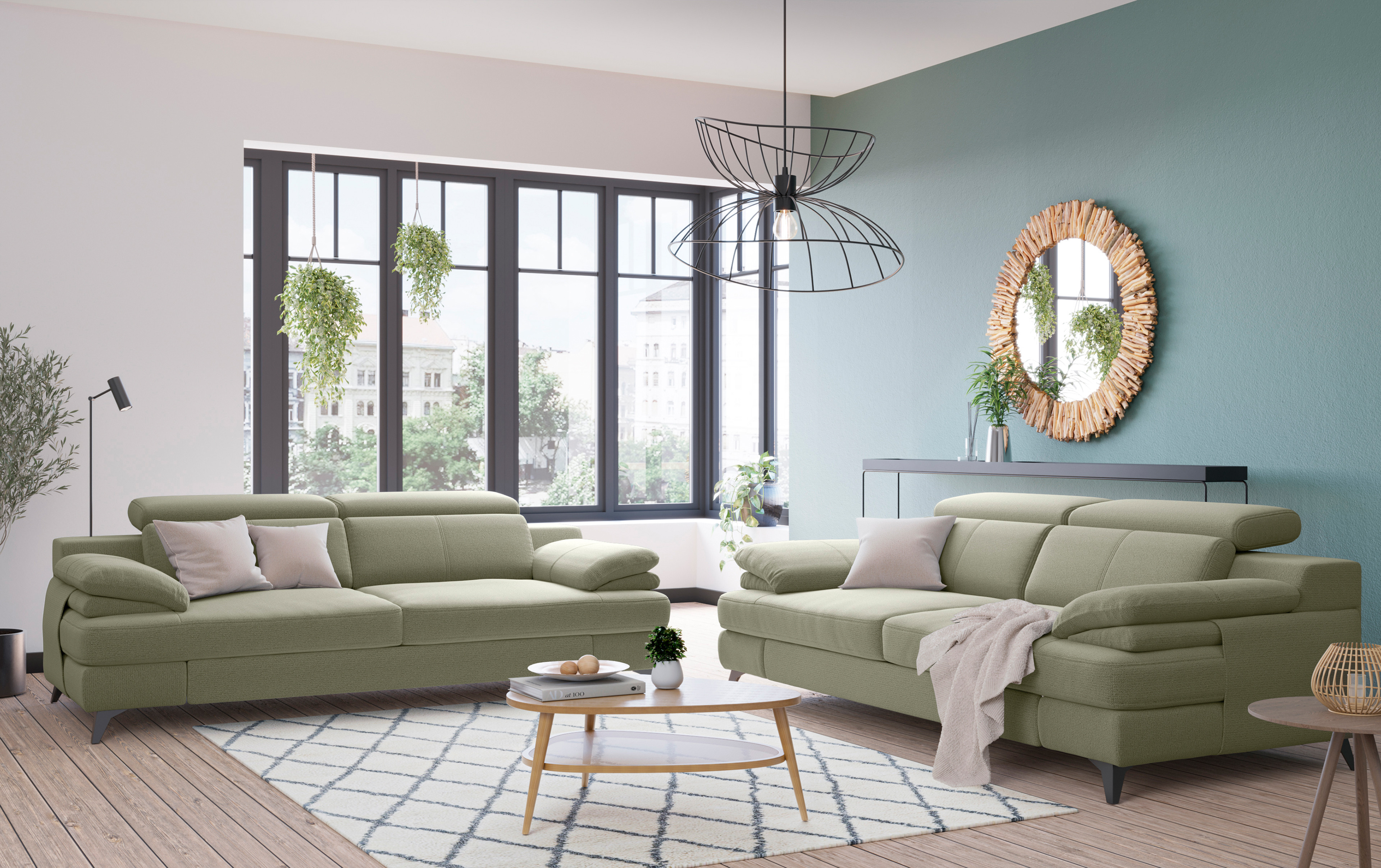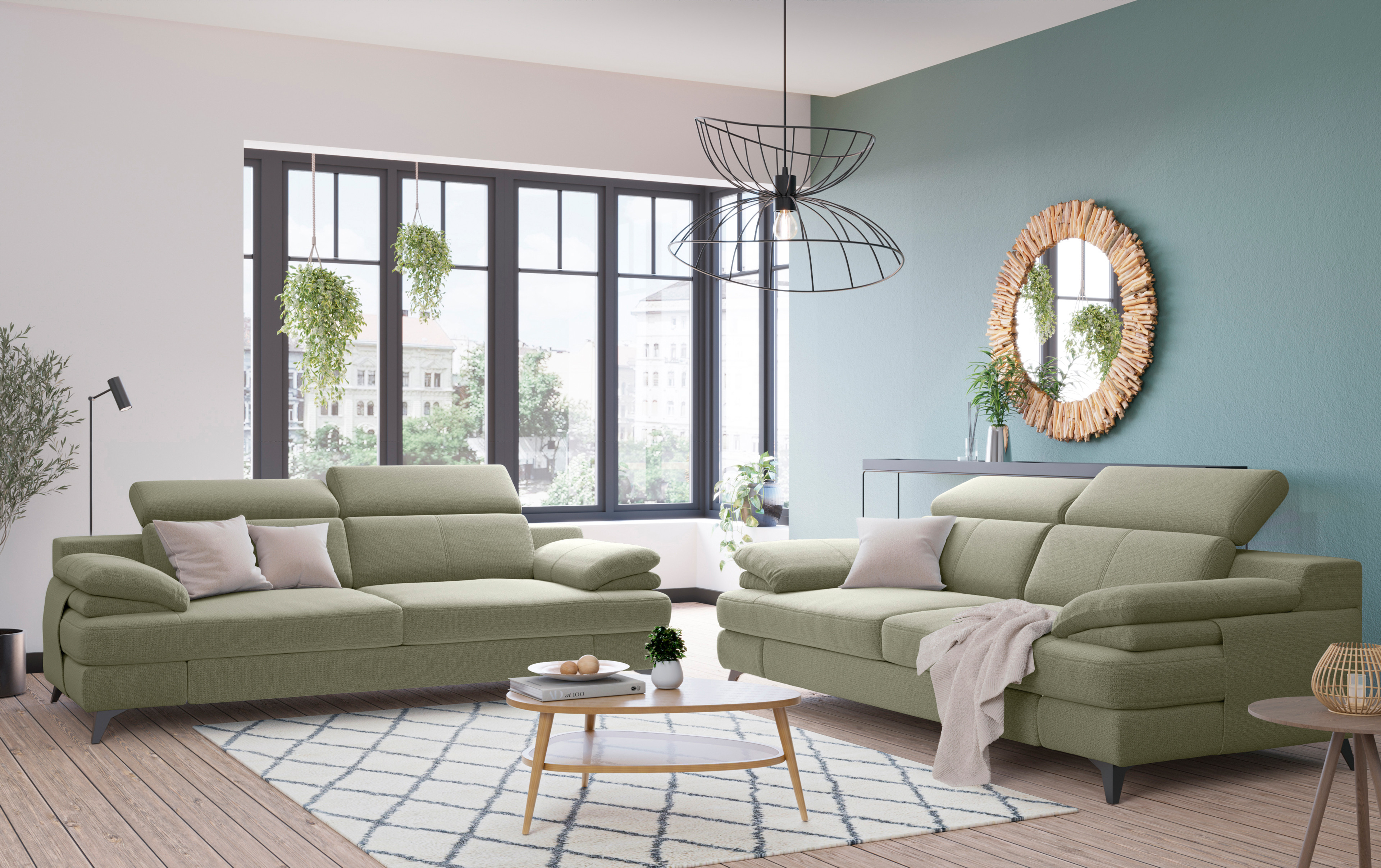 Hier kommt Ihr neue Wohlfühloase: Angenehm weiche Stoffe in attraktiven Trendfarben und ein Modell in modernem Design – das ist Titus-LE26 von COTTA, mit diesem Polster-Duo lassen Sie Ihr Wohnzimmer im zeitgemäßen Stil erstrahlen. Der stylishe Look und die Formgebung machen beide ganz nebenbei auch noch zu einem wahren Eyecatcher. Mit einem 3-Sitzer der mit einer Breite von ca. 225 cm aufwarten kann sowie einem nur unwesentlich kleineren 2-Sitzer mit einer Breite von etwa 205 cm und einer Sitztiefe von etwa 58 cm bietet Ihnen Titus-LE26 ausreichend Platz zum Sitzen, Liegen sowie Relaxen – pure Entspannung ist hier vorprogrammiert. Mit einer Polsterung auf einer Nosagfederung kommt der Sitzkomfort auch nicht zu kurz und den erholsamen Stunden steht nichts mehr im Weg. Durch die zeitlose Optik sowie die jeweils echt bezogenen Rücken ist dieses Modell zudem vielseitig kombinierbar, frei im Raum stellbar und passt sich verschiedenen Einrichtungsstilen problemlos an. Als besonderer Clou verfügen beide Sofas noch über eine manuelle Kopfteilverstellung. Sie wünschen sich einen anderen Farbton? Mit einem Klick auf den Menüpunkt "Farbe ändern" können Sie sich in aller Ruhe die weiteren Bezugsmöglichkeiten des Herstellers anschauen und sich für Ihren Favoriten entscheiden. Erleben Sie gemütliche Stunden und lassen Sie sich von der angesagten Erscheinung sowie dem hohen Komfort begeistern. Bestellen Sie jetzt das Modell Titus-LE26 von COTTA Polstermöbel und verwandeln Sie Ihr Wohnzimmer in einen Ort der Entspannung.