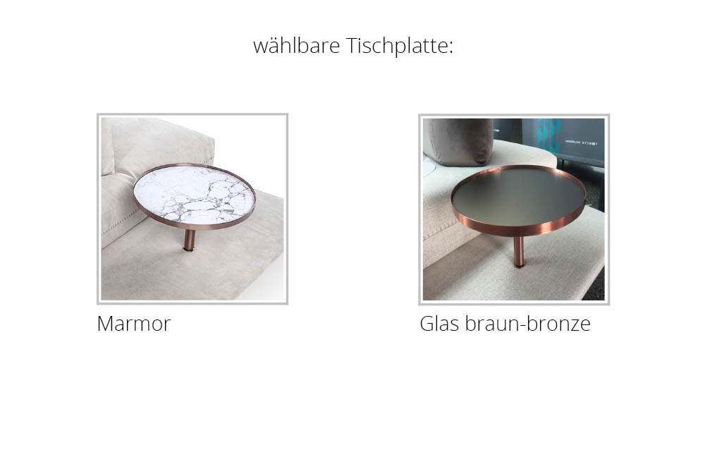 Ein Möbelstück für Designliebhaber, die das Extravagante suchen - das Modell Gianduiotto des italienischen Herstellers Calia Italia, mit Sitz im wunderschönen Matera, eine Stadt, die für ihre in den Fels gehauenen Höhlensiedlungen bekannt ist - so einzigartig, wie auch dieses bezaubernde Einzelsofa, das mit einer Breite von etwa 245 cm für alle Räumlichkeiten bestens geeignet ist. Die Kombination aus einem cremefarbenen Velours, welches mit einer attraktiven Dekonaht in einem farblich abgesetzten Braunton verziert ist, sowie kupferfarbenen Metallfüßen sorgt für ein nobles Erscheinungsbild mit Wiedererkennungswert und wird jeden Betrachter direkt in seinen Bann ziehen. Das besondere Highlight bei diesem Möbelstück ist der Metalltisch, der ebenfalls in Kupfer gehalten ist sowie eine marmorierte Tischplatte hat und eine perfekte Abstellmöglichkeit für Getränke oder Fingerfood darstellt. Der perfekte Rückzugsort zum entspannten Lesen und TV schauen, aber auch sehr gut denkbar in Büroräumlichkeiten, zum Abhalten des Meetings mit dem Geschäftspartner bei hervorragendem Sitzkomfort, denn hierfür sorgt eine hochwertige Polsterung aus einem Polyätherschaum, überzogen mit hochelastischen synthetischen Faserflocken, ruhend auf einer Gurtunterfederung. Zwei Rückenlehnen, die beliebig positioniert werden können, schenken ein Höchstmaß an Komfort, der durch Hinzubuchen des Armlehnenkissens, welches zwischen den Sitzeinheiten platziert werden kann, zusätzlich unterstrichen wird. Lassen auch Sie eleganten Charme in Ihrem Zuhause einziehen mit dem Calia Italia Designersofa Gianduiotto.