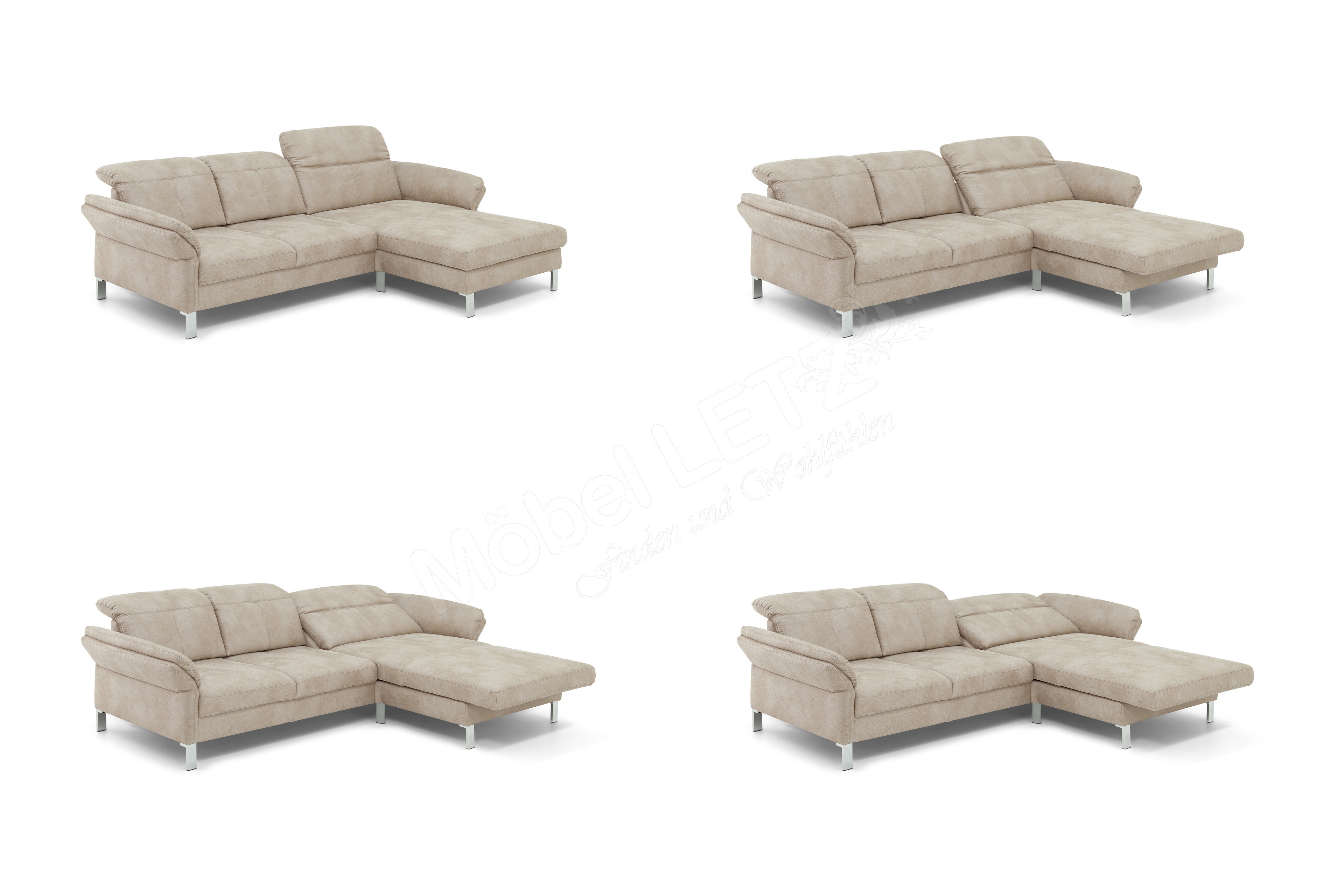 Wenn Sie auf der Suche nach einer zeitlosen Polsterecke sind, dann sind Sie jetzt fündig geworden. Das Modell 1212 aus dem Hause Carina Polstermöbel mit einem großzügigen Stellmaß von ca. 278-296 x 190-212 cm bietet Ihnen ausreichend Platz für gemütliche Abende allein oder mit der ganzen Familie. Genießen Sie neben dem herrlichen Sitzgefühl auch eine ansprechende Optik, hervorgerufen durch einen hellen Microfaserbezug mit edler Kappnaht sowie die dazu stimmigen glänzenden Metallfüße. Das Ecksofa überzeugt mit einer praktischen, komfortablen sowie manuellen Sitztiefen- und Kopfteilverstellung, diese kann selbstverständlich an jedem Sitzplatz separat nach Ihren Belieben angepasst werden. So wird nicht nur der Wohlfühlfaktor erhöht, auch eine zusätzliche Entspannung für Ihre Nackenmuskulatur und eine Unterstützung bei einer wohltuenden Sitzposition sind hier absolut garantiert. Erleben Sie dank einer angenehm festen Tonnnentaschenfederkernpolsterung auf dauerelastischen Stahl-Wellenfedern pure Erholung und einen außergewöhnlichen Komfort. Für weitere Individualtität am Sitzplatz sorgen die beiden klappbaren Armlehnen, welche Sie ganz nach Ihrem Belieben einstellen können. Ein weiteres Highlight ist die motorische Schlaffunktion, welche sich im Longchair versteckt: Per Knopfdruck können Sie die Liegefläche nach vorn gleiten lassen und dabei senkt sich das Rückenteil ab. Diese Funktion bewirkt in Verbindung mit der manuellen Kopfteilverstellung, dass Sie in eine fast waagerechte Schlafposition gelangen. Sie haben eine Frage zu dieser wunderbaren Eckcouch? Unsere freundlichen Einrichtungsberater stehen Ihnen hierbei auch gern beratend zur Seite, kontaktieren Sie uns ganz einfach per Telefon, Kontaktformular oder Live-Chat. 1212 aus dem Hause Carina Polstermöbel – der neue Mittelpunkt in Ihrem Wohnzimmer.