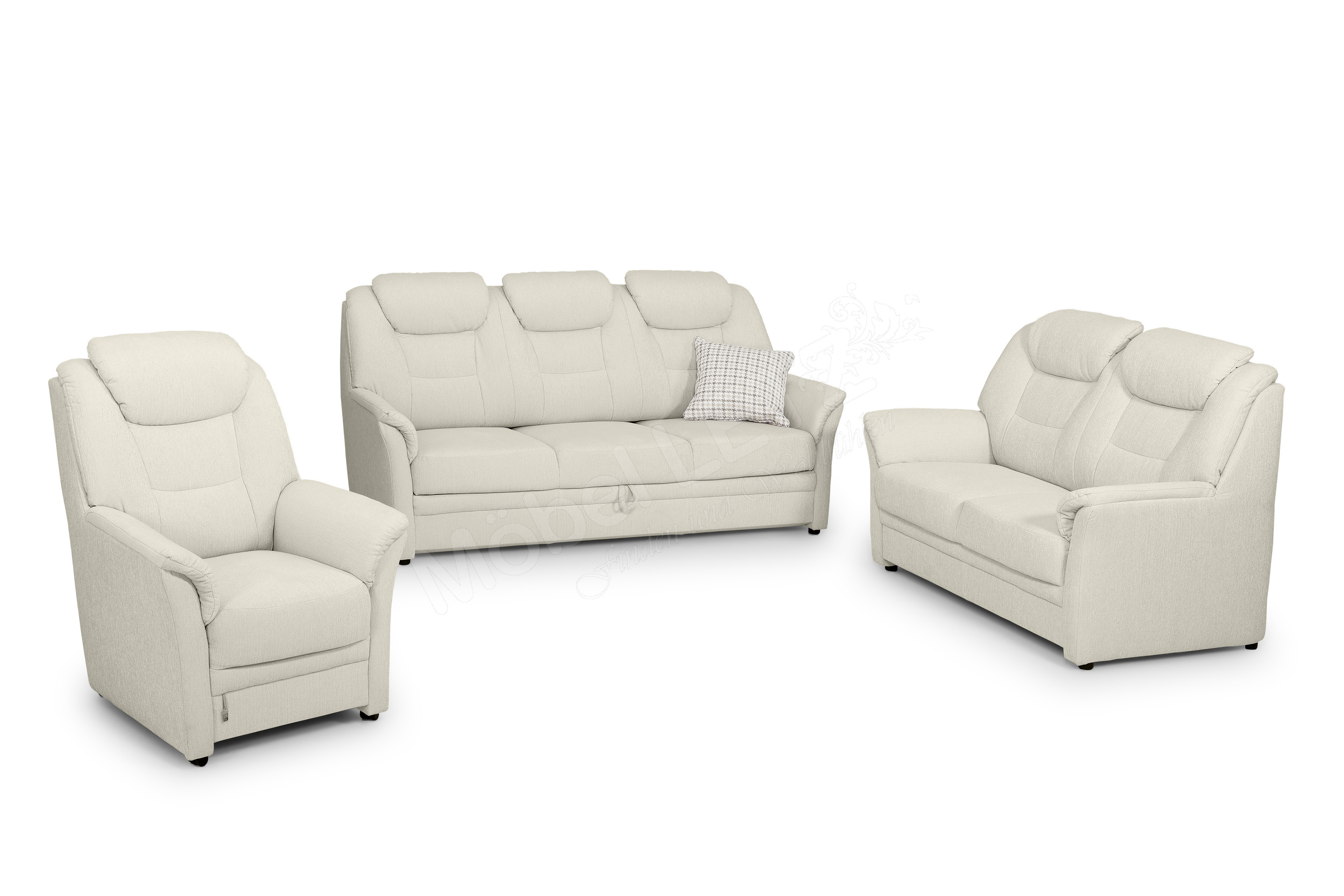 Kiel von Dietsch Polstermöbel – einfach klassisch und komfortabel. Das Polster-Trio aus der Kollektion "Varianta - Uneingeschränkt familientauglich" präsentiert sich im freundlich beigefarbenen Flachgewebe. Bestehend aus einem 3-Sitzer mit einer Breite von etwa 210 cm sowie einem 2-Sitzer der ca. 145 cm breit ist sowie einem passenden Sessel, präsentiert sich das Modell mit ergonomisch geformten Rücken, komfortabler Rückenhöhe und fester Sitzpolsterung. Jeder stellt seine ganz persönlichen Ansprüche an die eigene Couch und den gewünschten Komfort. Dazu tragen auch Alter, Körpergröße und Gewicht bei. Aus diesem Grund überzeugt Kiel neben der festen Sitzpolsterung auch mit einer perfekten Sitzhöhe von ca. 46 cm und einer überaus komfortablen Kopfteilverstellung. Auch eine Vorziehfunktion mit praktischem Bettkasten für den 3-Sitzer sowie das abgebildetet Zierkissen gehöhren zu unserem unschlagbaren Angebot dazu. Dietsch stellt seine Polstergarnituren zu 100 % in Deutschland her und steht somit für beste Verarbeitung deutscher Qualität. Zögern Sie also nicht und bereichern Sie Ihren Wohnraum mit Kiel aus dem Hause Dietsch Polstermöbel.