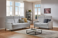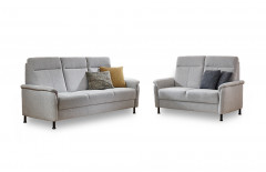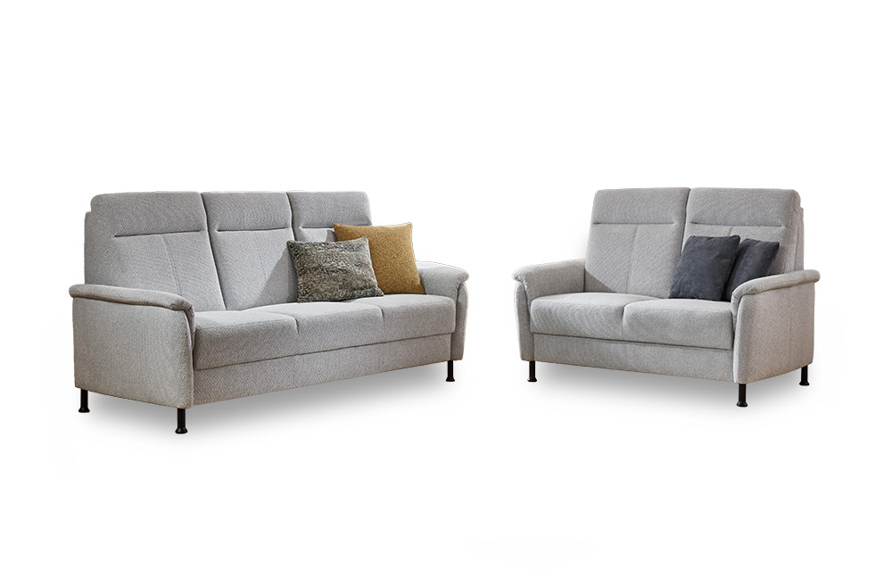 Zeitlose Eleganz trifft auf modernen Komfort – hier präsentiert sich Ihre neue Wohlfühlgarnitur aus dem Hause Dietsch Polstermöbel: Modell Porto. Dieses stilvolle Polster-Duo aus der Kollektion "Varianta - Uneingeschränkt familientauglich." vereint klare Linienführung mit erstklassiger Sitzqualität und wird so zum Herzstück Ihres Wohnzimmers. Die Zusammenstellung aus einem ca. 215 cm breiten 3-Sitzer sowie einem 2-Sitzer, welcher über eine Breite von etwa 155 cm verfügt, überzeugt durch eine ruhige Ausstrahlung und fügt sich mühelos in unterschiedlichste Einrichtungsstile ein. Der hochwertige, hellgraue Bezugsstoff verleiht der Garnitur eine freundliche und einladende Optik, während die angenehm gepolsterten Rücken- sowie Sitzflächen für ein entspanntes Sitzerlebnis sorgen. Die dezent abgerundeten Armlehnen sowie die schwarzen Metallfüße setzen elegante Akzente und unterstreichen das zeitgemäße Design. Ob gesellige Abende mit Familie, Freunden oder entspannte Stunden allein – Porto bietet Ihnen den perfekten Ort zum Ankommen und Abschalten. Die durchdachte Ergonomie unterstützt eine gesunde Sitzhaltung, während die langlebige Verarbeitung die gewohnt hohe Dietsch-Qualität widerspiegelt. Mit dem optional erhältlichen, passenden Sessel können Sie mit wenigen Klick aus dem Duo sogar ein Trio zaubern. Vielleicht darf es noch ein passender Hocker sein – auch das ist kein Problem, diesen finden Sie, in zwei verschiedenen Ausführungen, ebenfalls unter unseren Zusatzoptionen. Dekorative, zusätzlich erhältliche Zierkissen in unterschiedlichen Größen sowie Ausführungen steigern den Kuschelfaktor und setzen zudem hinreißende farbliche Akzente. Zögern Sie nicht und verleihen Sie mit dem exklusiven Modell Porto von Dietsch Ihrem Zuhause ein stilvolles sowie gemütliches Ambiente.